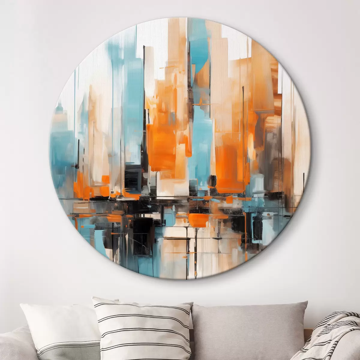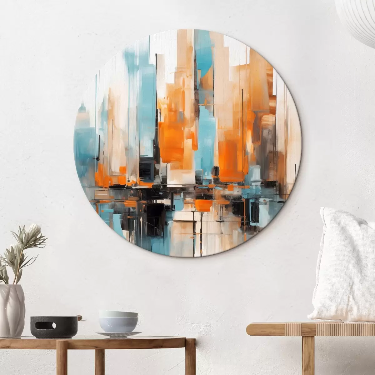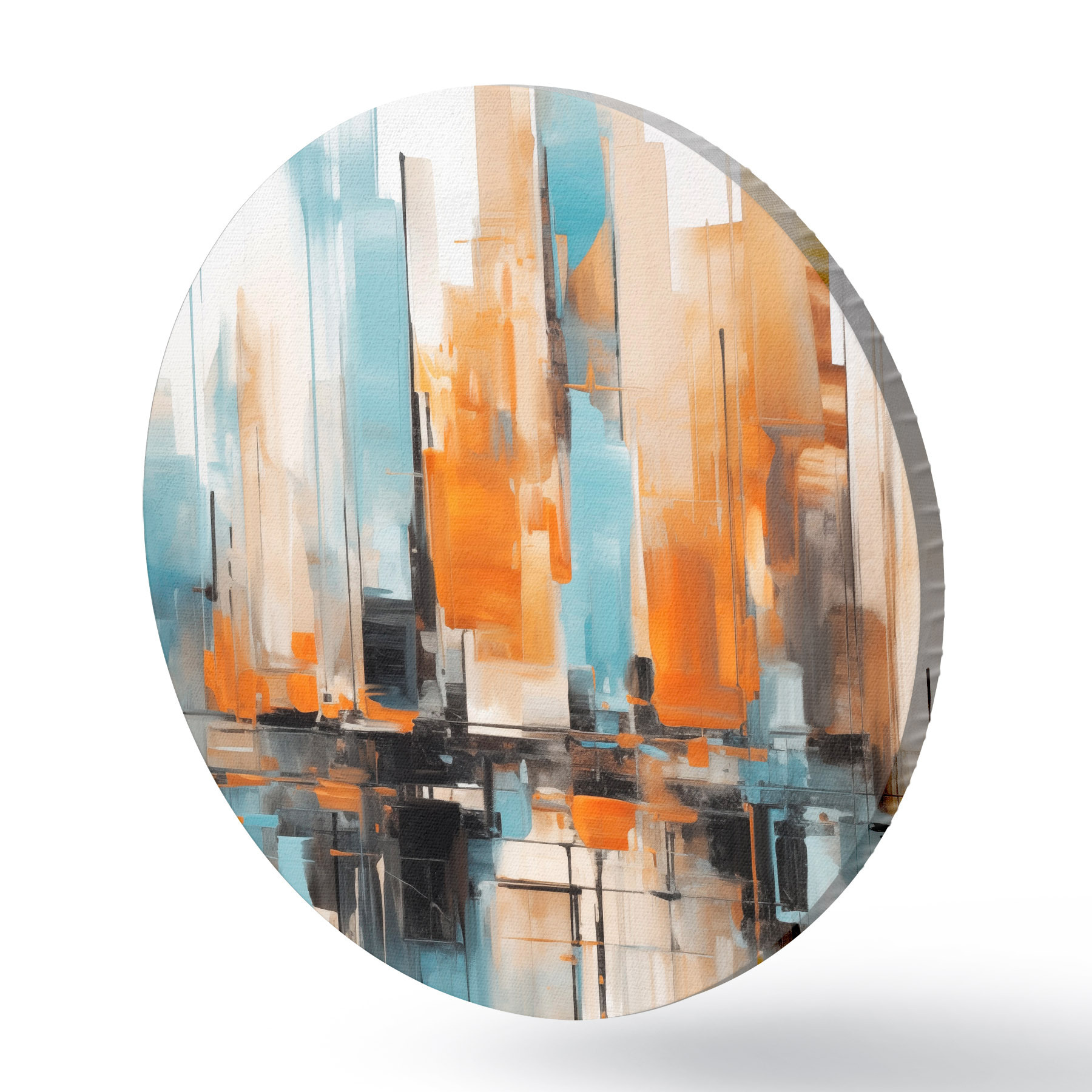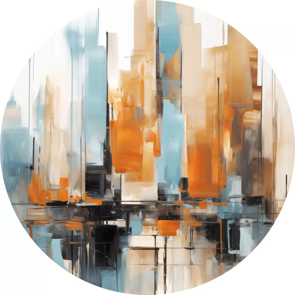 Apaļas gleznas Abstrakts pilsētas skats ar vertikāliem otu triepieniem oranžos, zilos un baltos toņos, glezniecības stils r46267