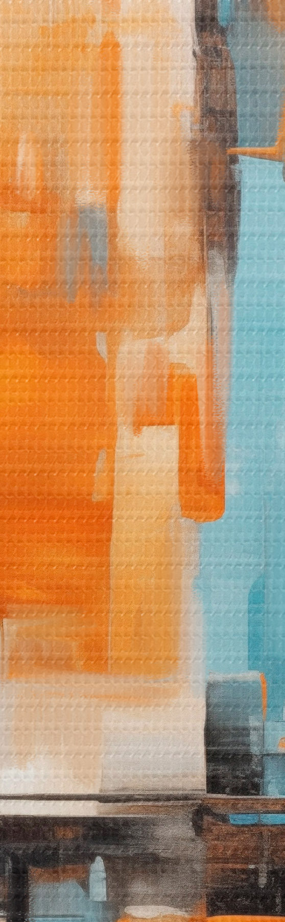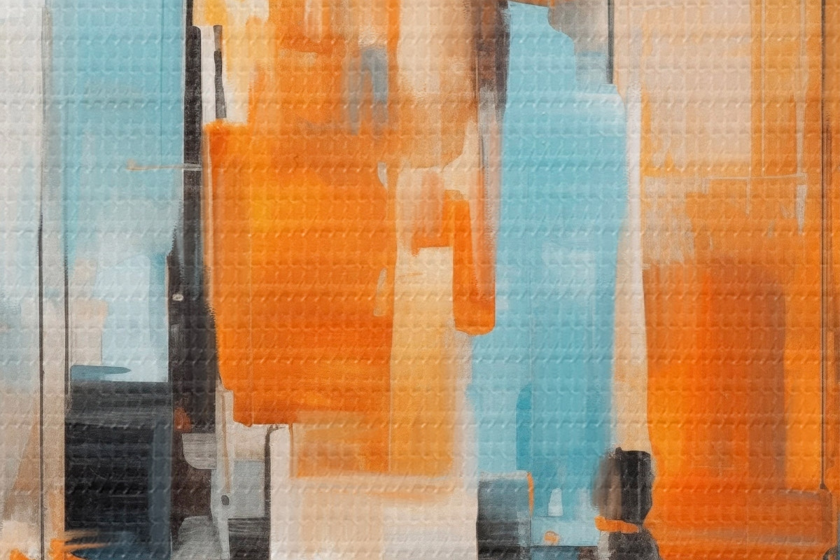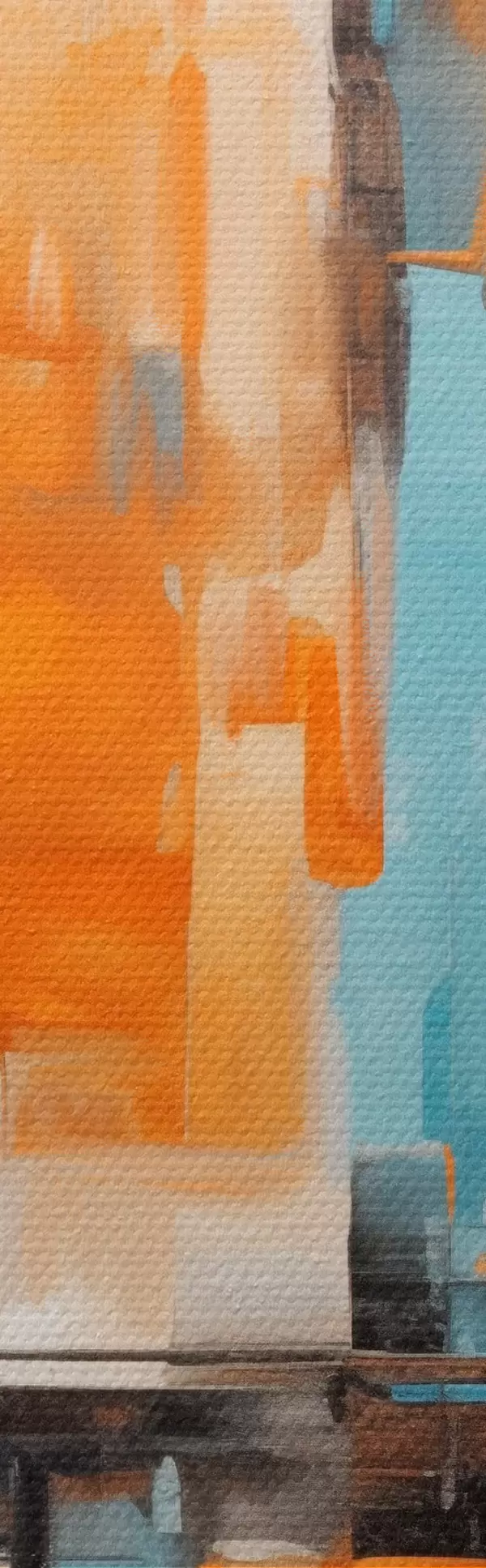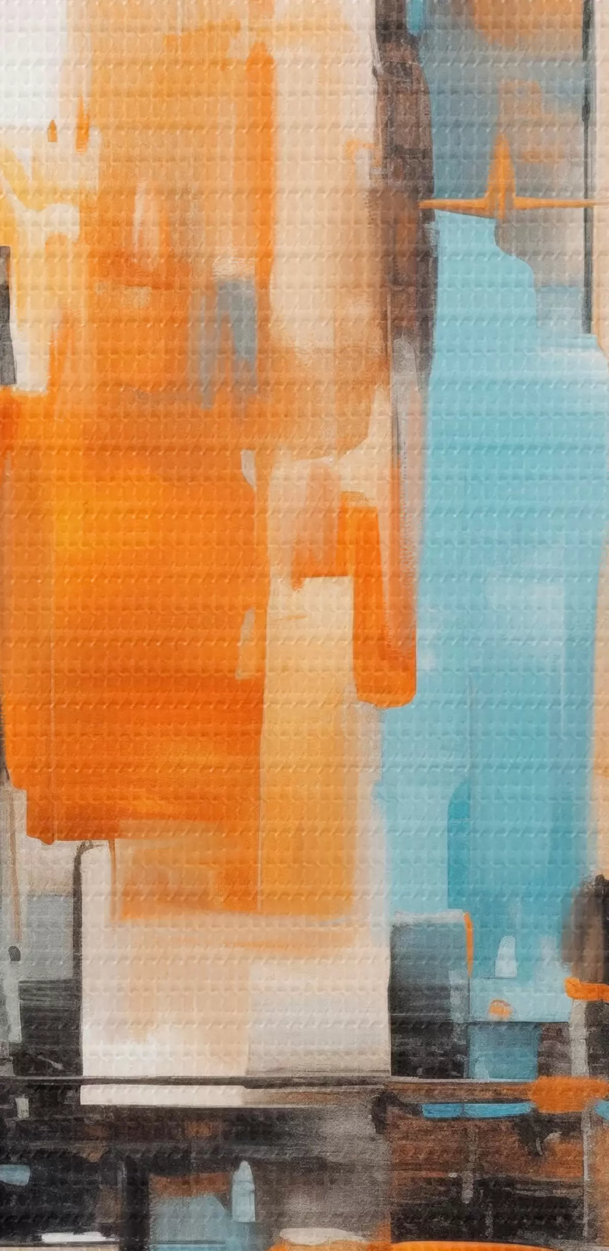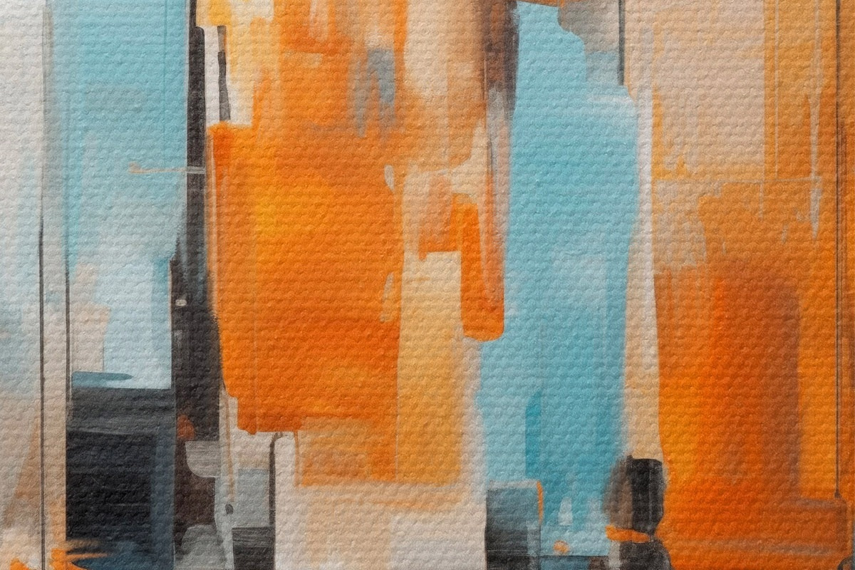 Attēls Abstrakts pilsētas skats ar vertikāliem otu triepieniem oranžos, zilos un baltos toņos, glezniecības stils Nr r46267