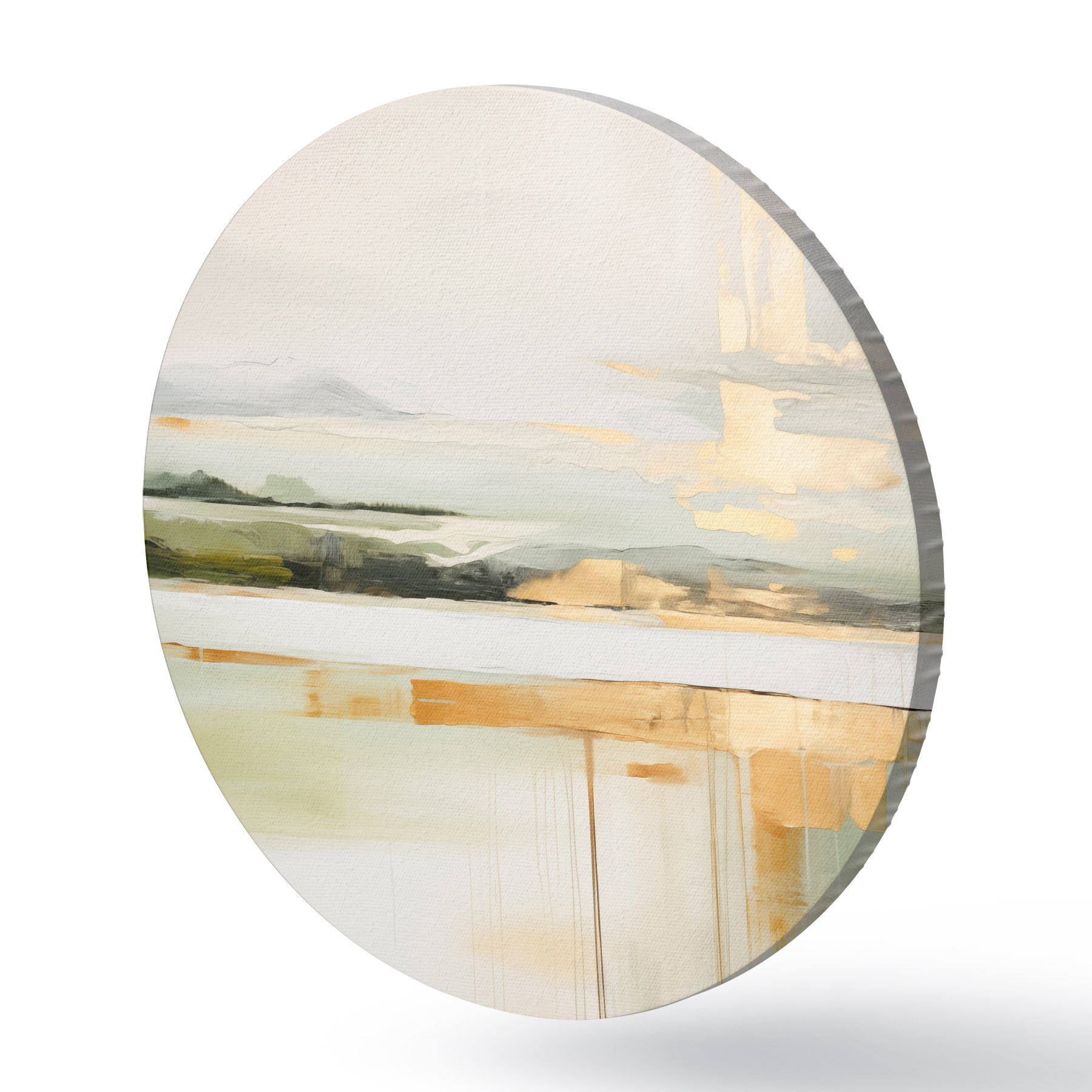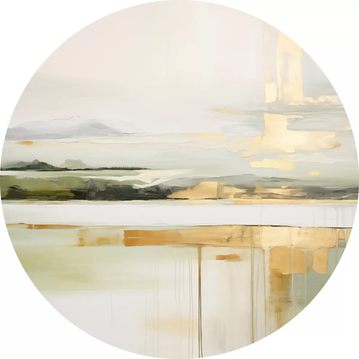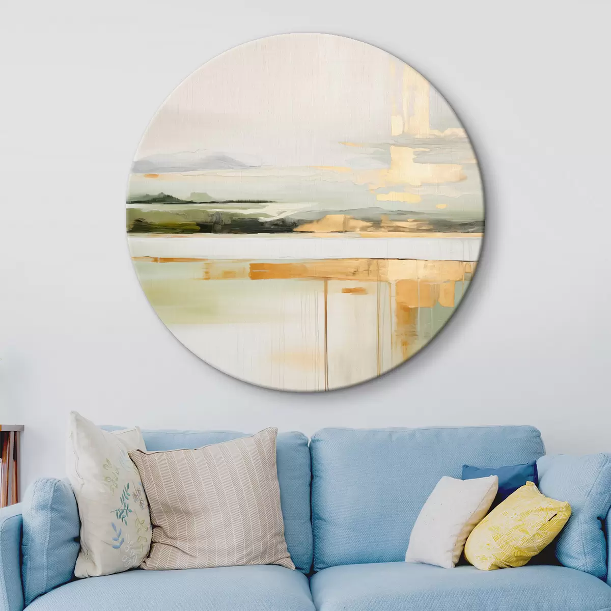 Apaļas gleznas Abstrakts ainavas attēls ar dzelteniem akcentiem, minimālistiska zemes, ūdens un debesu kompozīcija ar klusinātiem toņiem r46268