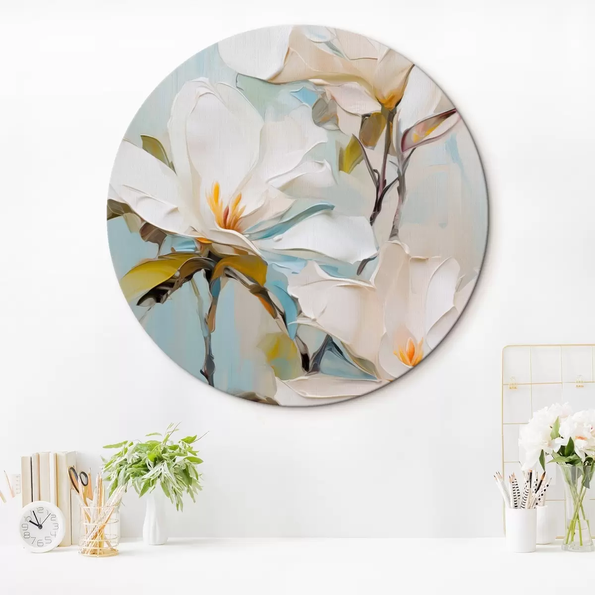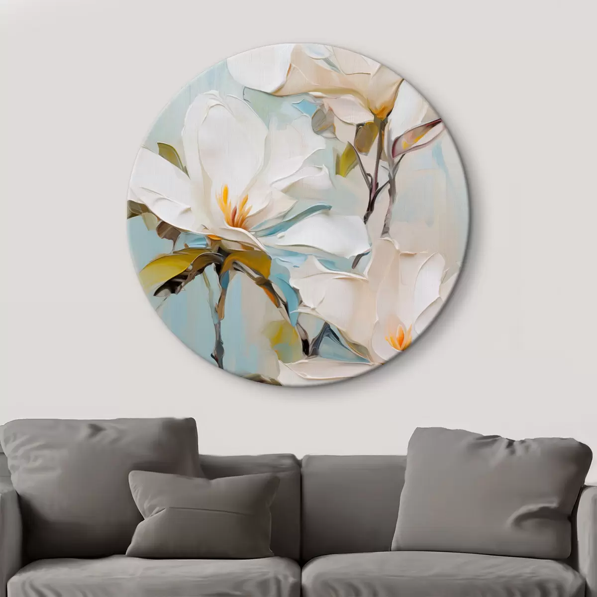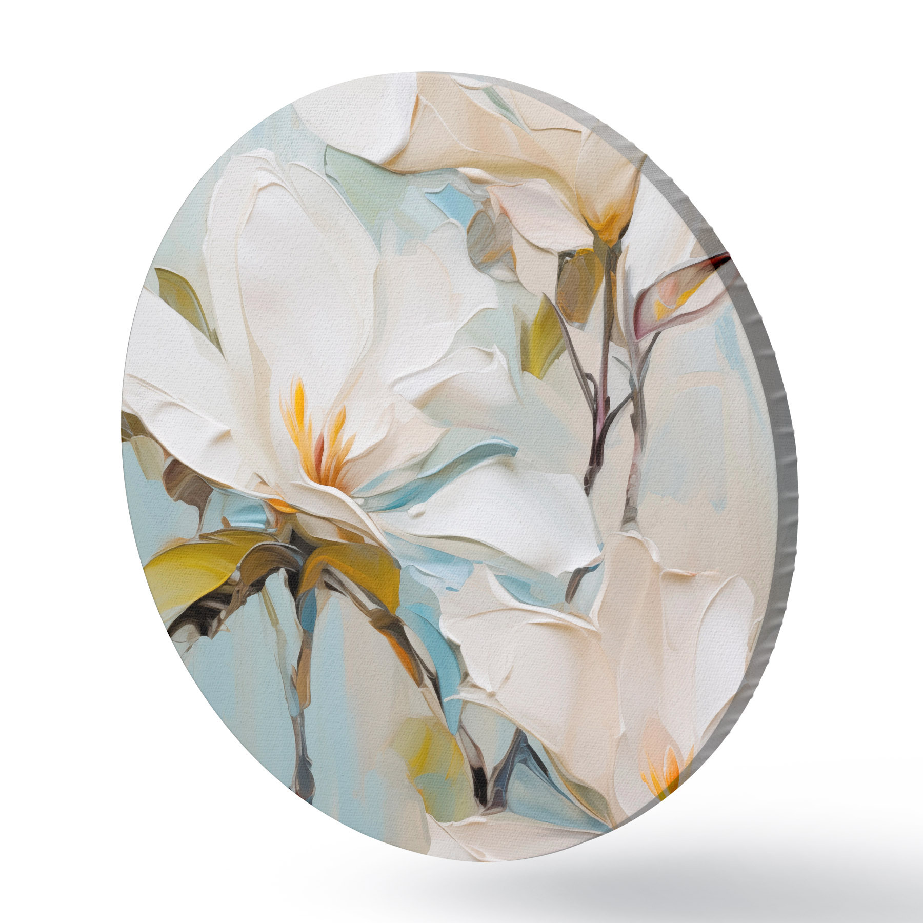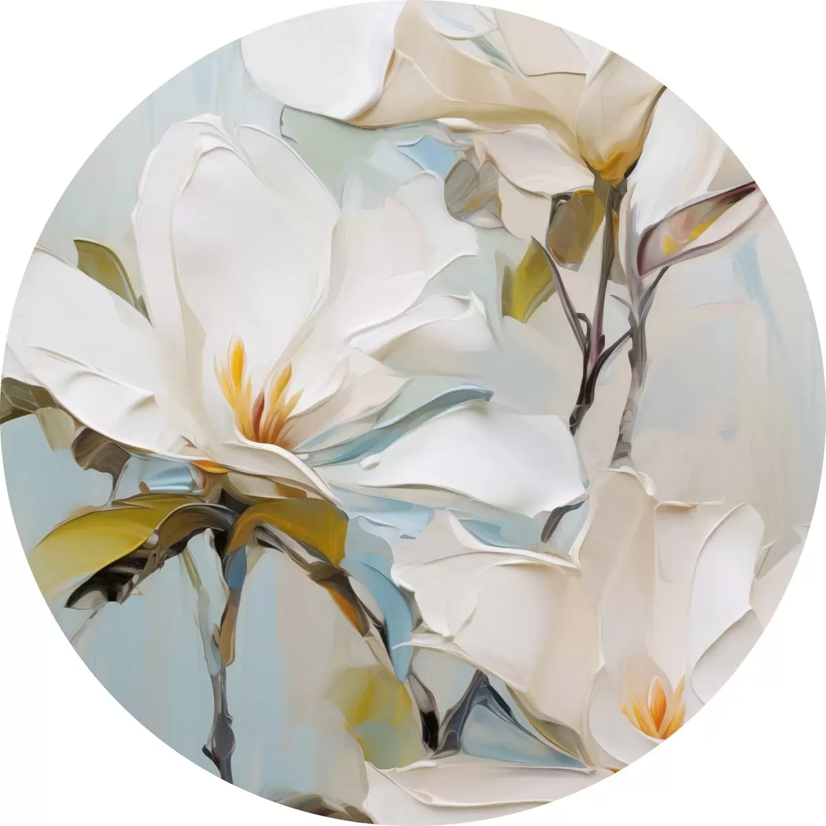Apaļas gleznas Baltas magnolijas ziedi, gaiši zils fons ar maigām otu triepienu līnijām, eļļas glezna, impasto tekstūra r46276