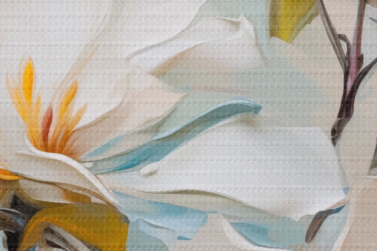 Attēls Baltas magnolijas ziedi, gaiši zils fons ar maigām otu triepienu līnijām, eļļas glezna, impasto tekstūra Nr r46276