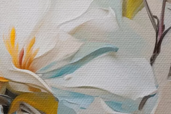 Attēls Baltas magnolijas ziedi, gaiši zils fons ar maigām otu triepienu līnijām, eļļas glezna, impasto tekstūra Nr r46276