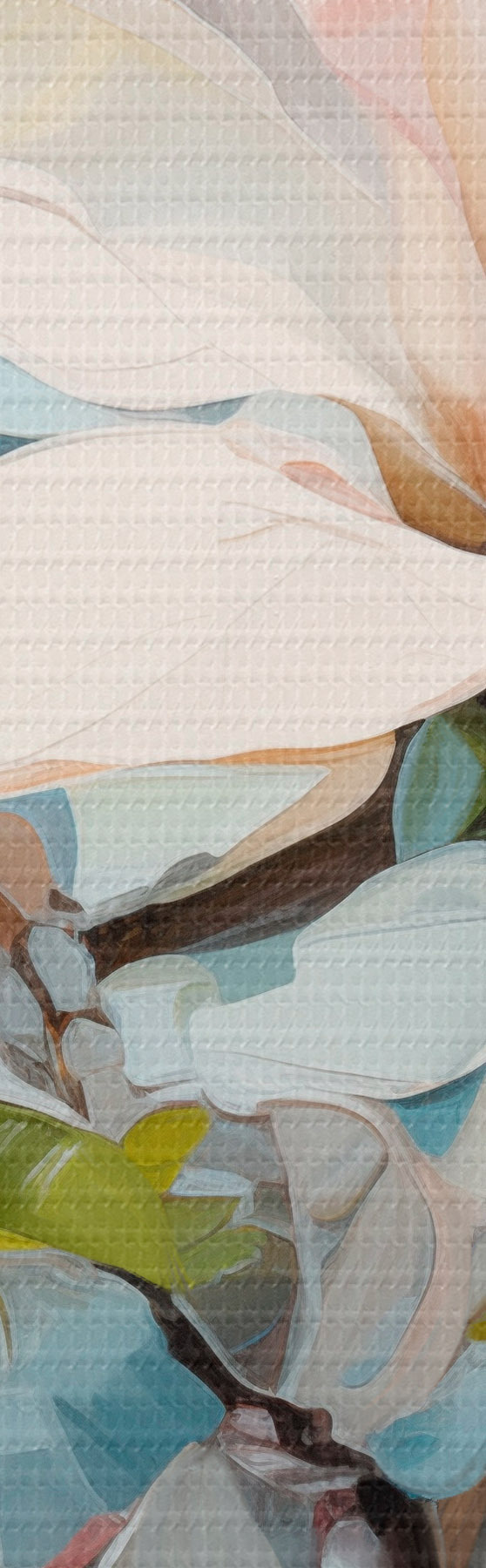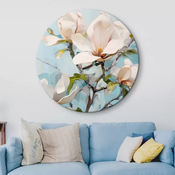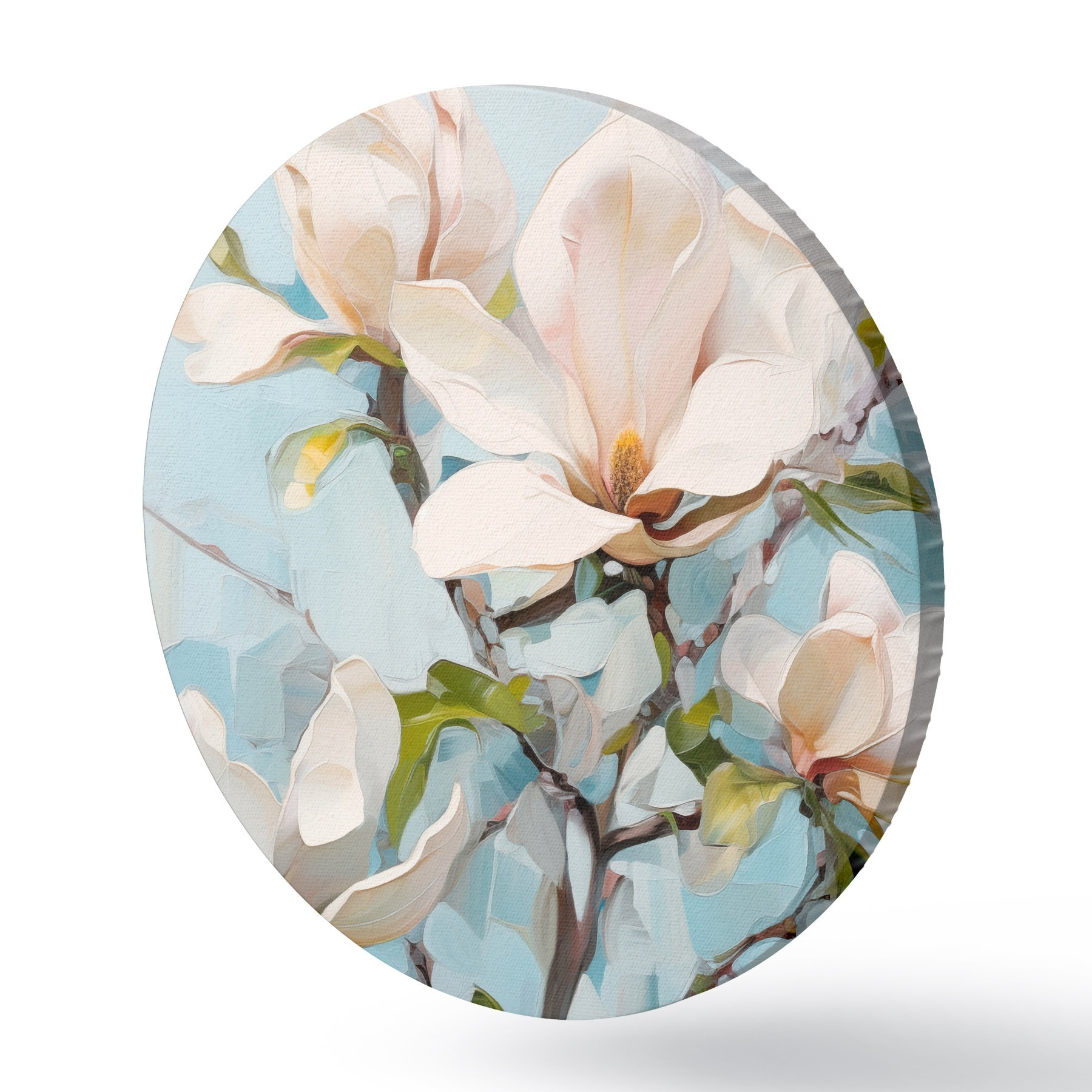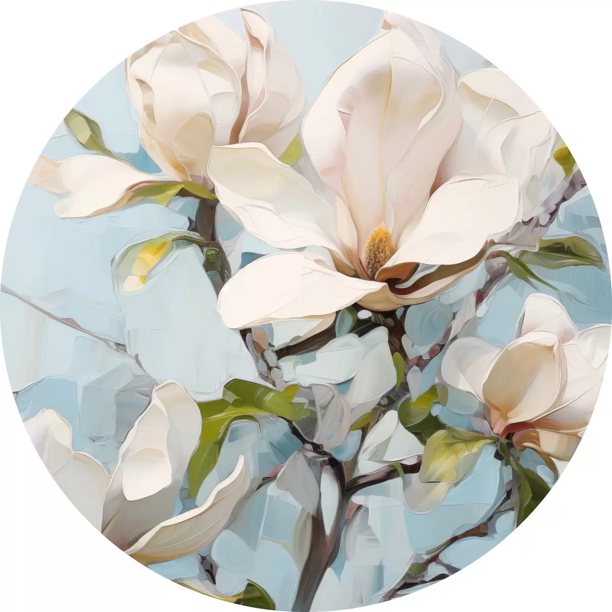 Apaļas gleznas Baltas magnolijas ziedi, gaiši zils fons ar maigām otu triepienu līnijām, eļļas glezna, impasto tekstūra r46277