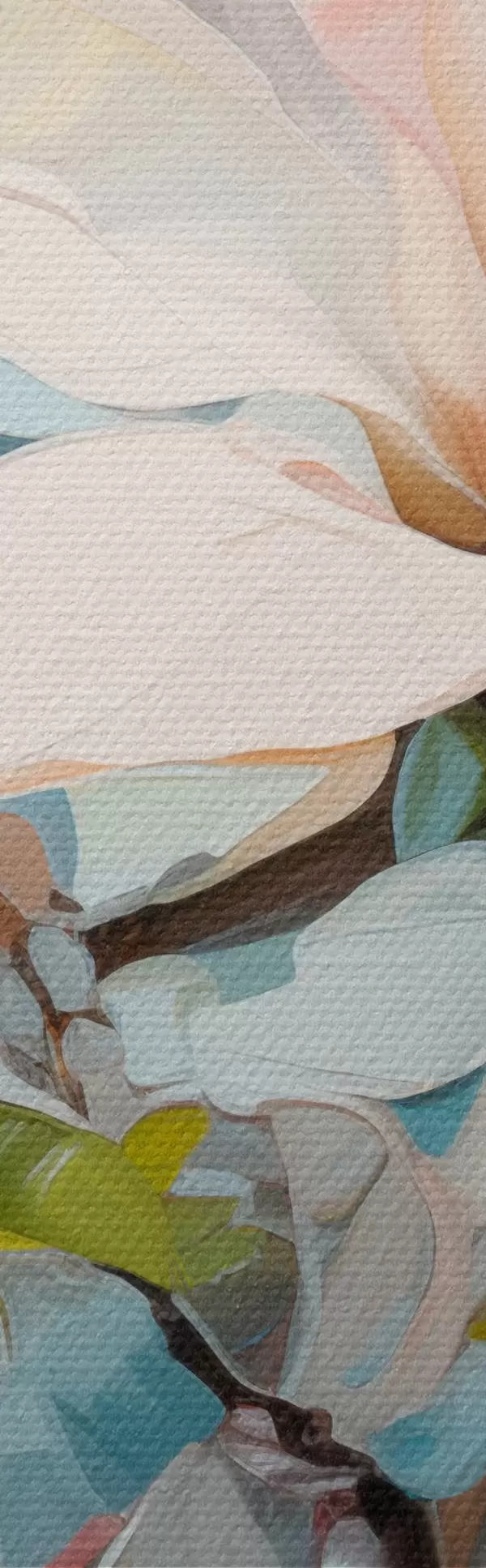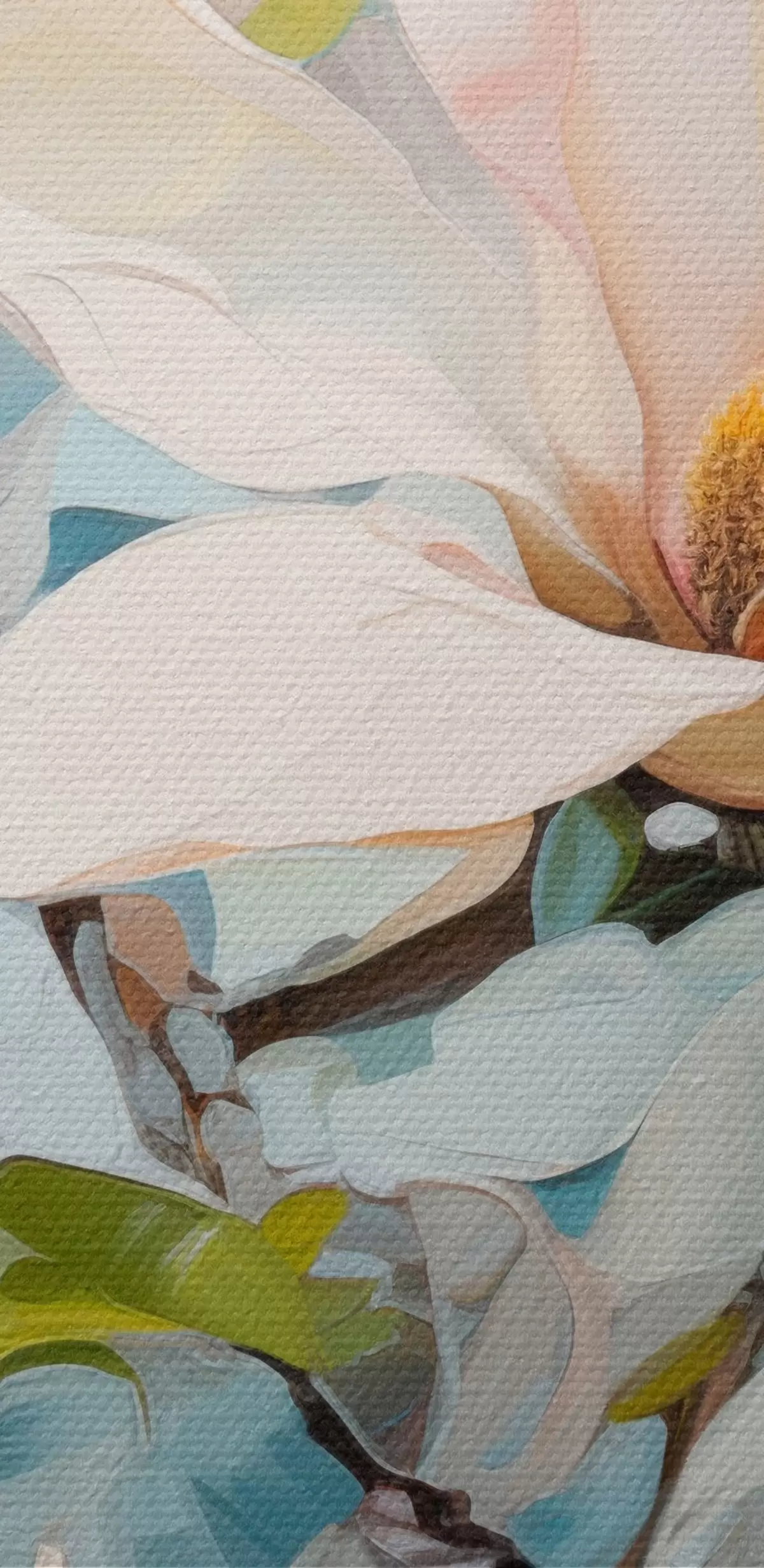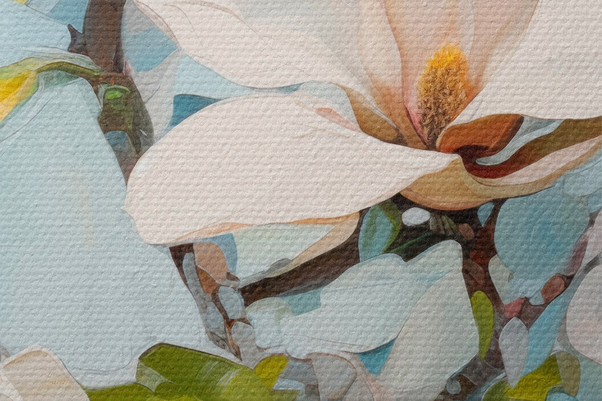 Attēls Baltas magnolijas ziedi, gaiši zils fons ar maigām otu triepienu līnijām, eļļas glezna, impasto tekstūra Nr r46277