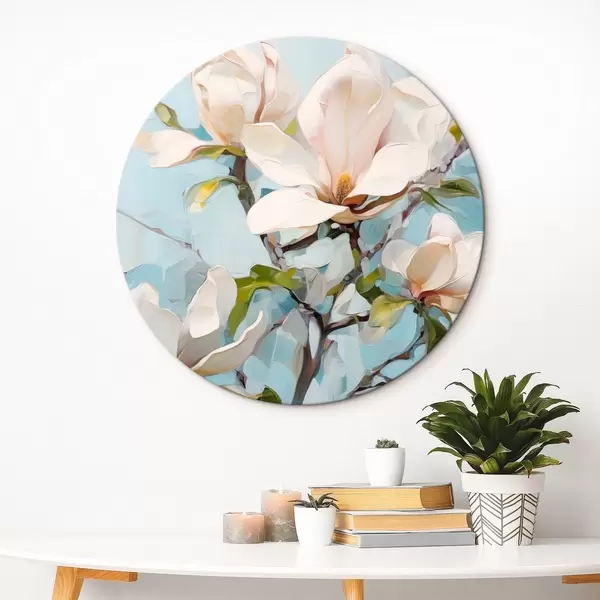 Apaļas gleznas Baltas magnolijas ziedi, gaiši zils fons ar maigām otu triepienu līnijām, eļļas glezna, impasto tekstūra r46277