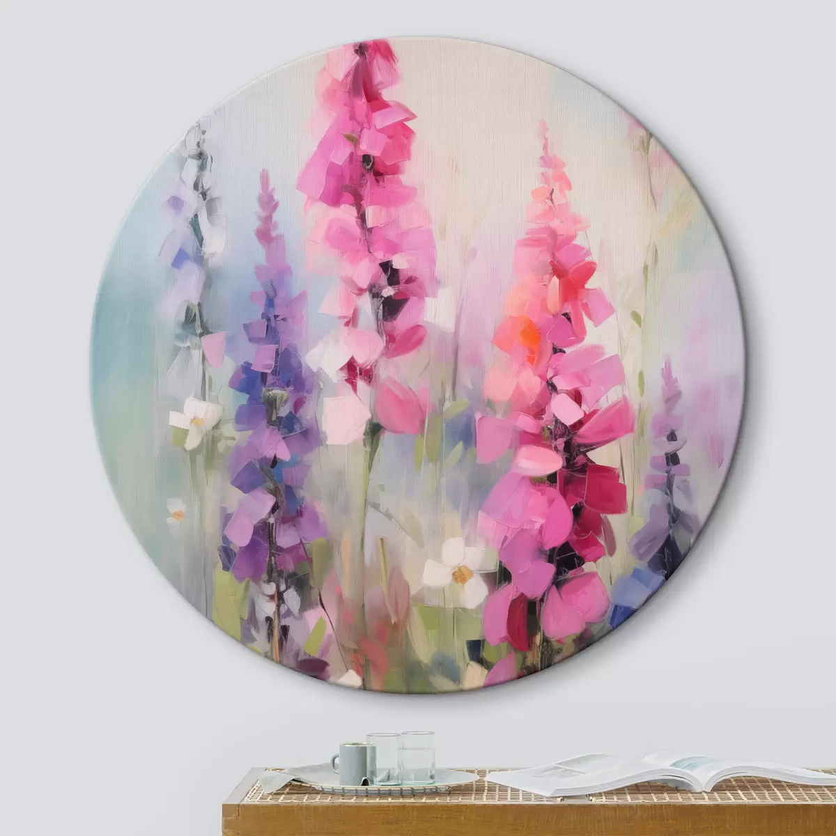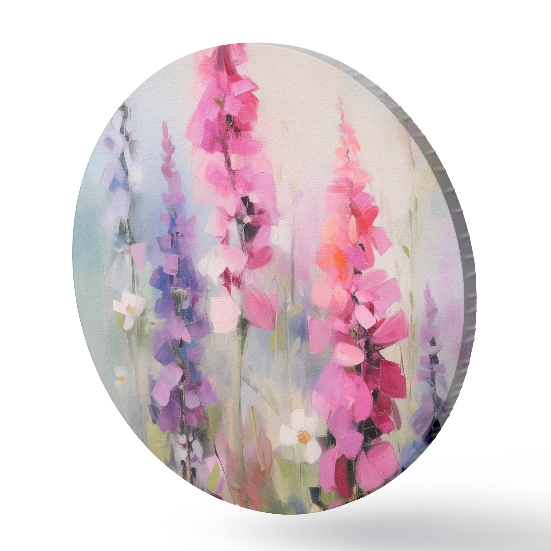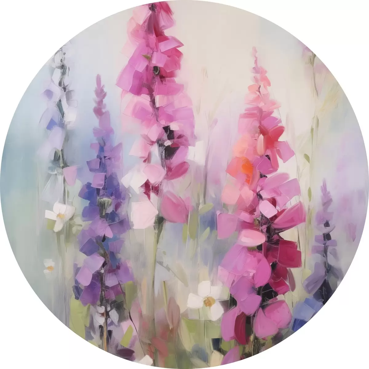 Apaļas gleznas Rozā un violeti ziedi ar baltām margarītēm laukā, maigi otu triepieni, pasteļtoņi, impresionisma stils r46279