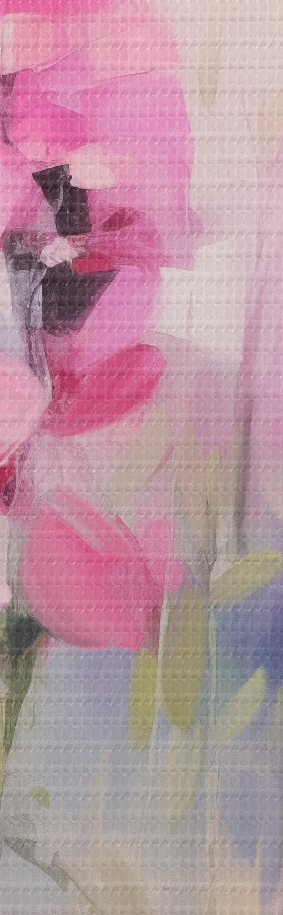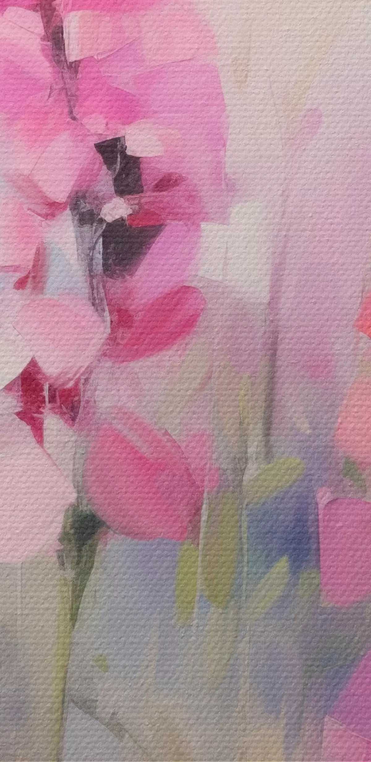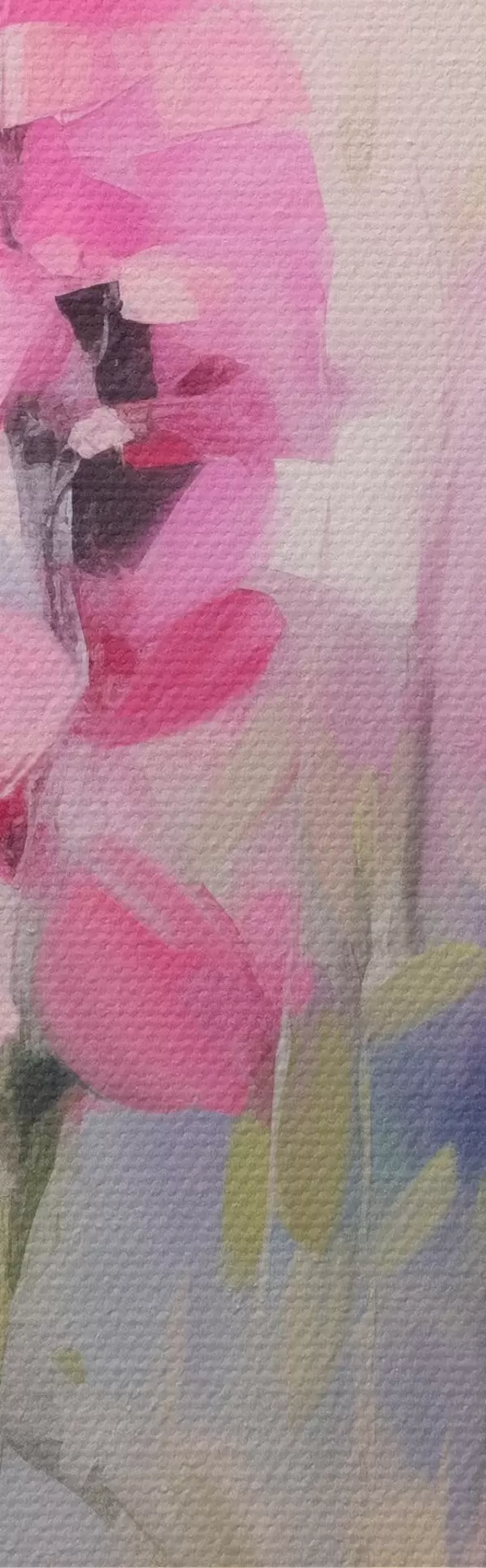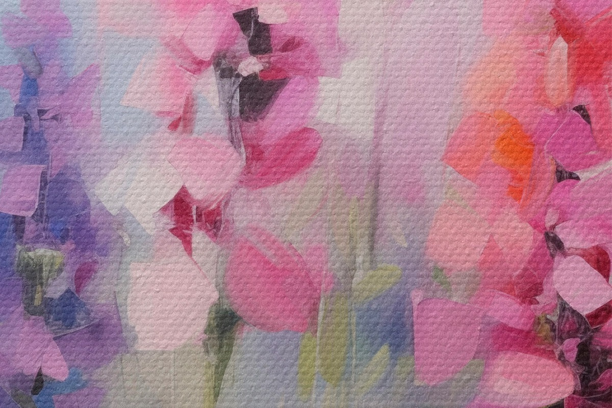 Attēls Rozā un violeti ziedi ar baltām margarītēm laukā, maigi otu triepieni, pasteļtoņi, impresionisma stils Nr r46279