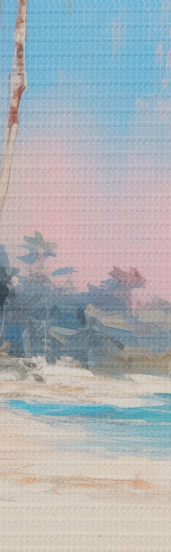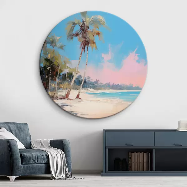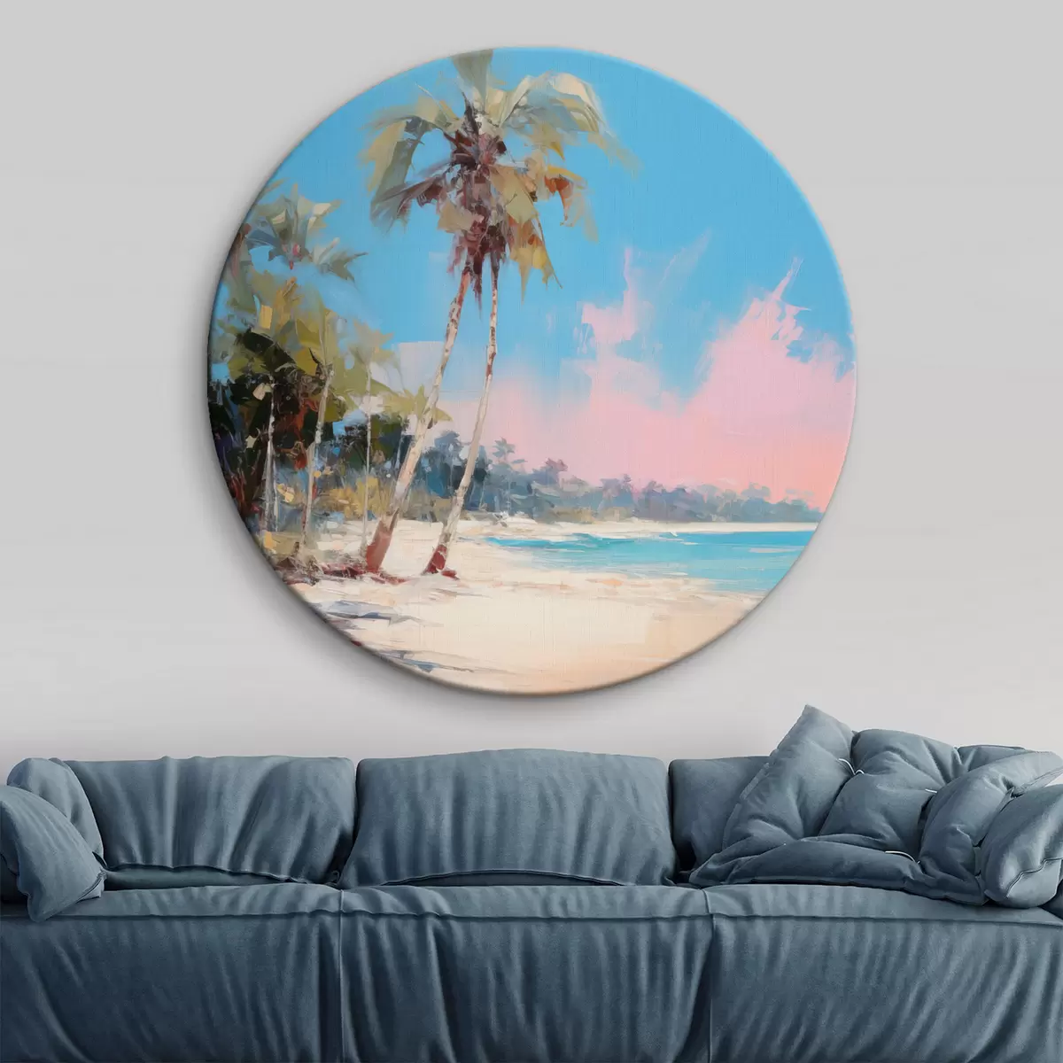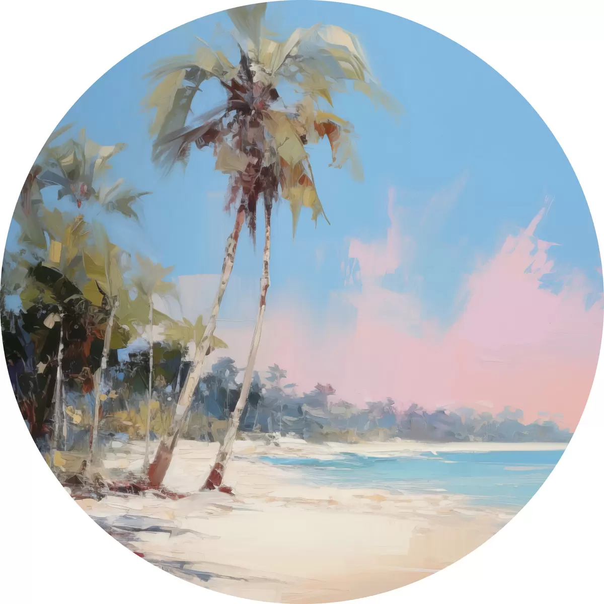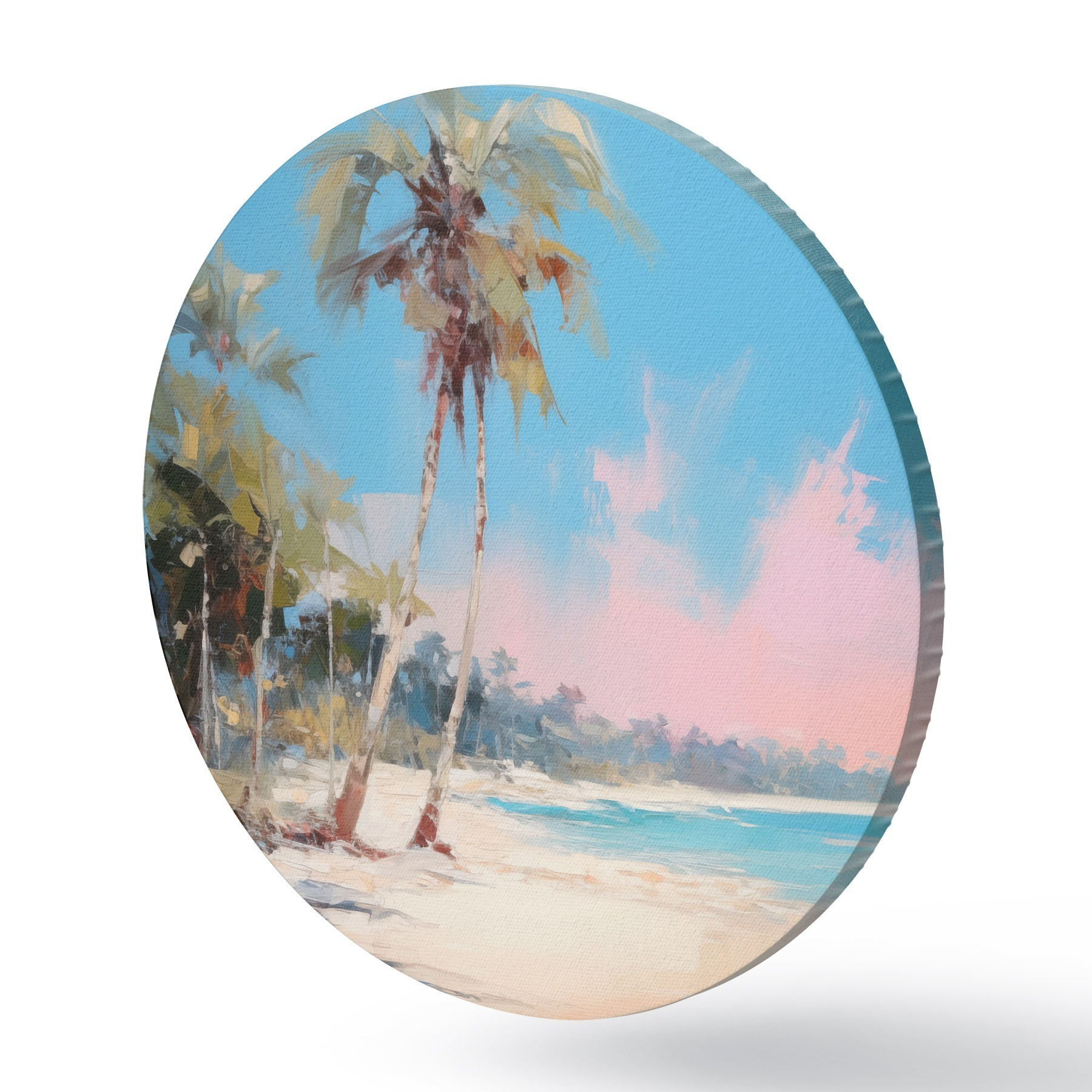 Apaļas gleznas Abstrakta tropu pludmale ar balto smilti un palmu kokiem, zils debesis ar baltiem mākoņiem r46285