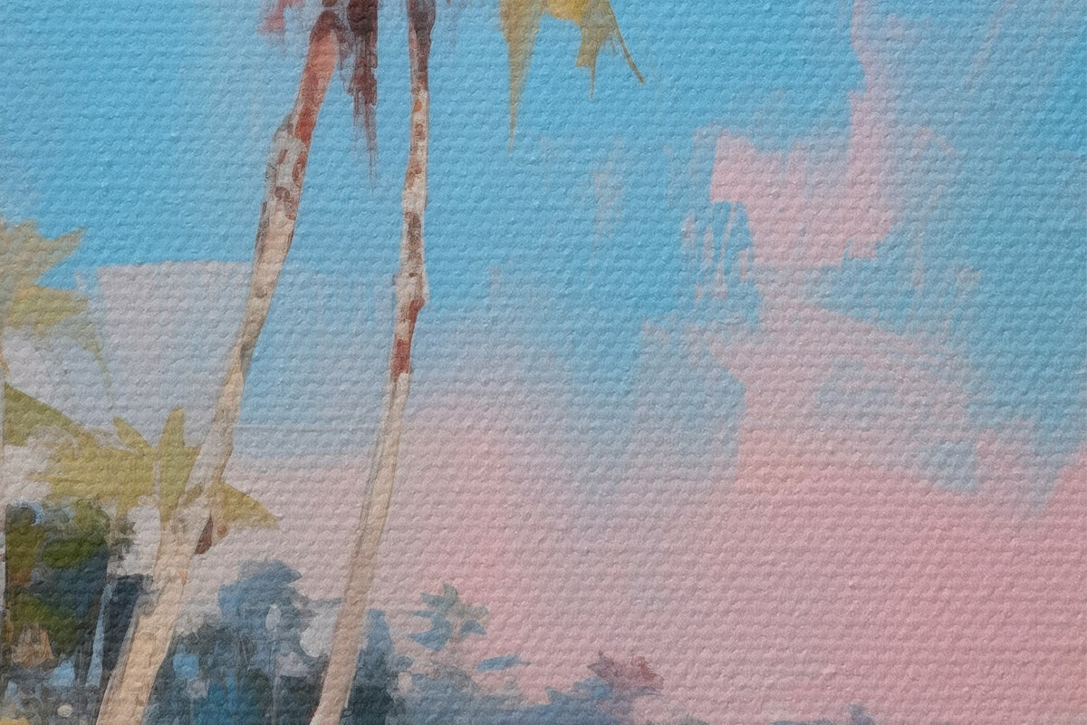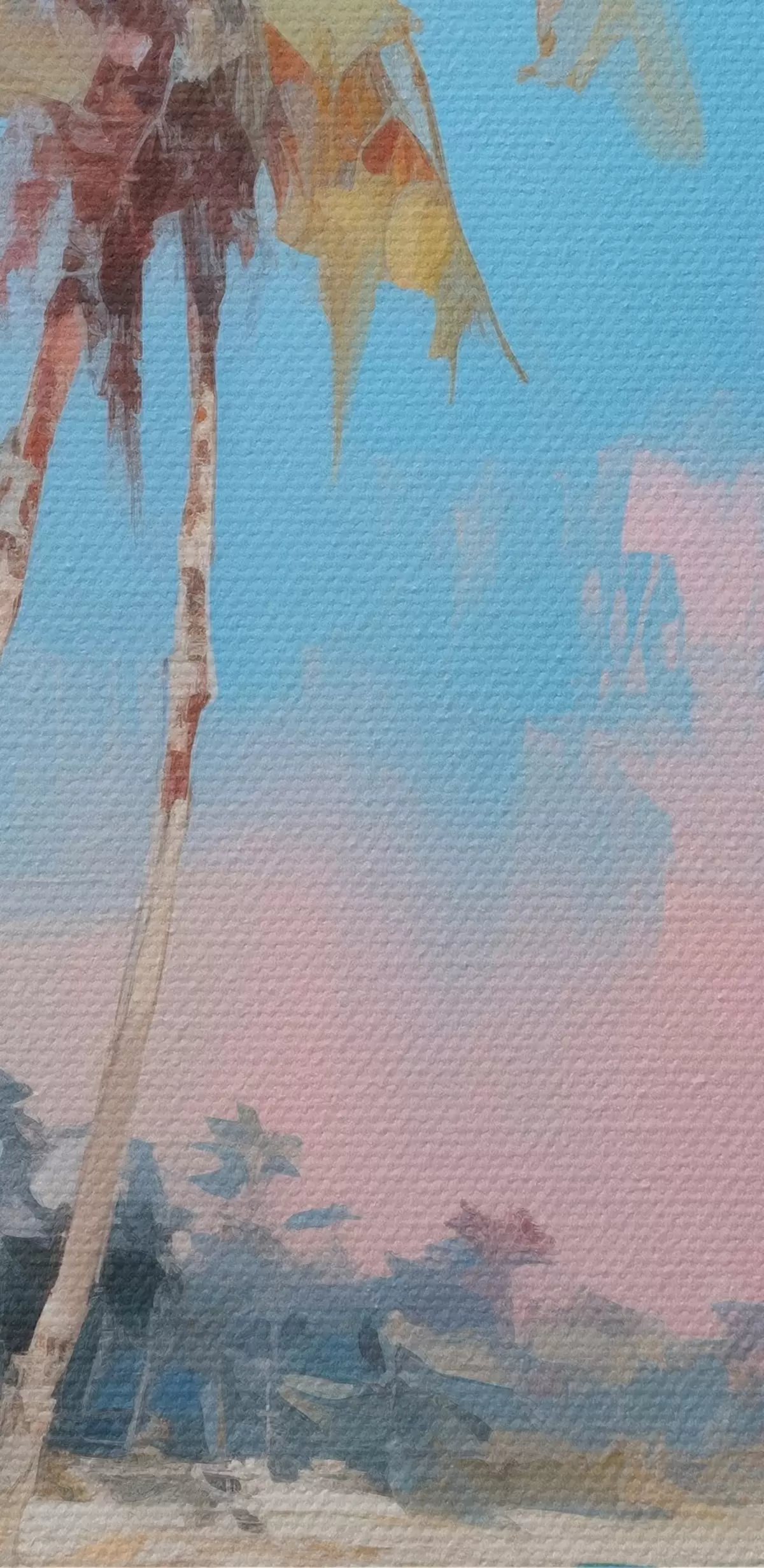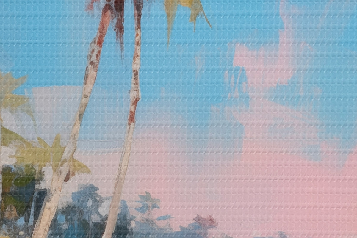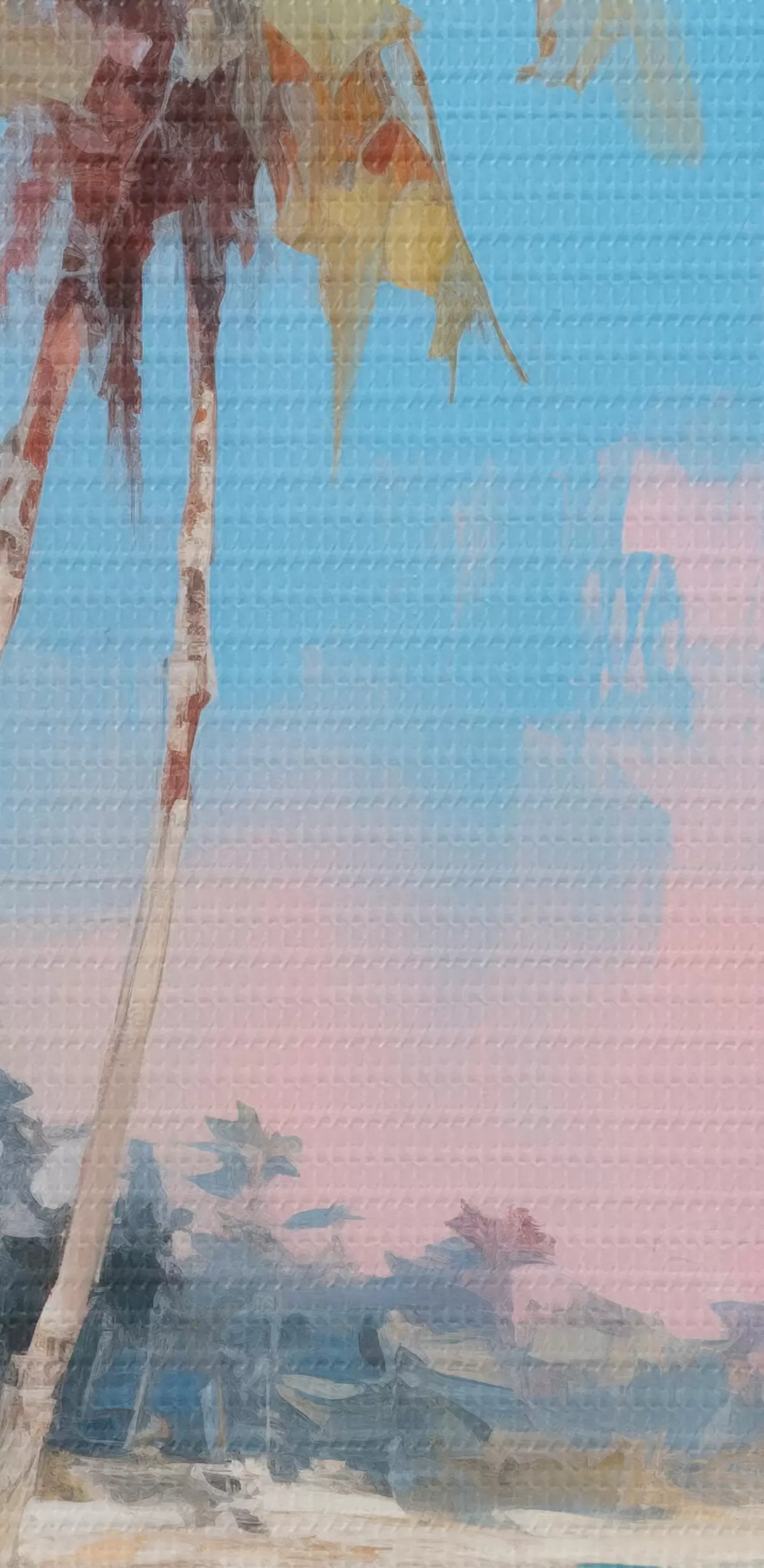 Apaļas gleznas Abstrakta tropu pludmale ar balto smilti un palmu kokiem, zils debesis ar baltiem mākoņiem r46285
