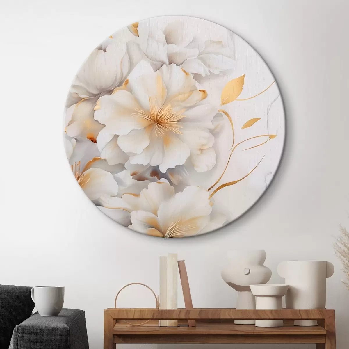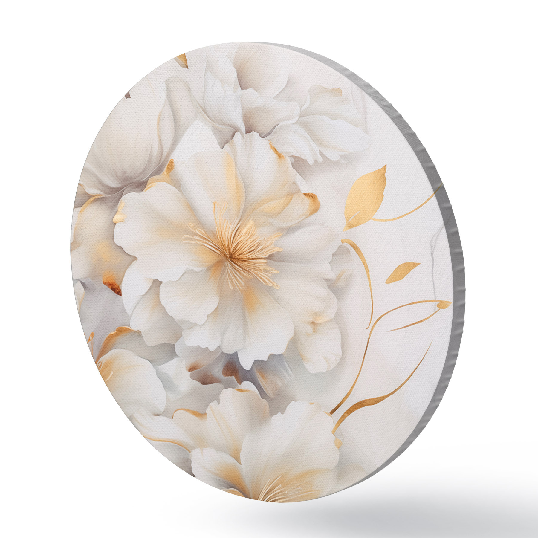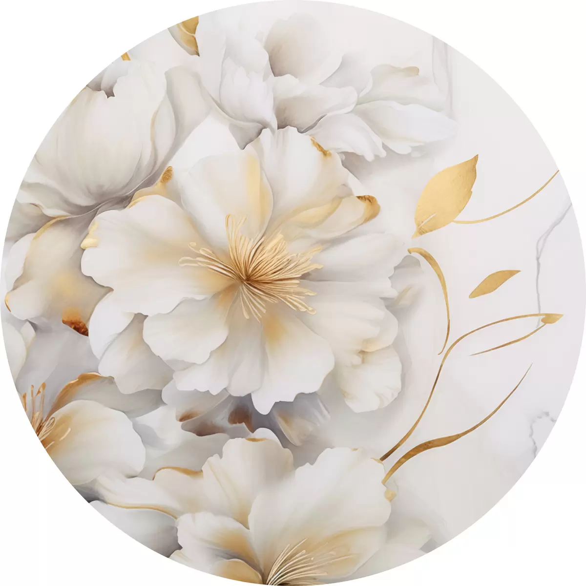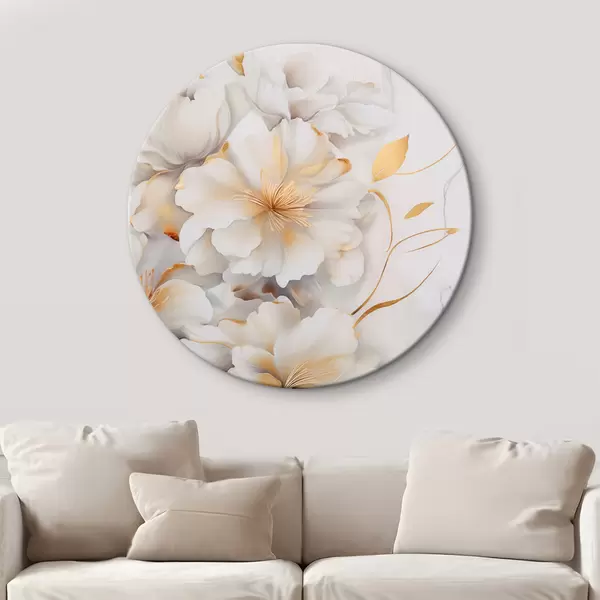 Apaļas gleznas Baltas ziedi ar dzelteniem akcentiem, ziedlapiņas ar smalkiem ēnām, gaišs fons ar smalku marmora efektu r46292