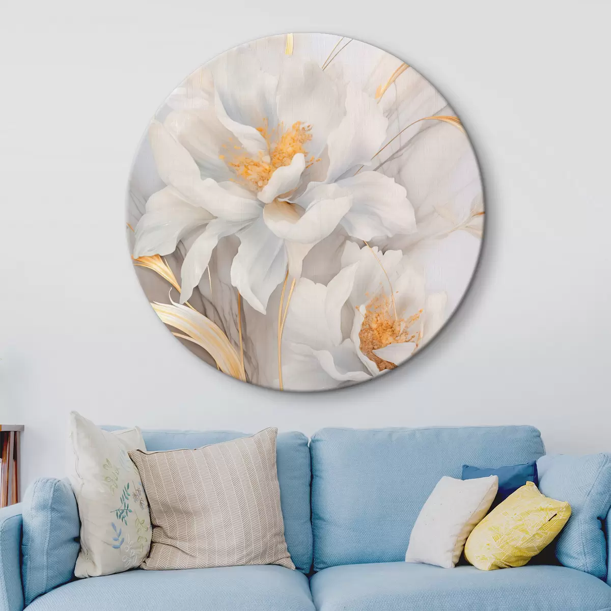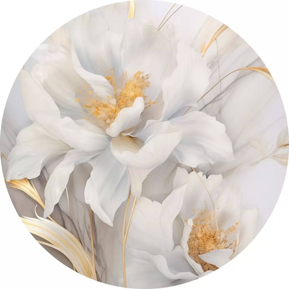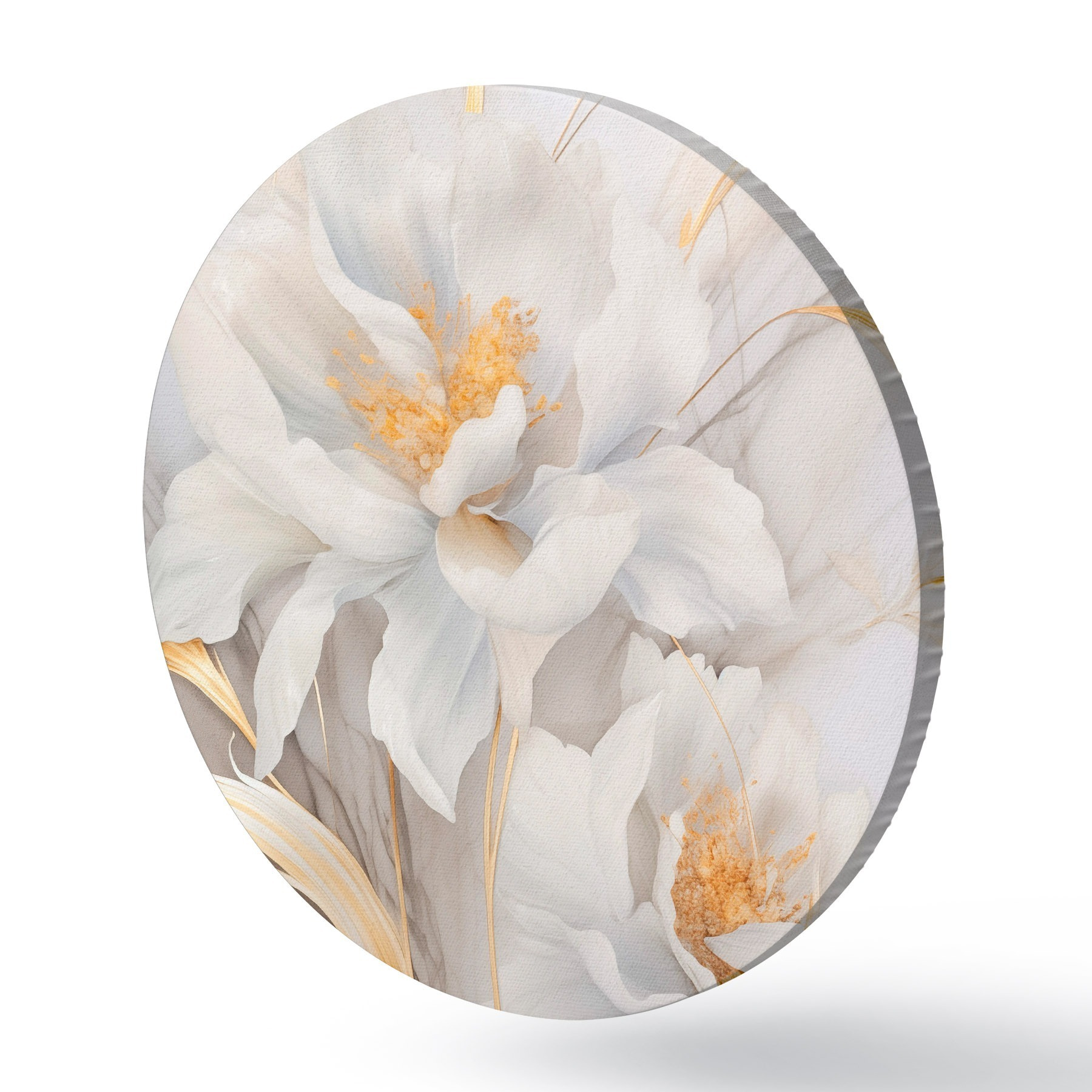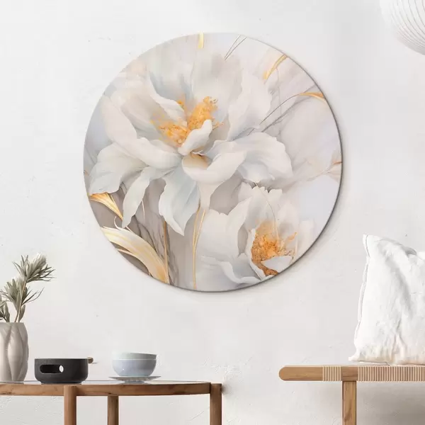 Apaļas gleznas Baltas ziedi ar dzelteniem pistilām un kātiņiem, maigi ziedlapiņas, elegants kompozīcija, neitrāls fons r46293