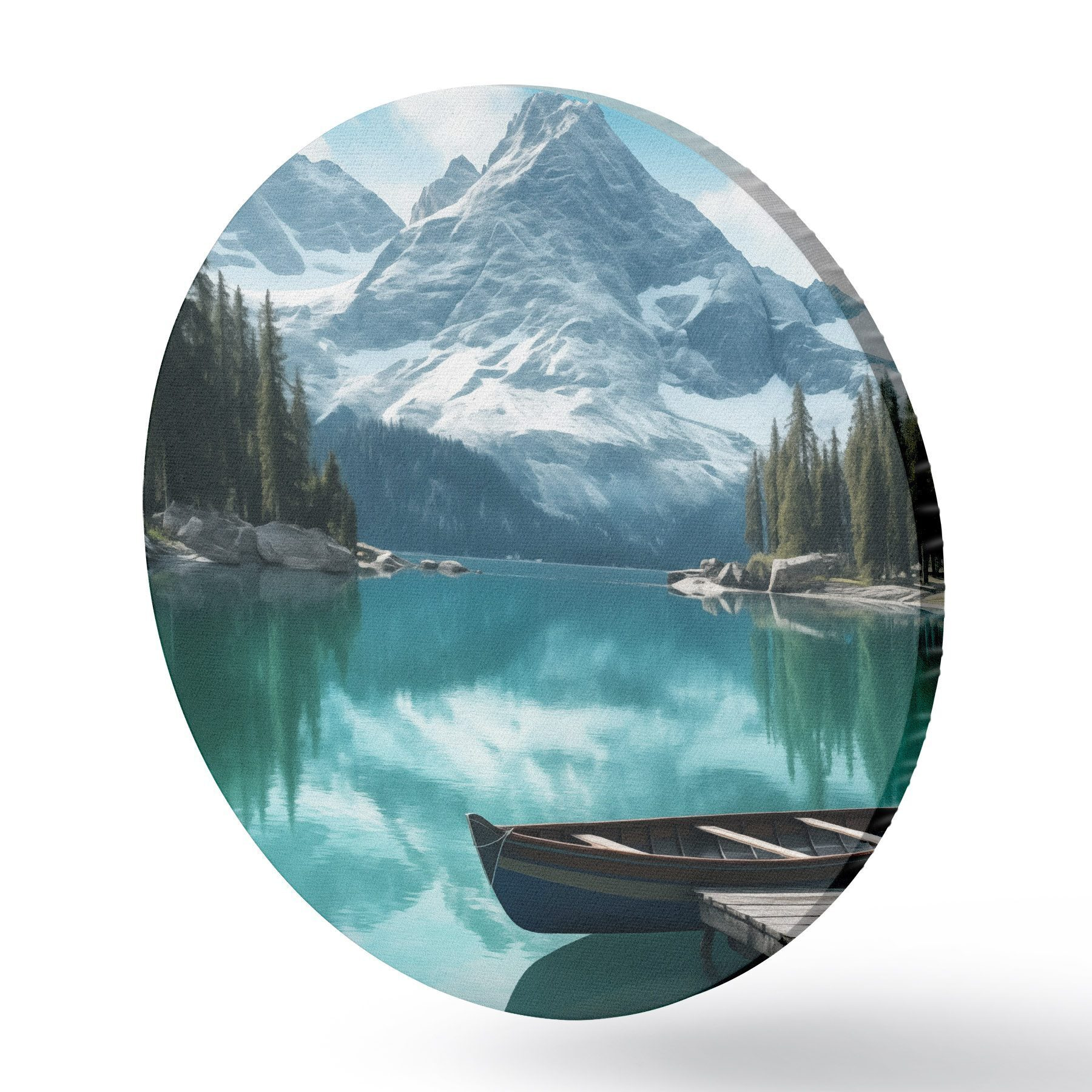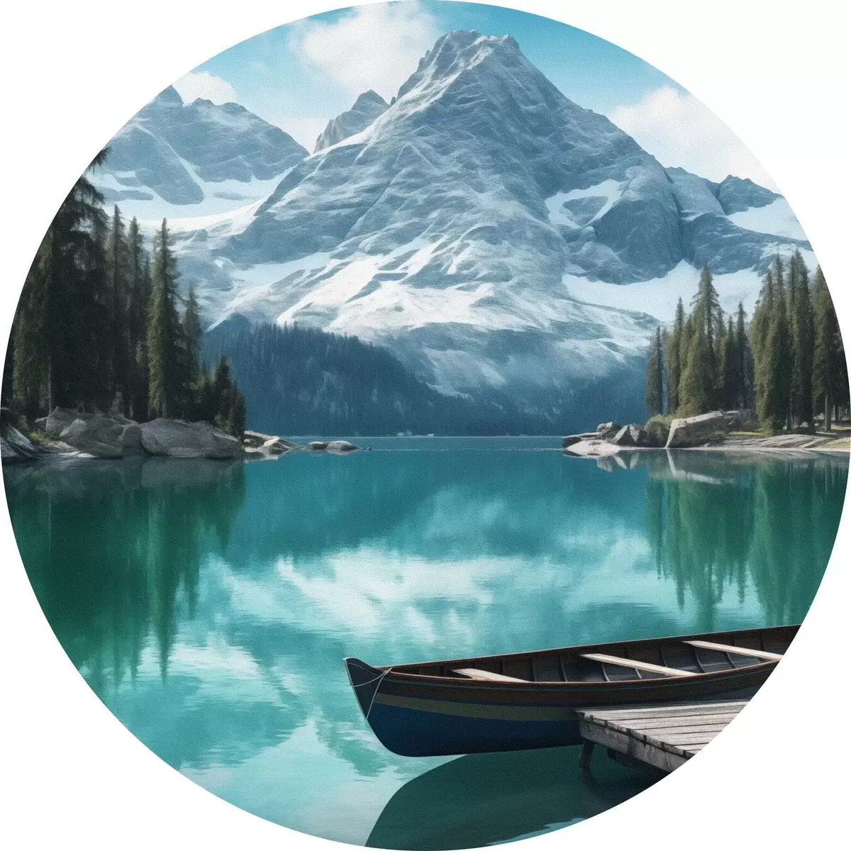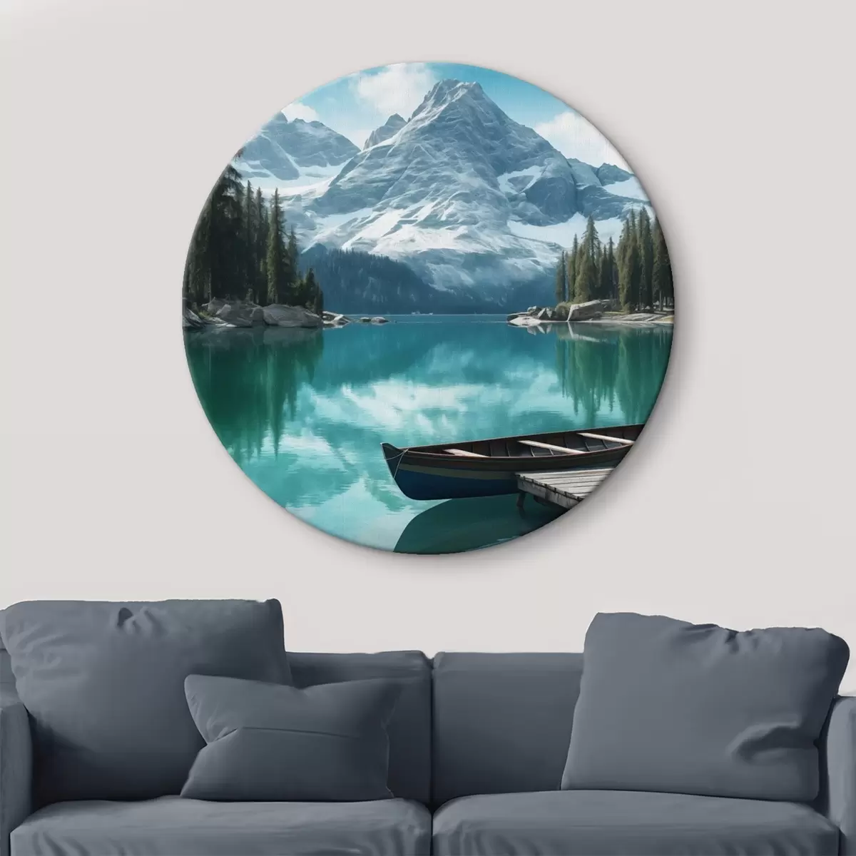 Apaļas gleznas Alpu ezers ar kanoe un sniegotiem virsotnēm r46481