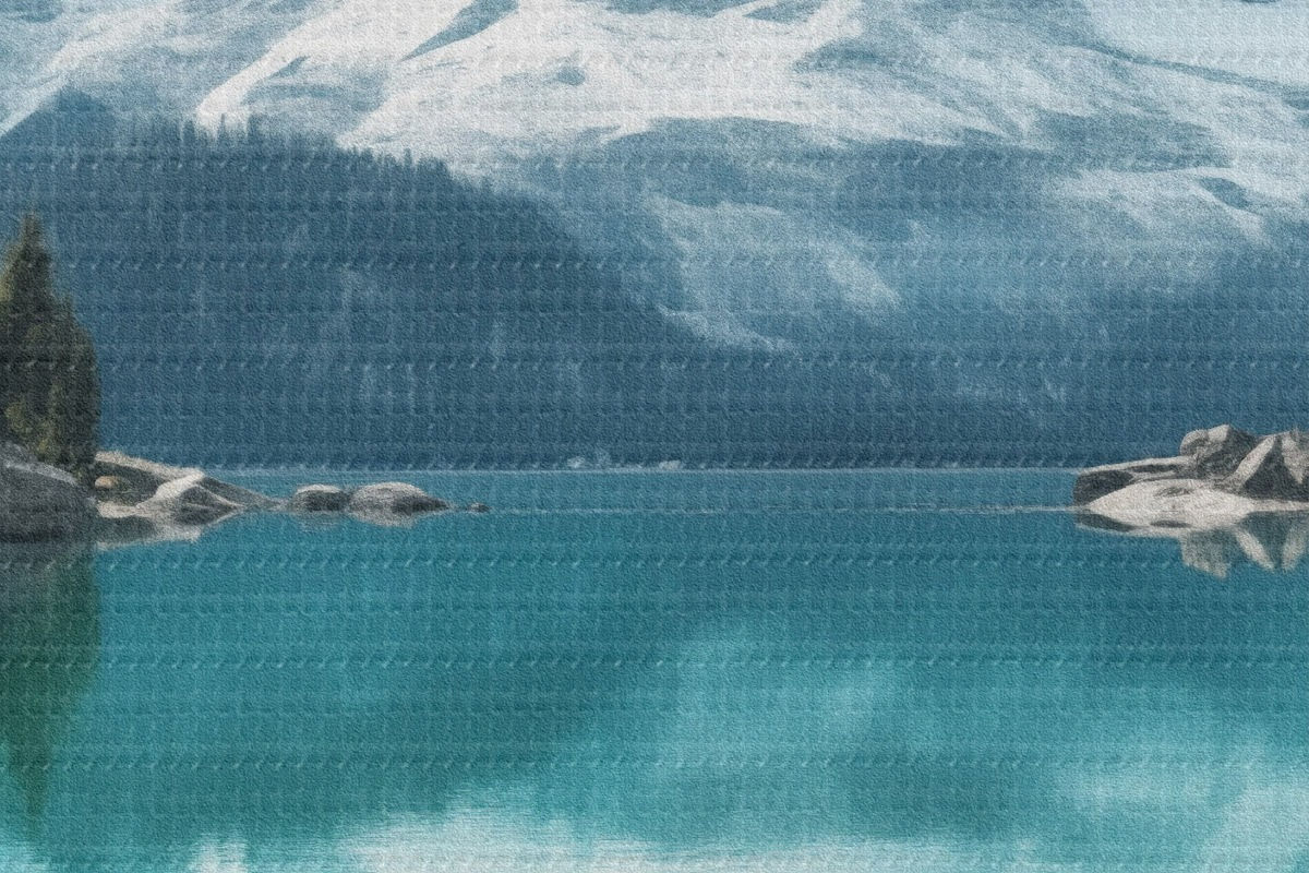 Attēls Alpu ezers ar kanoe un sniegotiem virsotnēm Nr r46481