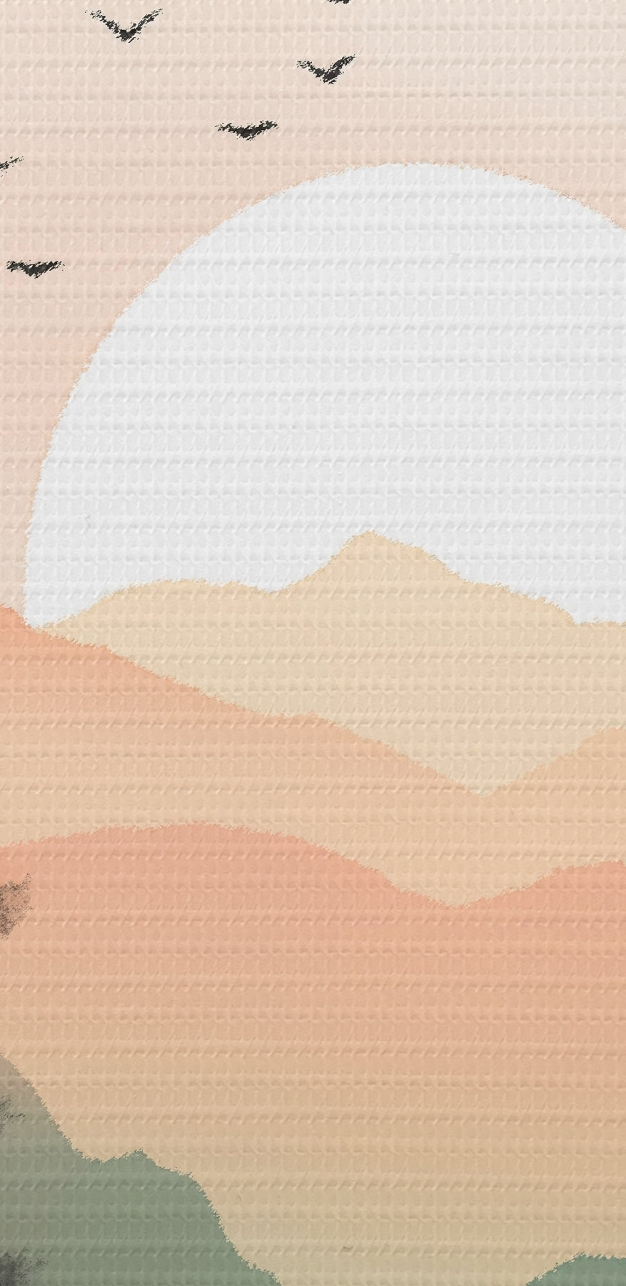 Apaļas gleznas Pastelkrāsaina saulrieta virs klusā ezera ar tālumā redzamajiem kalniem un putniem r46508