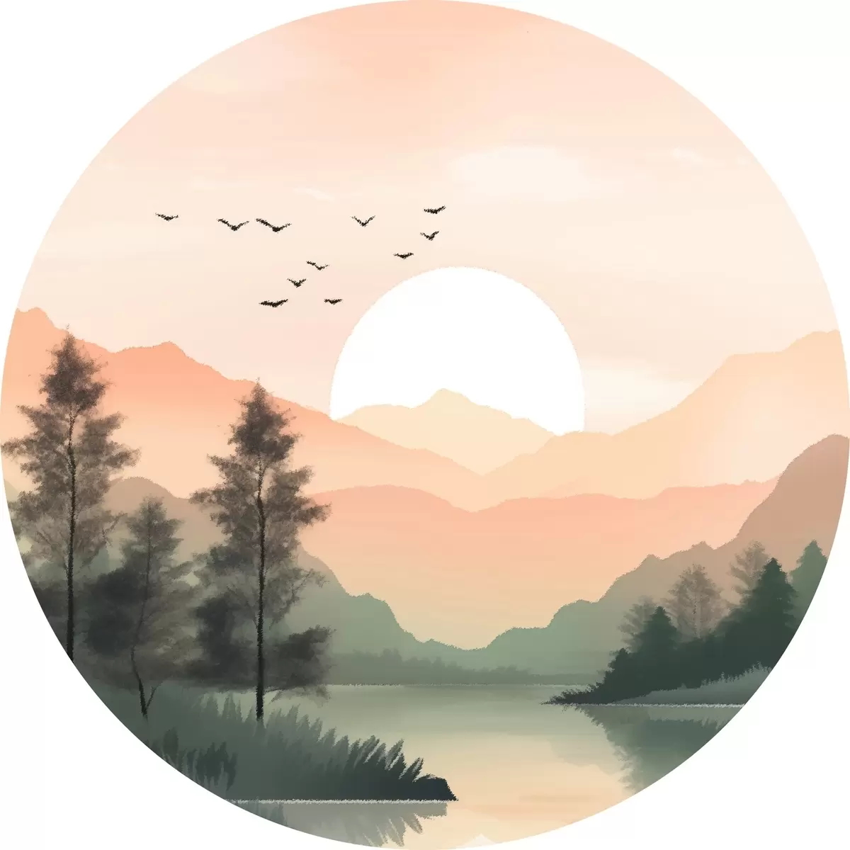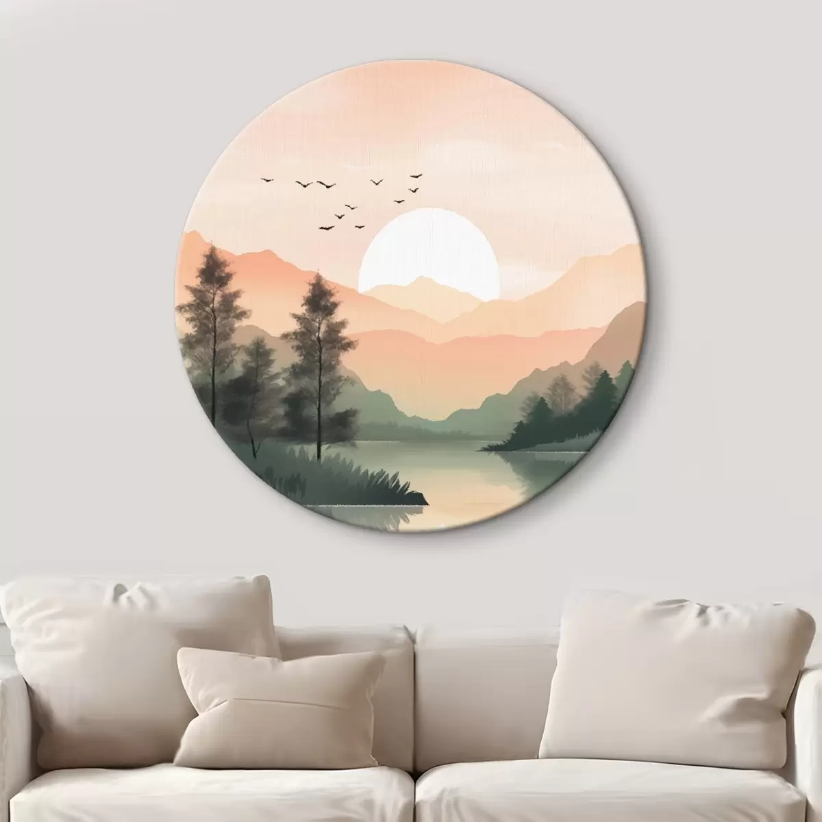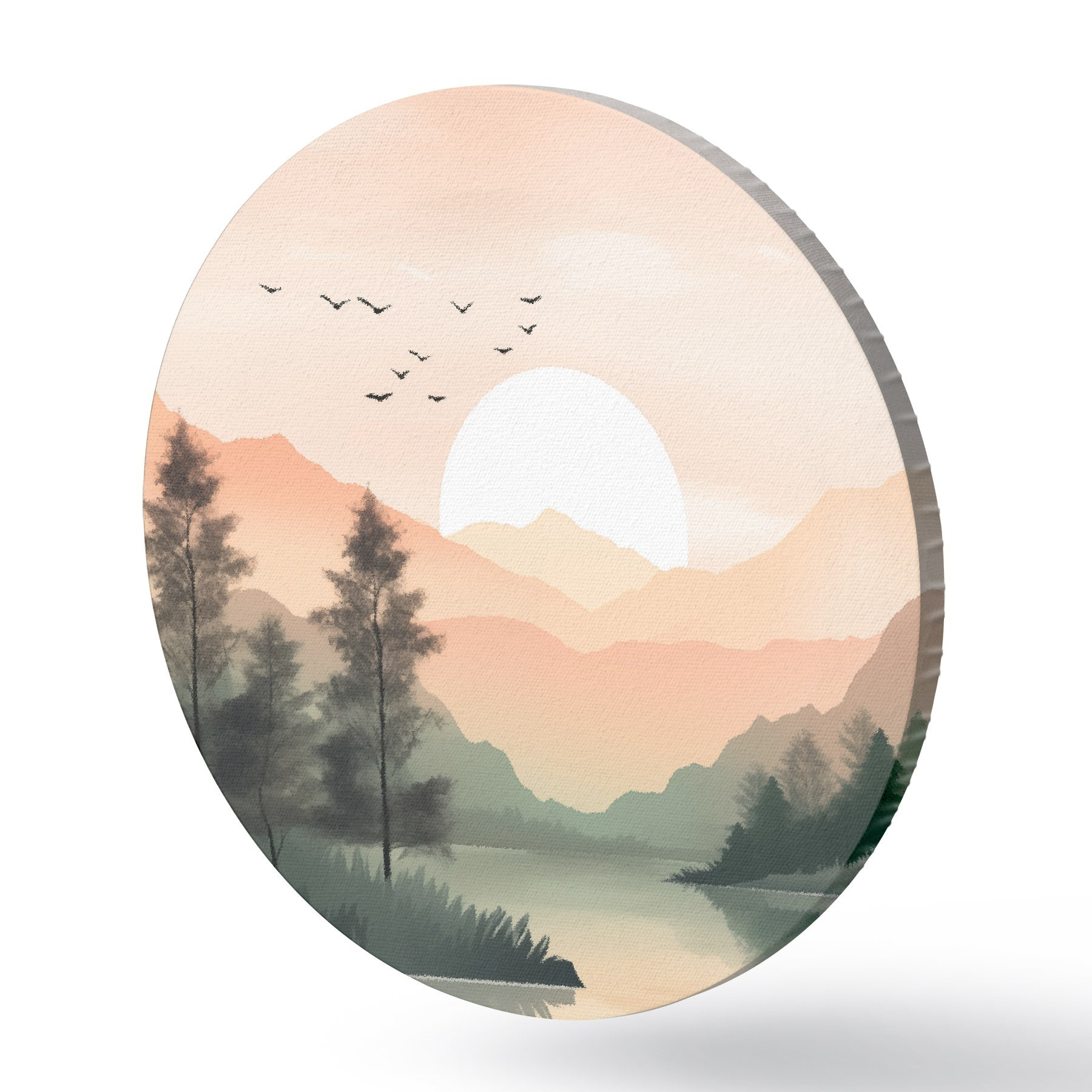 Apaļas gleznas Pastelkrāsaina saulrieta virs klusā ezera ar tālumā redzamajiem kalniem un putniem r46508