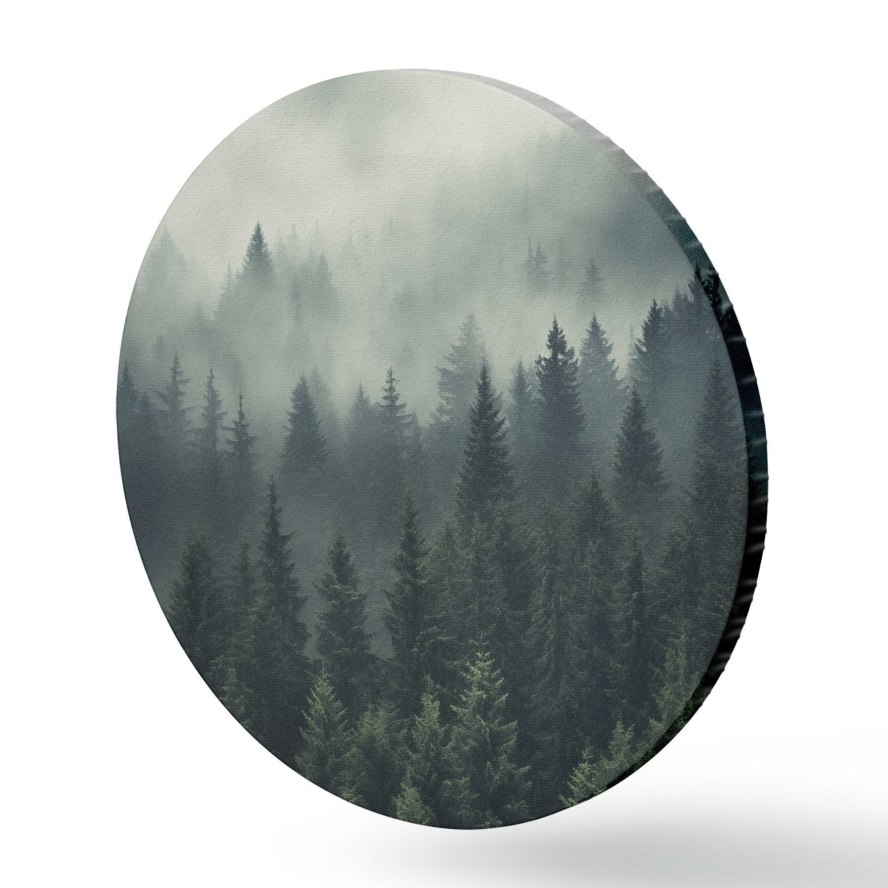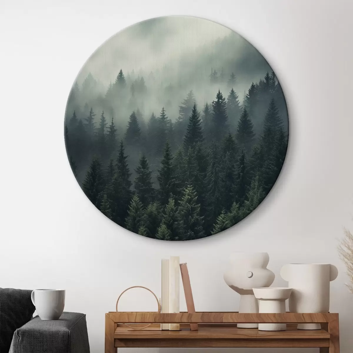 Apaļas gleznas Migla pārklāj blīvu mūžzaļo mežu r46512