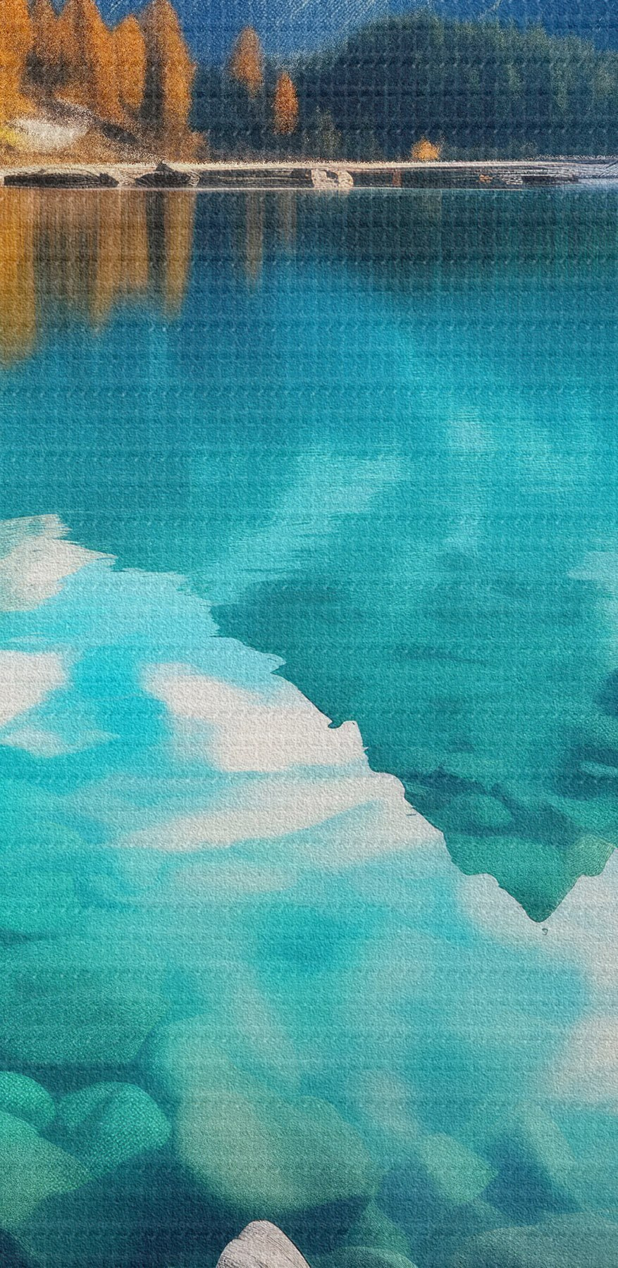 Attēls Kalnu ezers ar tirkīza krāsas ūdeni un rudens lapeglēm Nr r46517