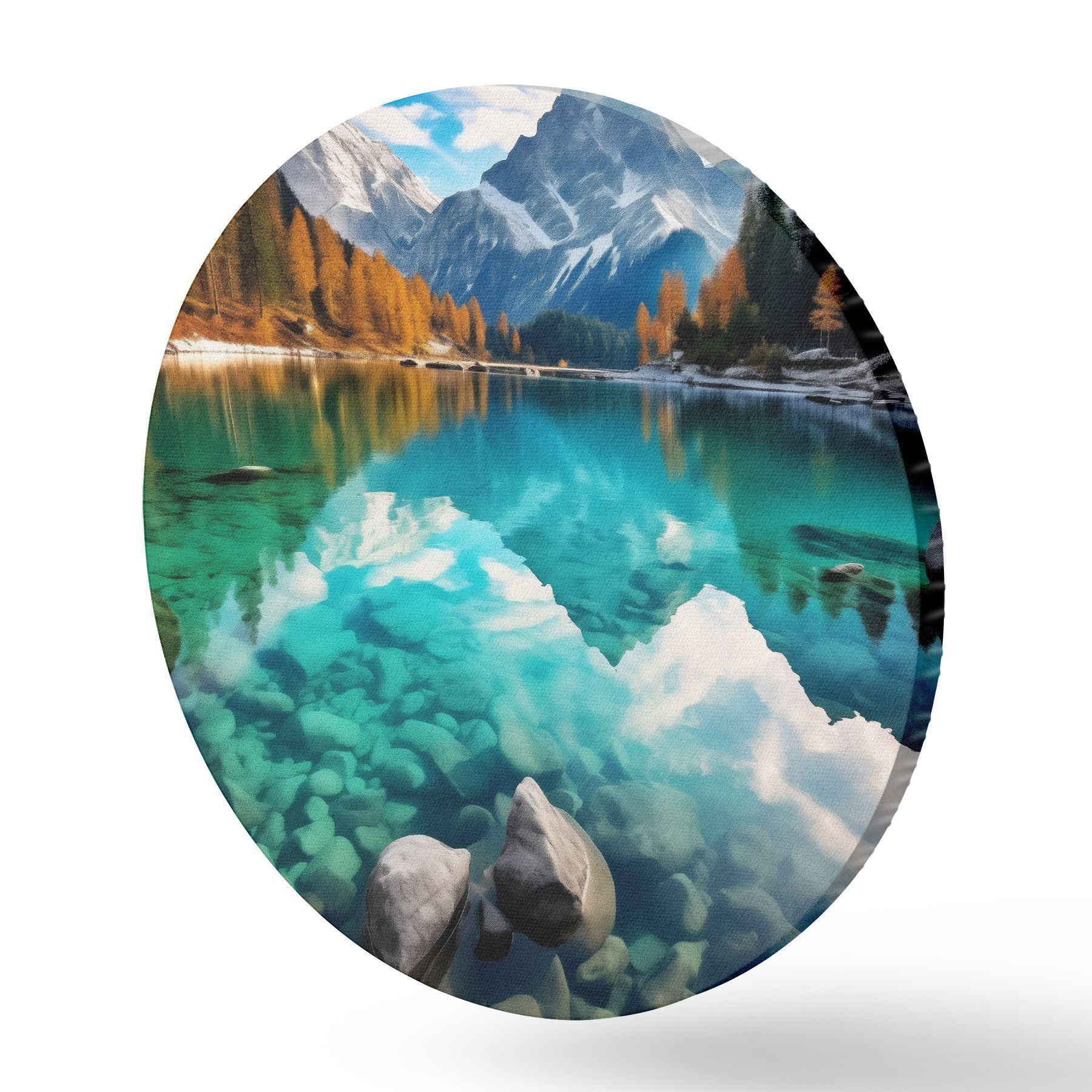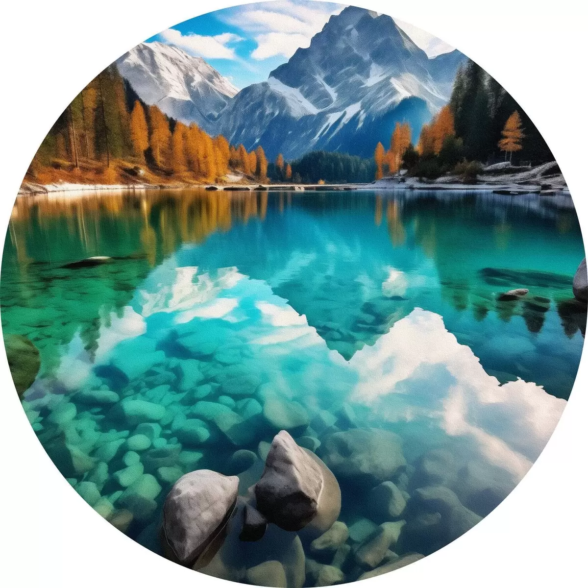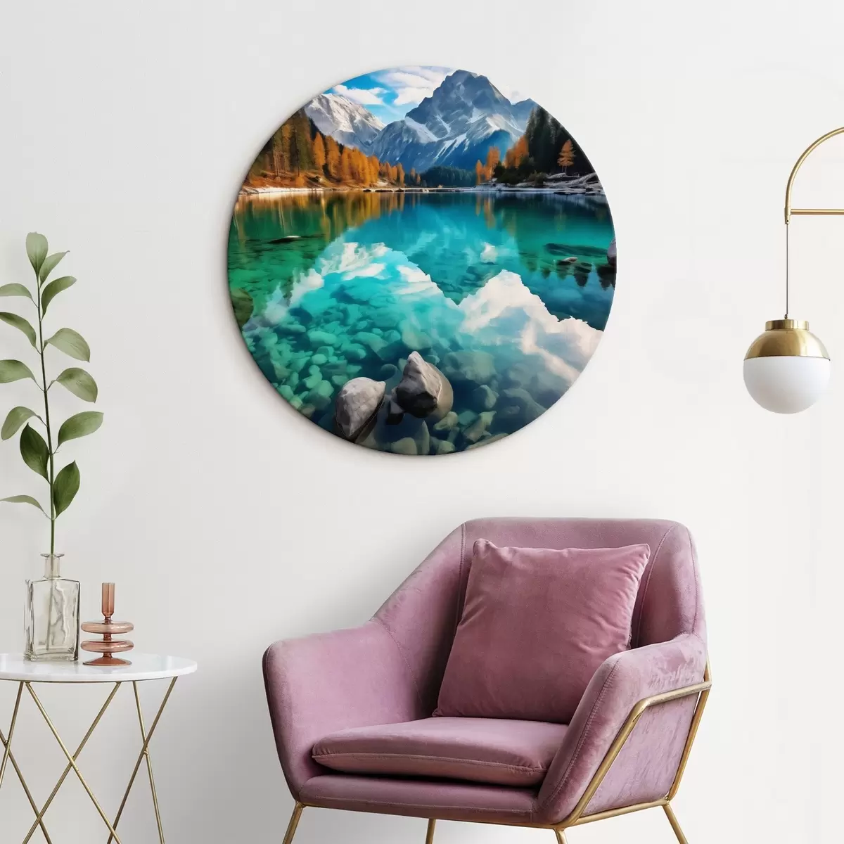 Apaļas gleznas Kalnu ezers ar tirkīza krāsas ūdeni un rudens lapeglēm r46517