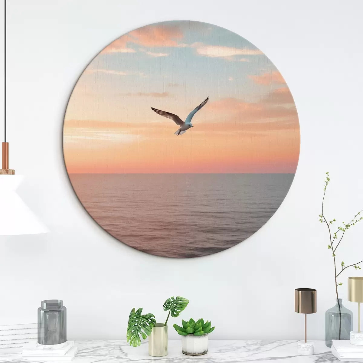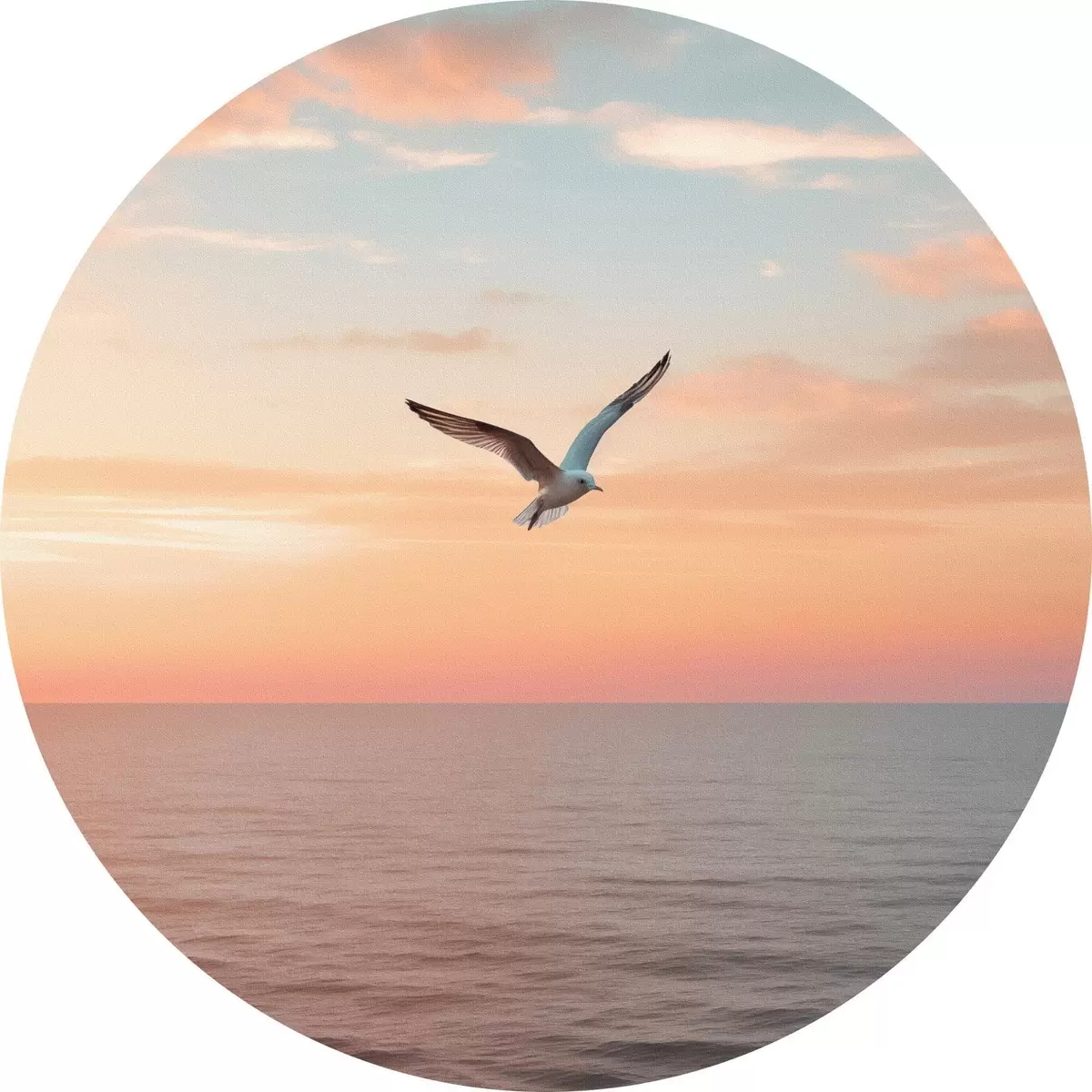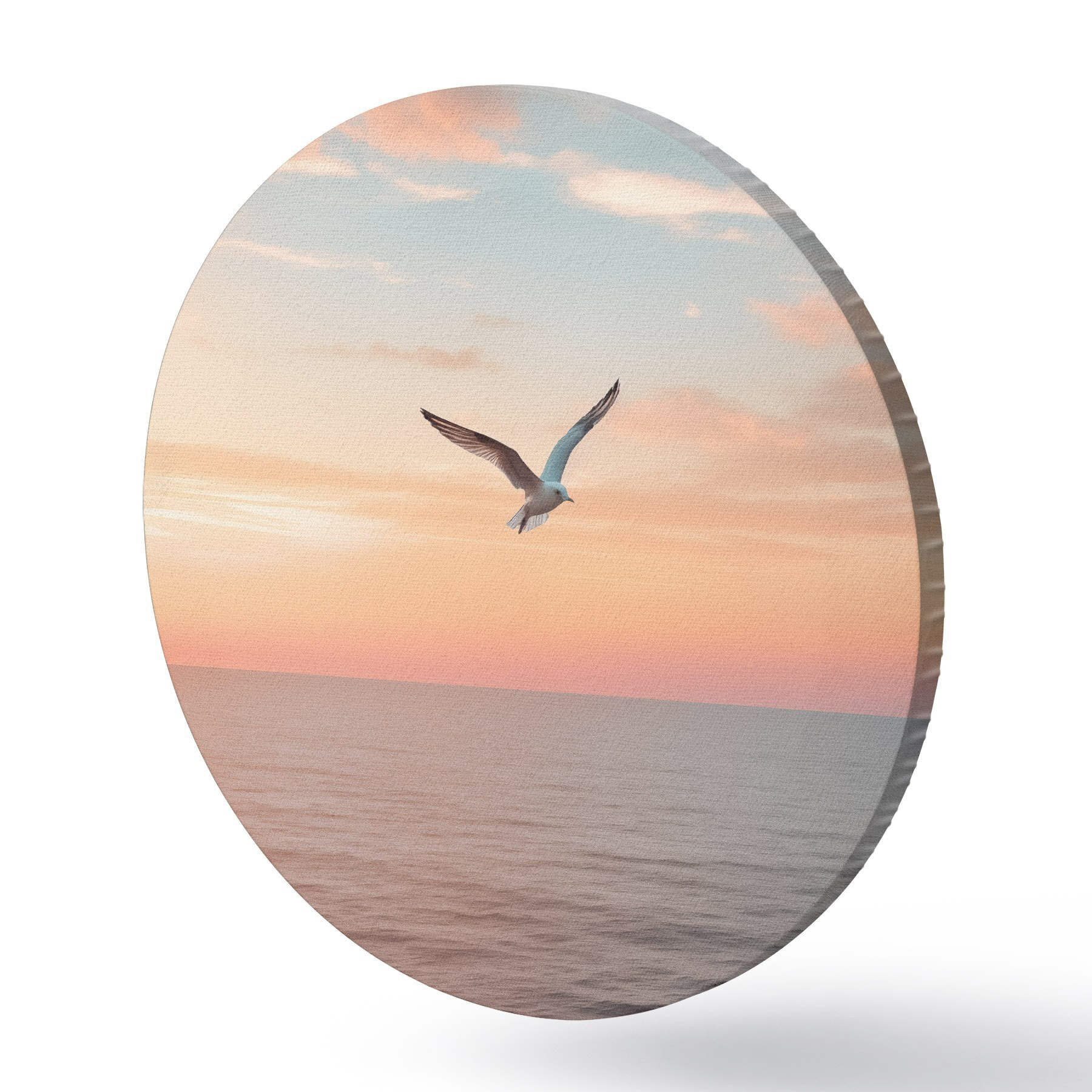 Apaļas gleznas Kaija virs jūras rozā-persiku krāsas saulrietā r46520