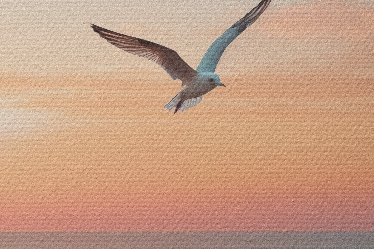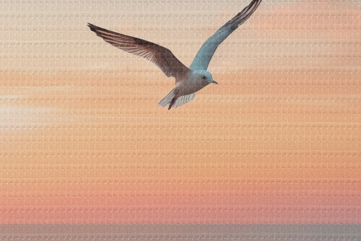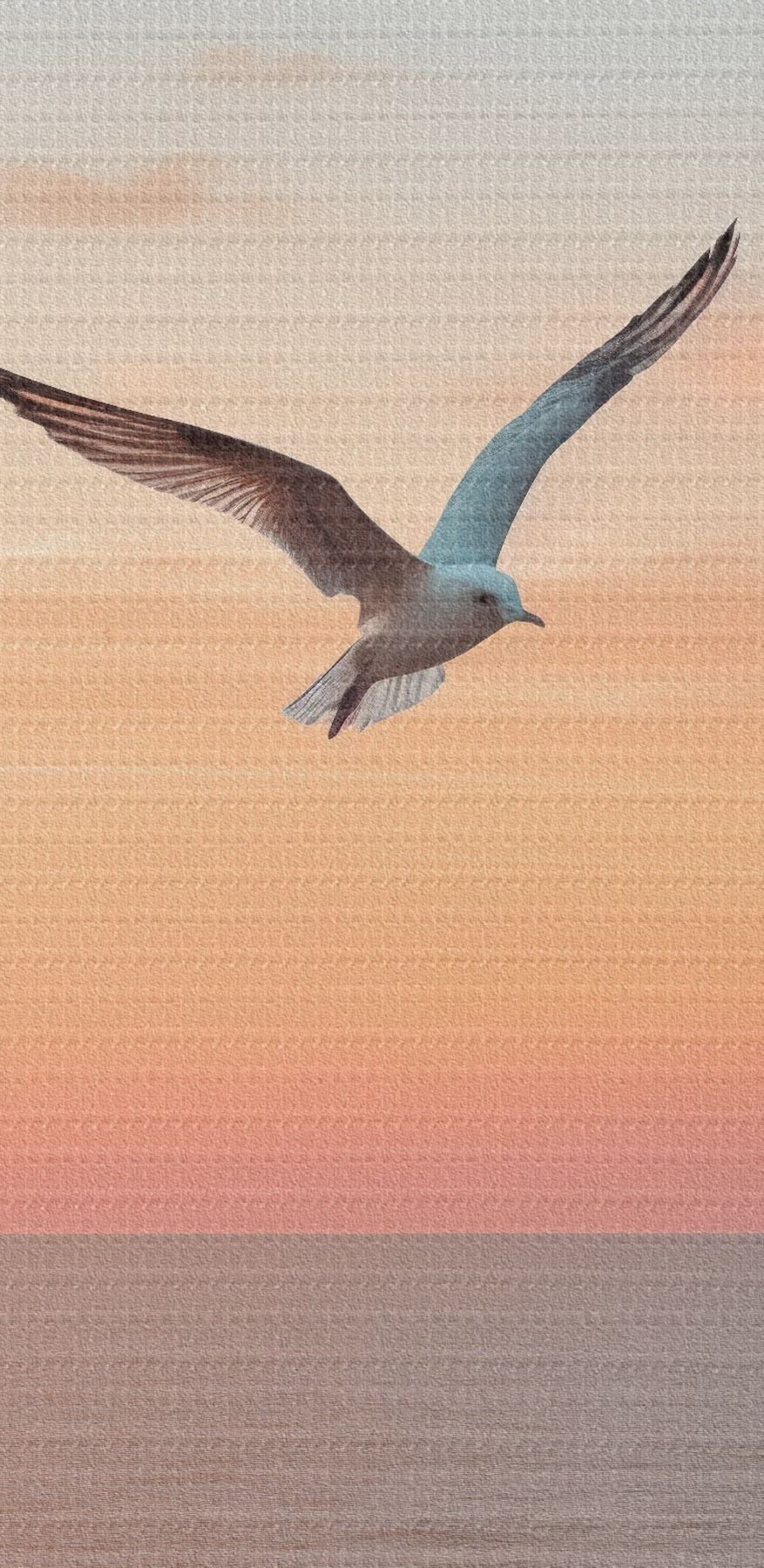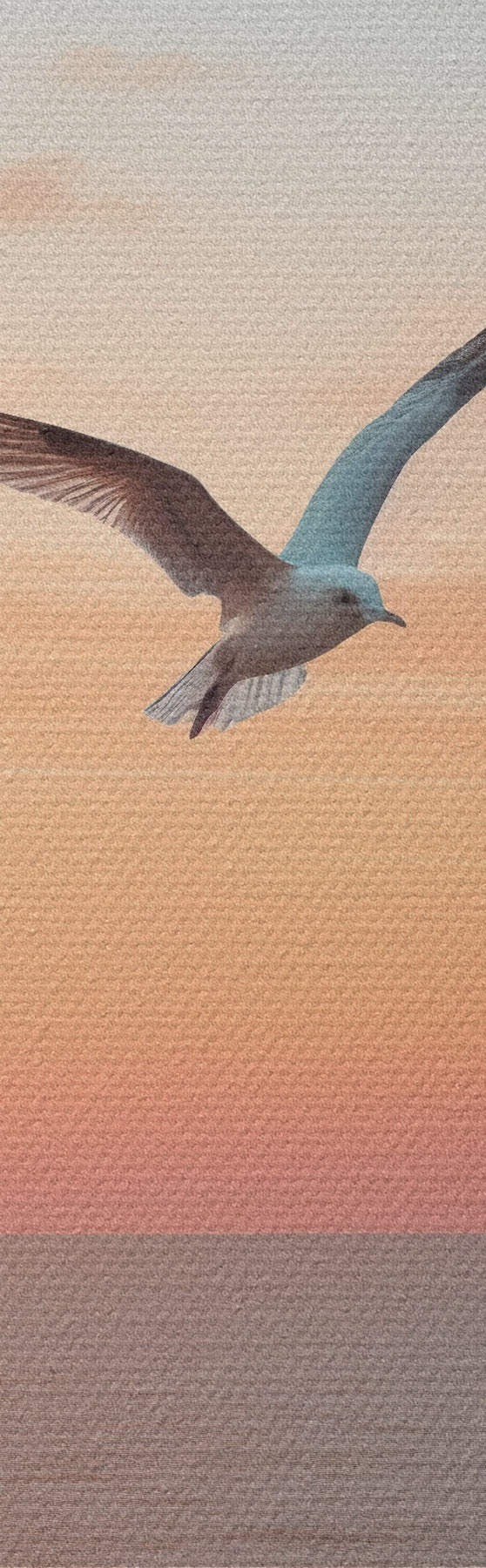 Attēls Kaija virs jūras rozā-persiku krāsas saulrietā Nr r46520