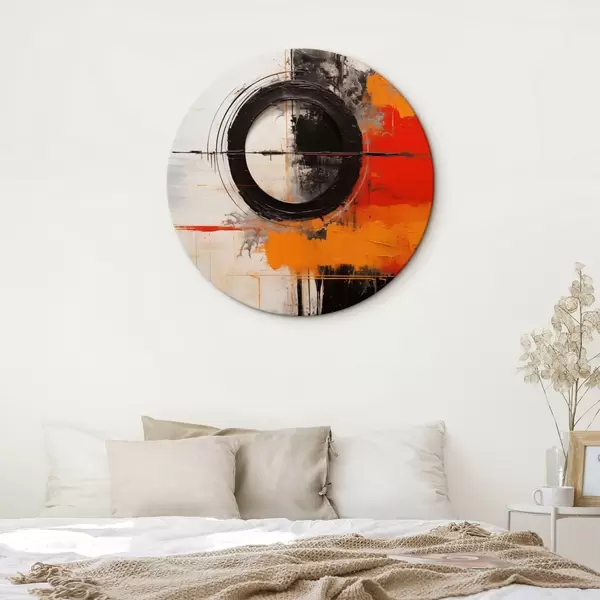 Apaļas gleznas Melna apļa uz balta fona, oranžas līnijas un šļakatas r46549