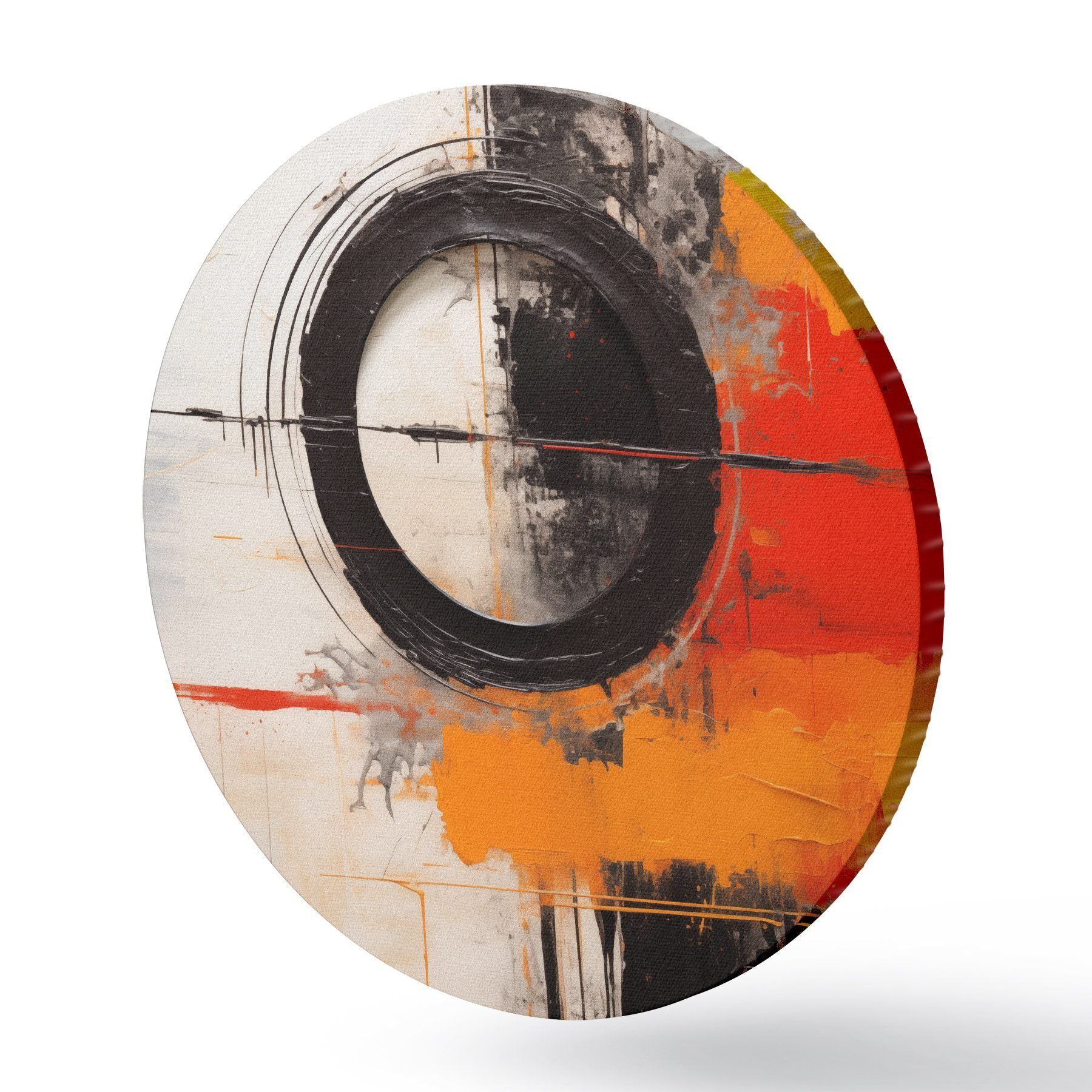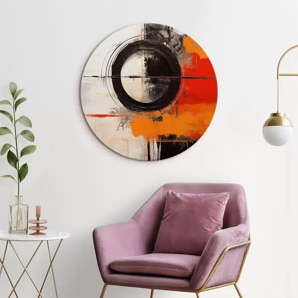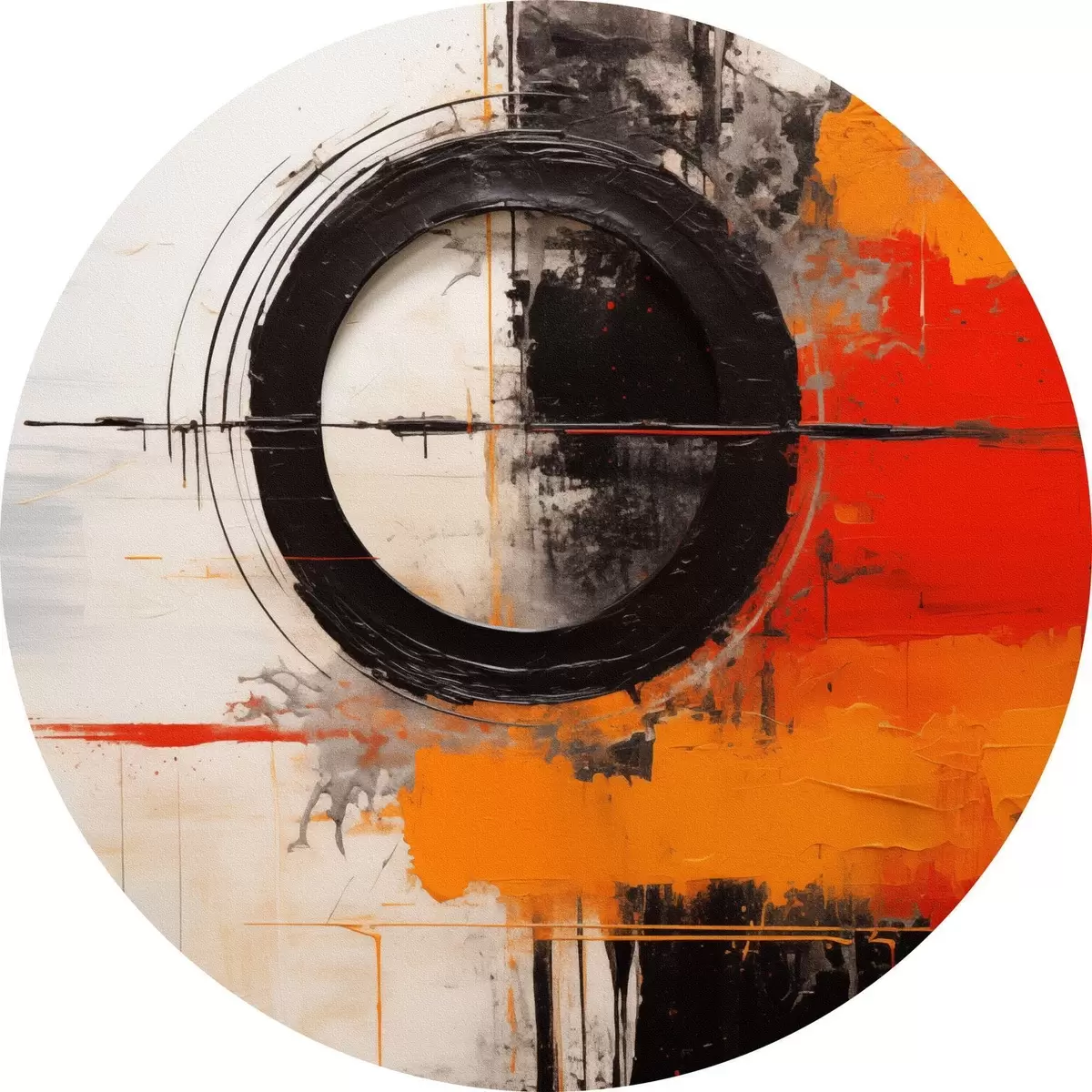 Apaļas gleznas Melna apļa uz balta fona, oranžas līnijas un šļakatas r46549