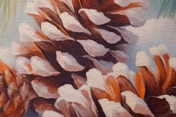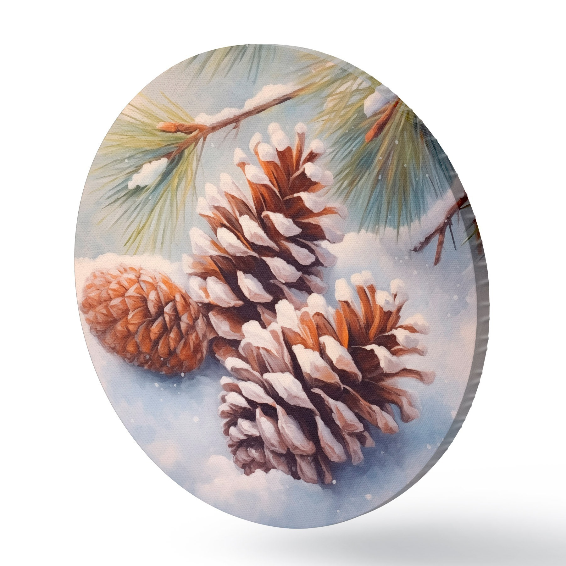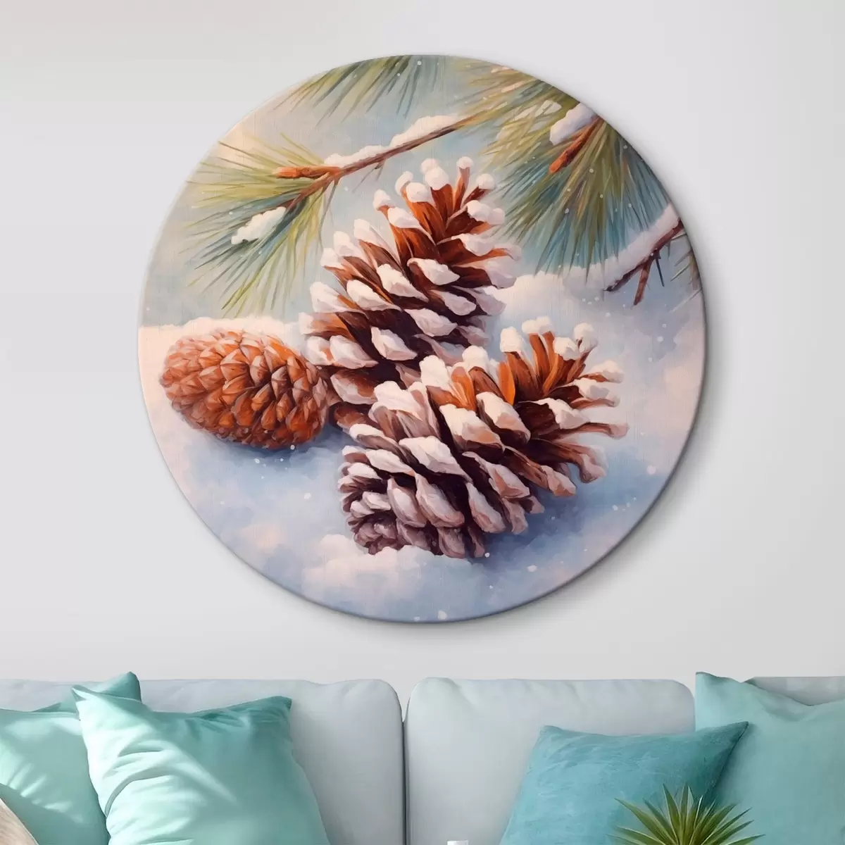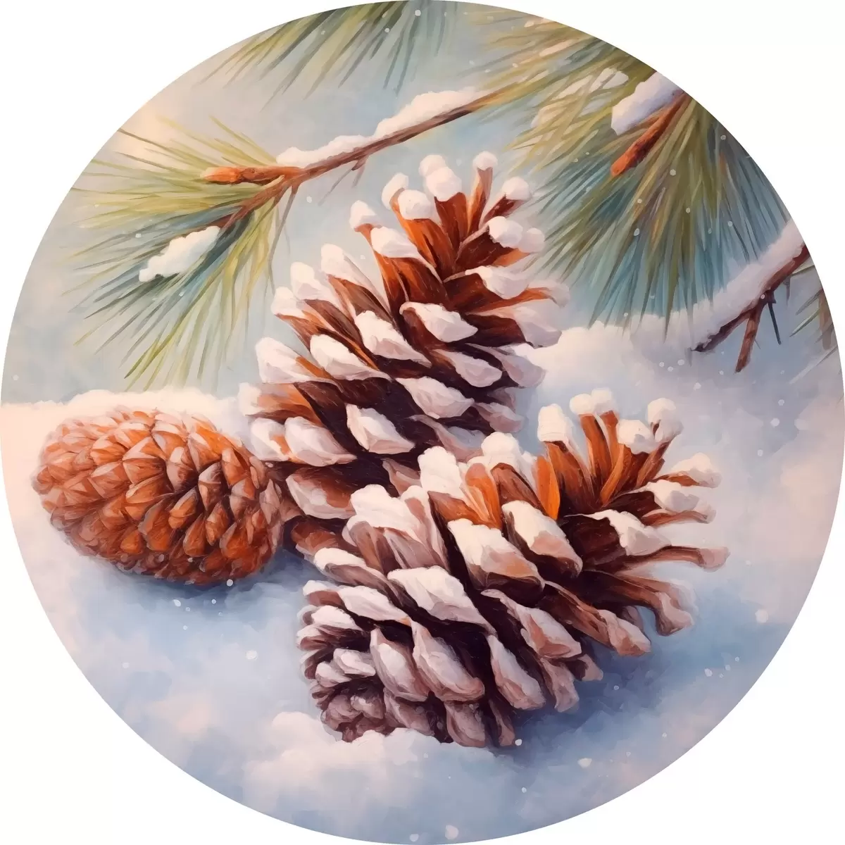 Apaļas gleznas Sniega klātas priežu čiekuri un zari r46631