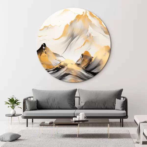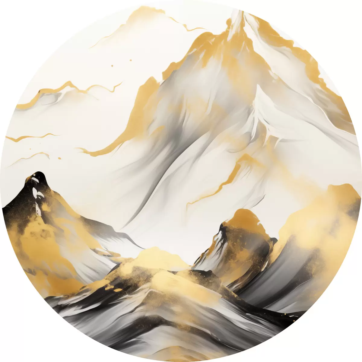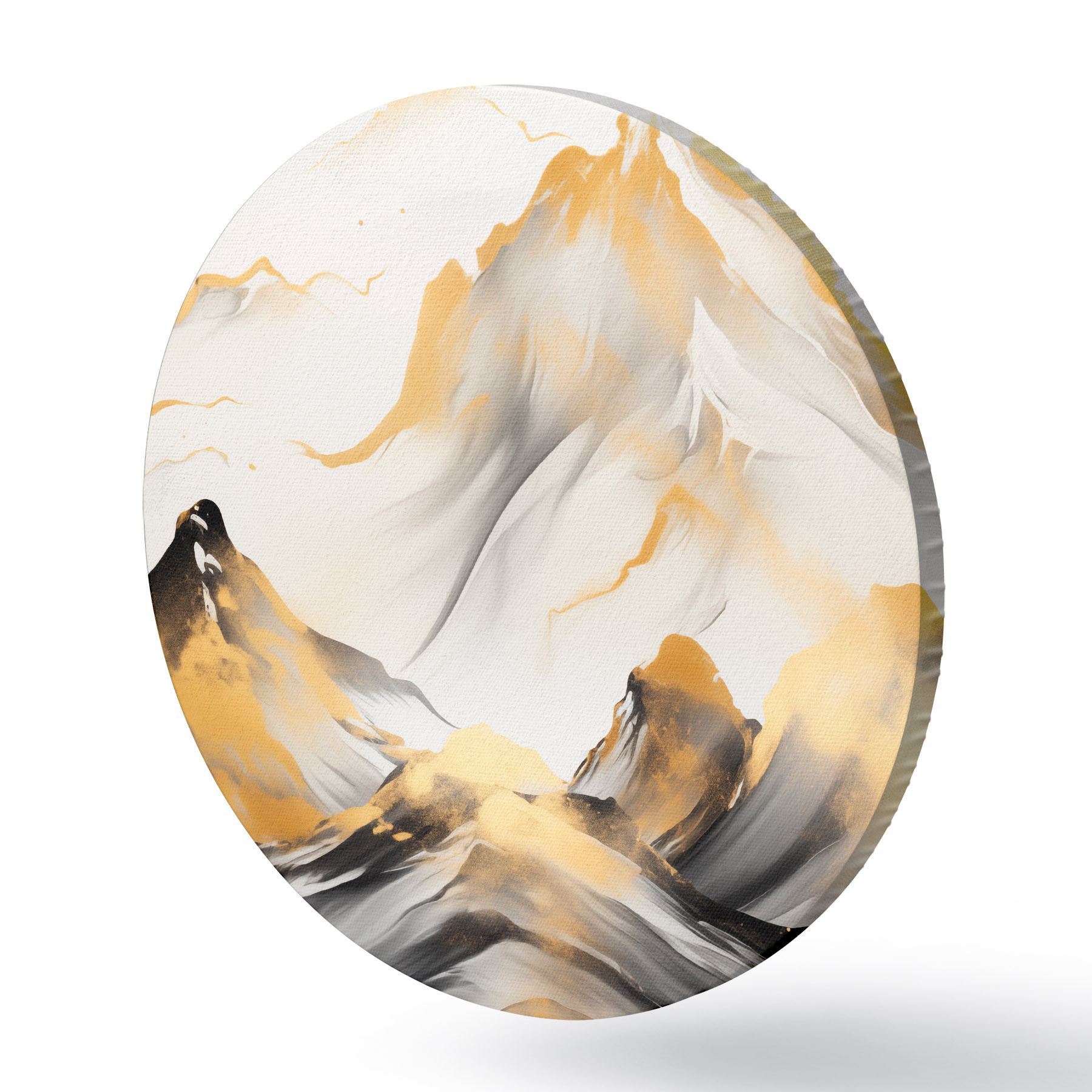 Apaļas gleznas Teksturēti dzelteni un melni kalni ar sniegotiem virsotnēm, tušas gleznojuma stils, minimālisma stila kalnu grēda r46683