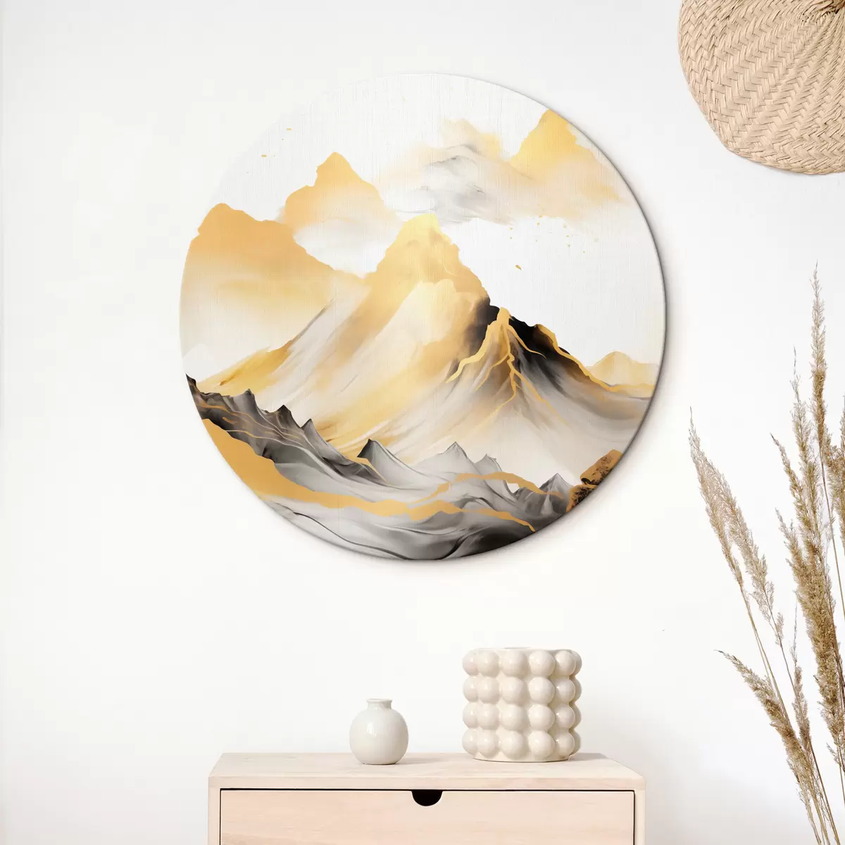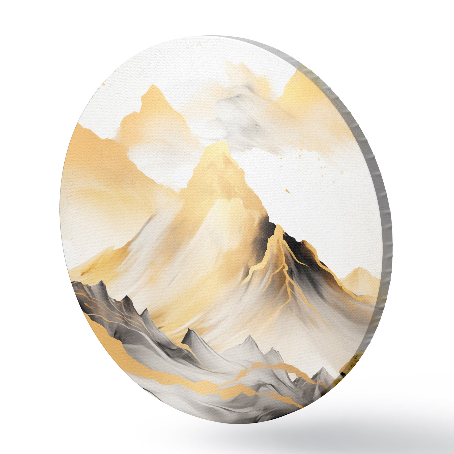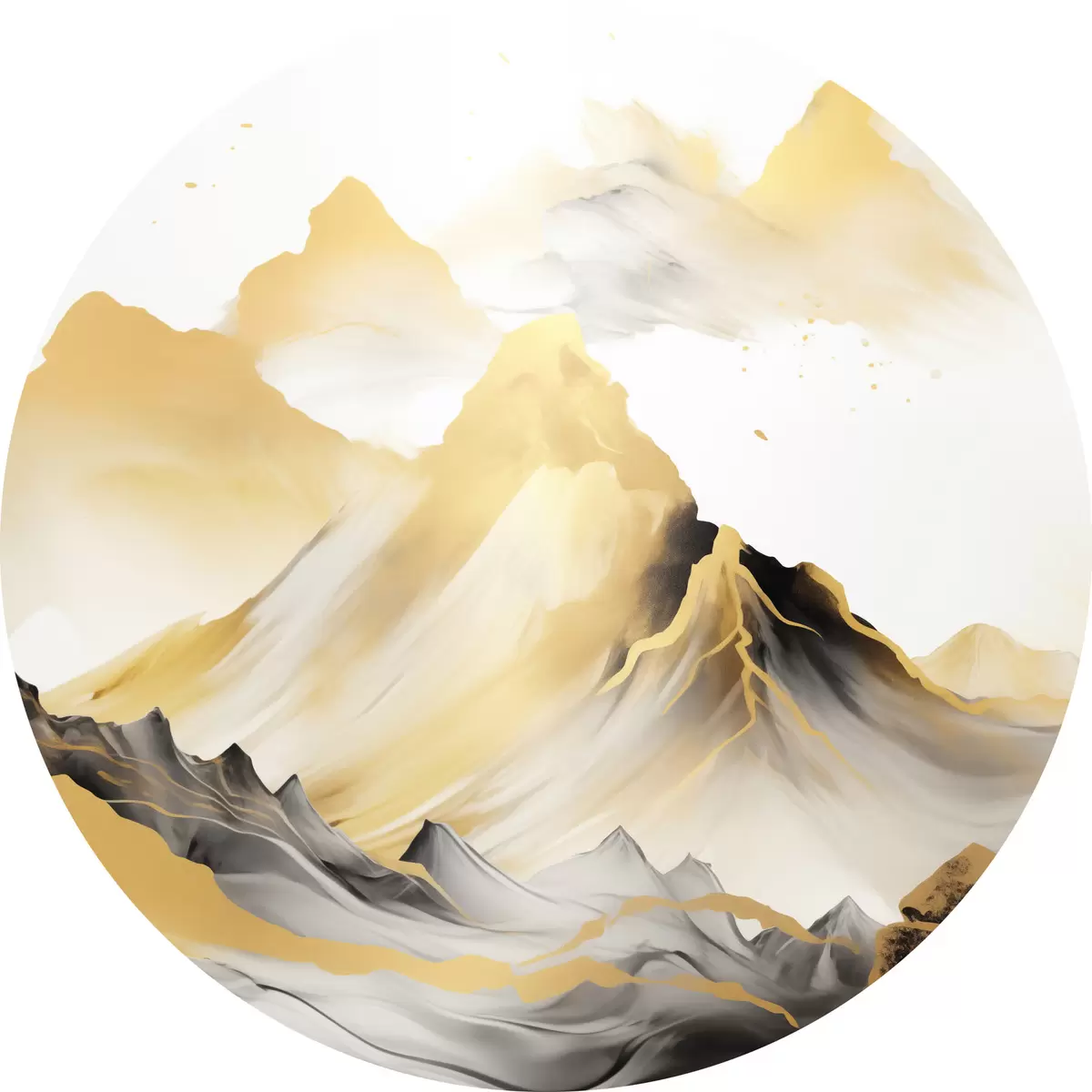 Apaļas gleznas Teksturēti dzelteni un melni kalni ar sniegotiem virsotnēm, tušas gleznojuma stils, minimālisma stila kalnu grēda r46684