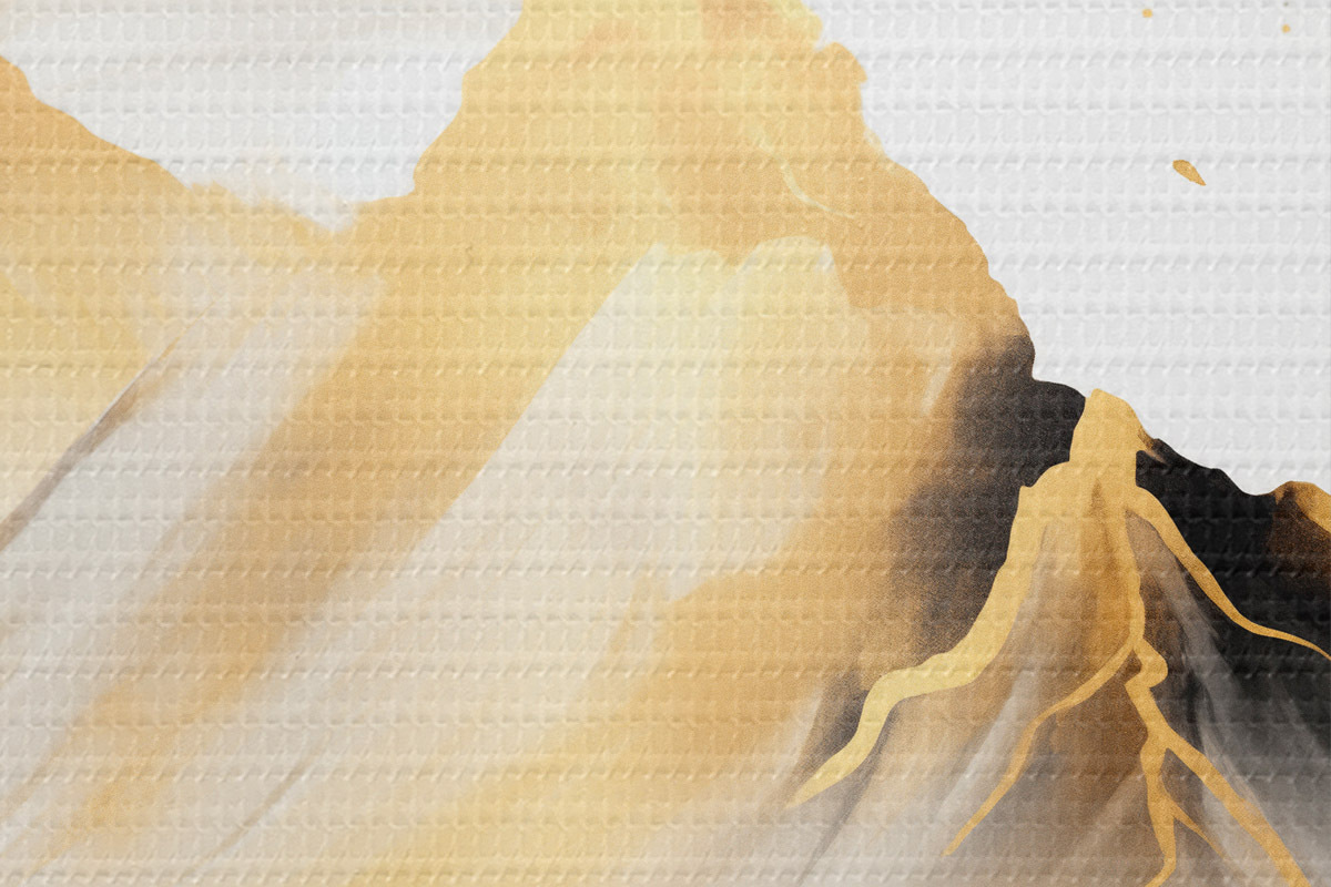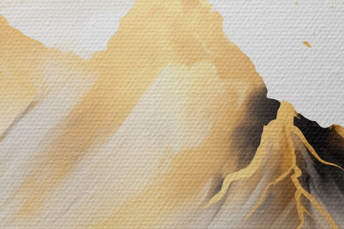 Attēls Teksturēti dzelteni un melni kalni ar sniegotiem virsotnēm, tušas gleznojuma stils, minimālisma stila kalnu grēda Nr r46684