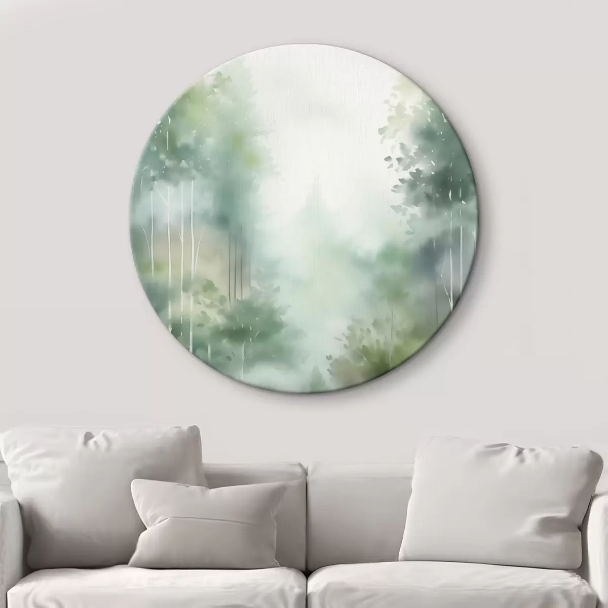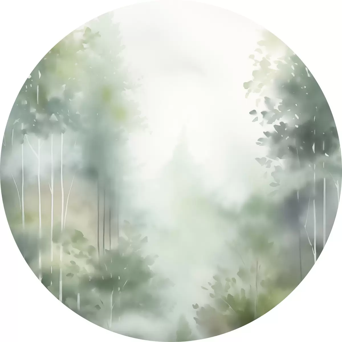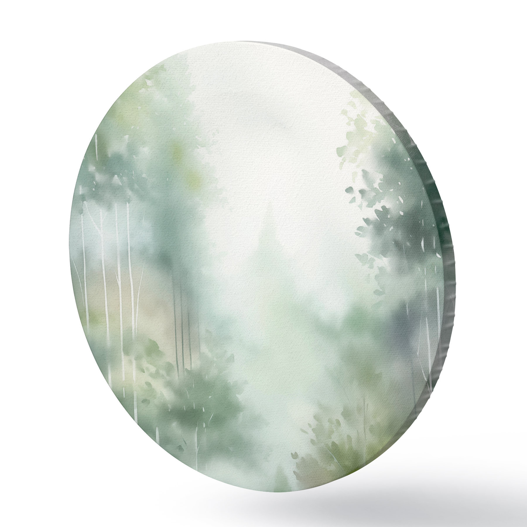Apaļas gleznas Akvareļa glezna, kas imitē abstraktu mežu ar augstiem kokiem un zaļām lapām, maigās, klusās krāsās r46689