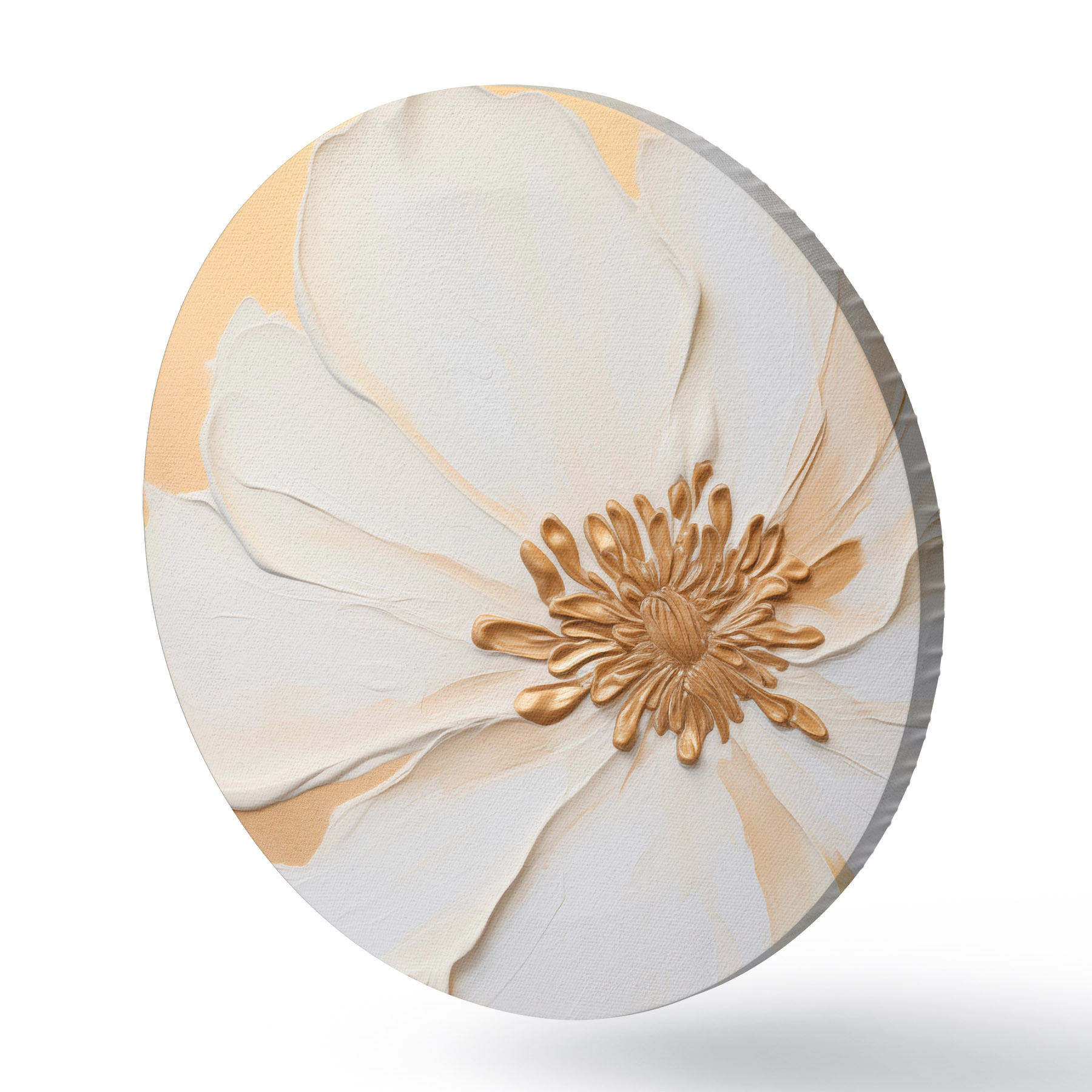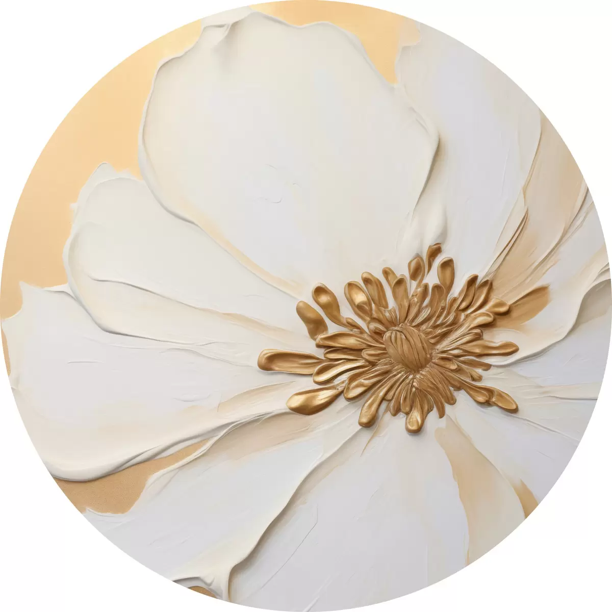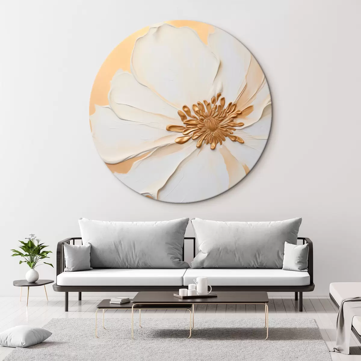 Apaļas gleznas Baltas ziediņas ar smalkām ziedlapām, imitējot biezas otas triepienus, uz gaiši oranža teksturēta fona. r46691