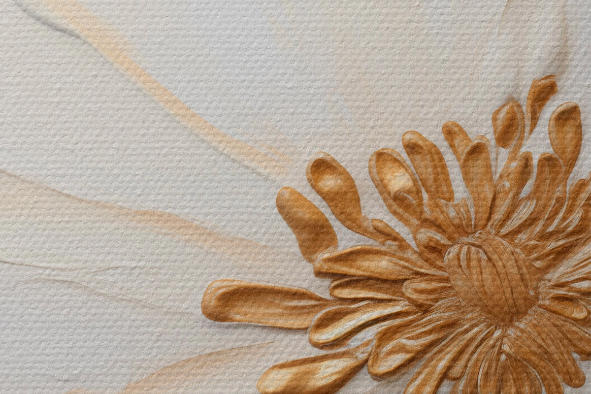 Attēls Baltas ziediņas ar smalkām ziedlapām, imitējot biezas otas triepienus, uz gaiši oranža teksturēta fona. Nr r46691