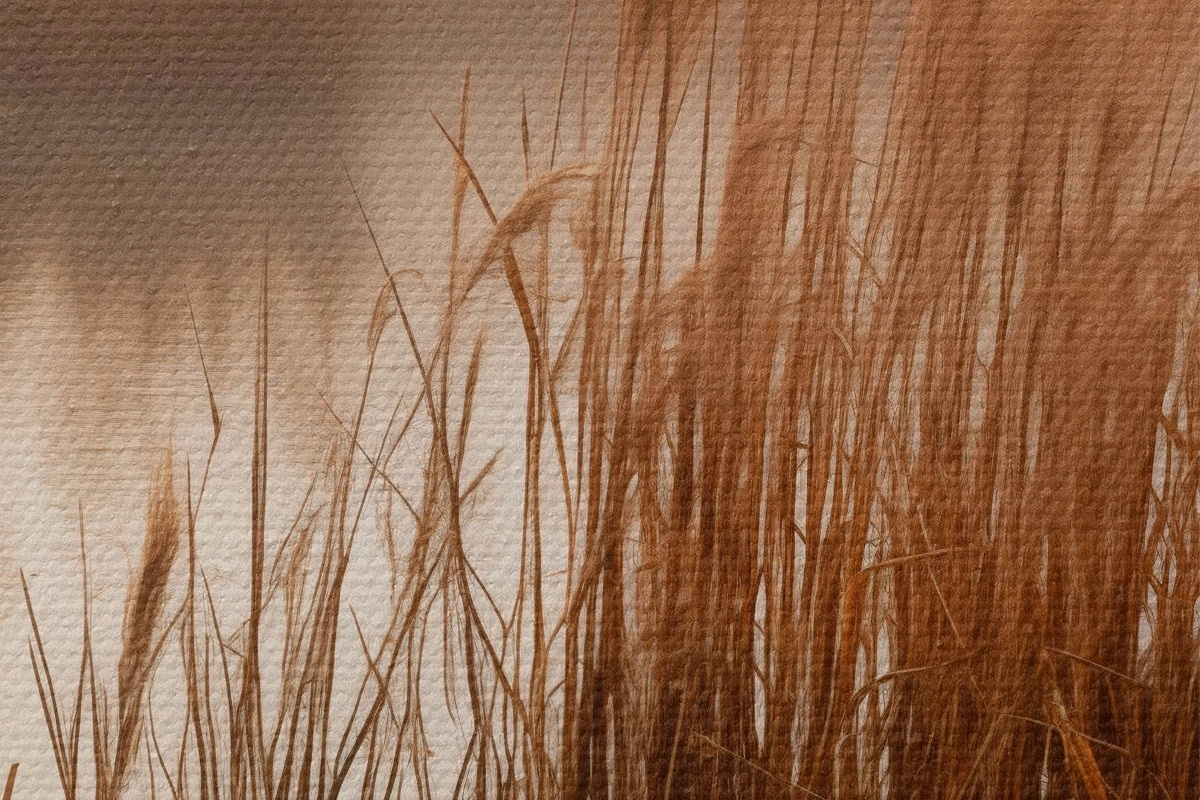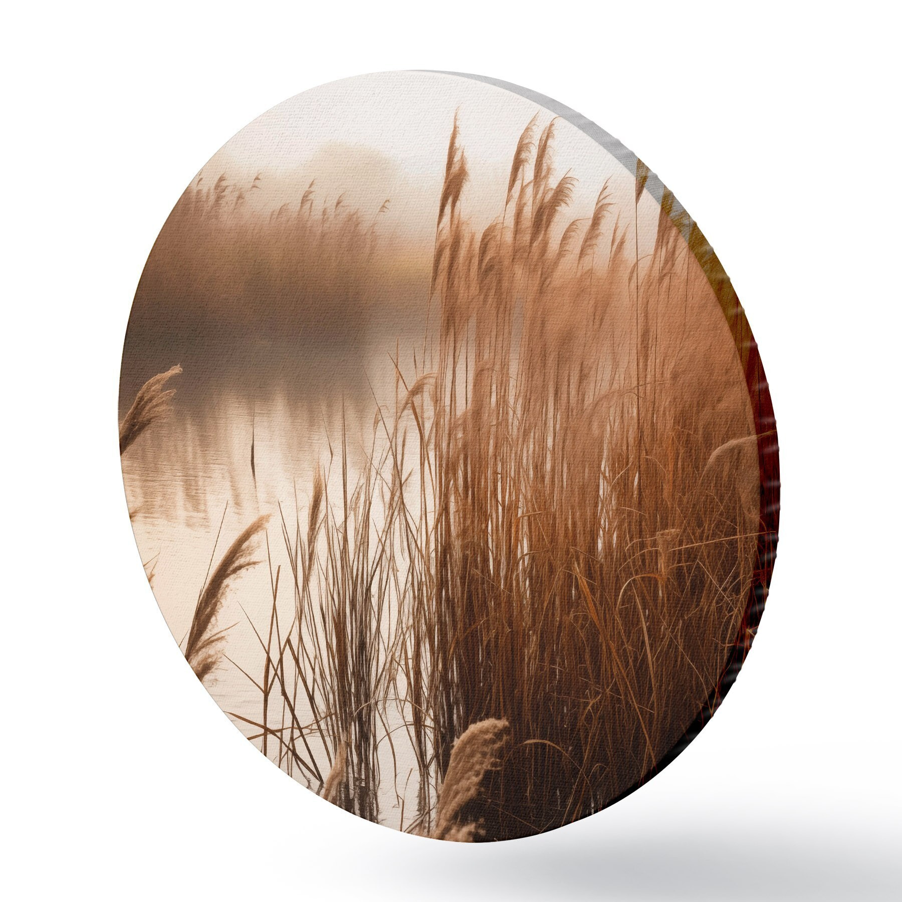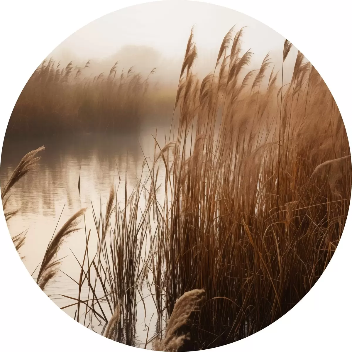 Apaļas gleznas Augsti niedres, kas aug ūdenstilpē, ūdens atspoguļo niedres, miglains fons, maiga gaisma, dabas skats r46695