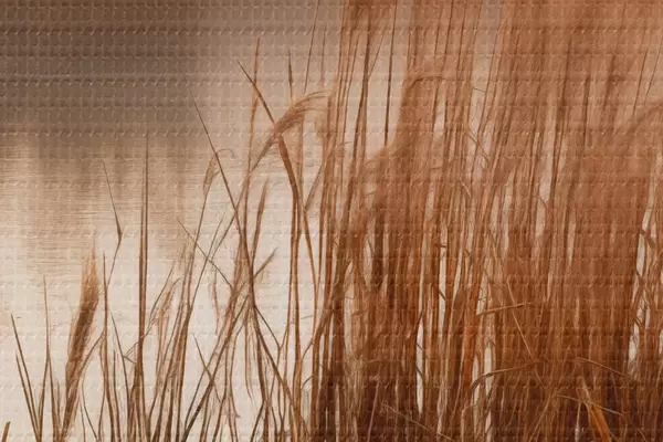Attēls Augsti niedres, kas aug ūdenstilpē, ūdens atspoguļo niedres, miglains fons, maiga gaisma, dabas skats Nr r46695