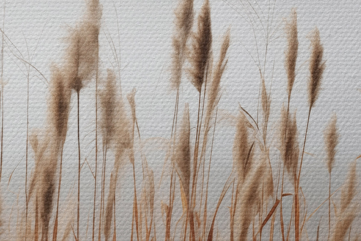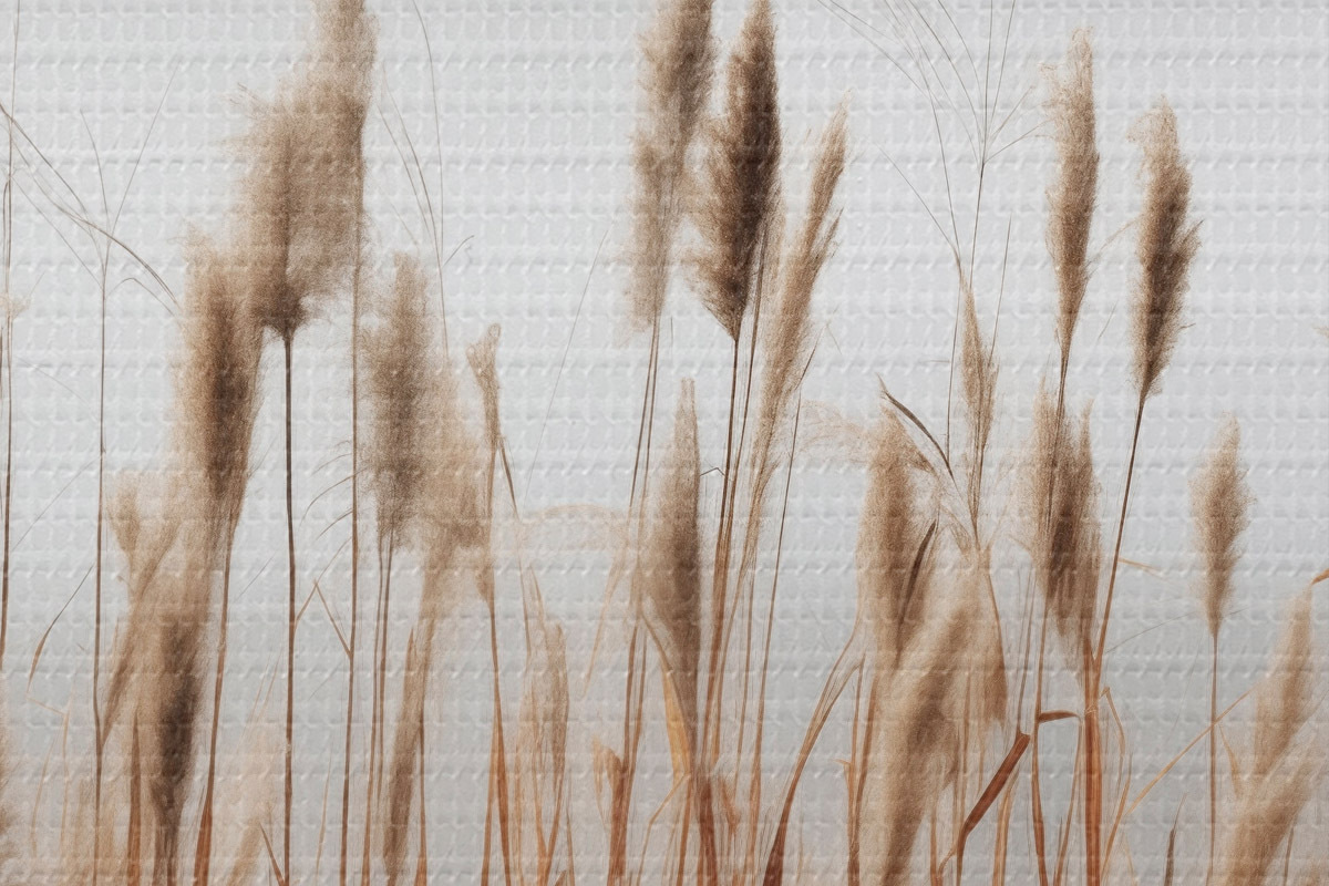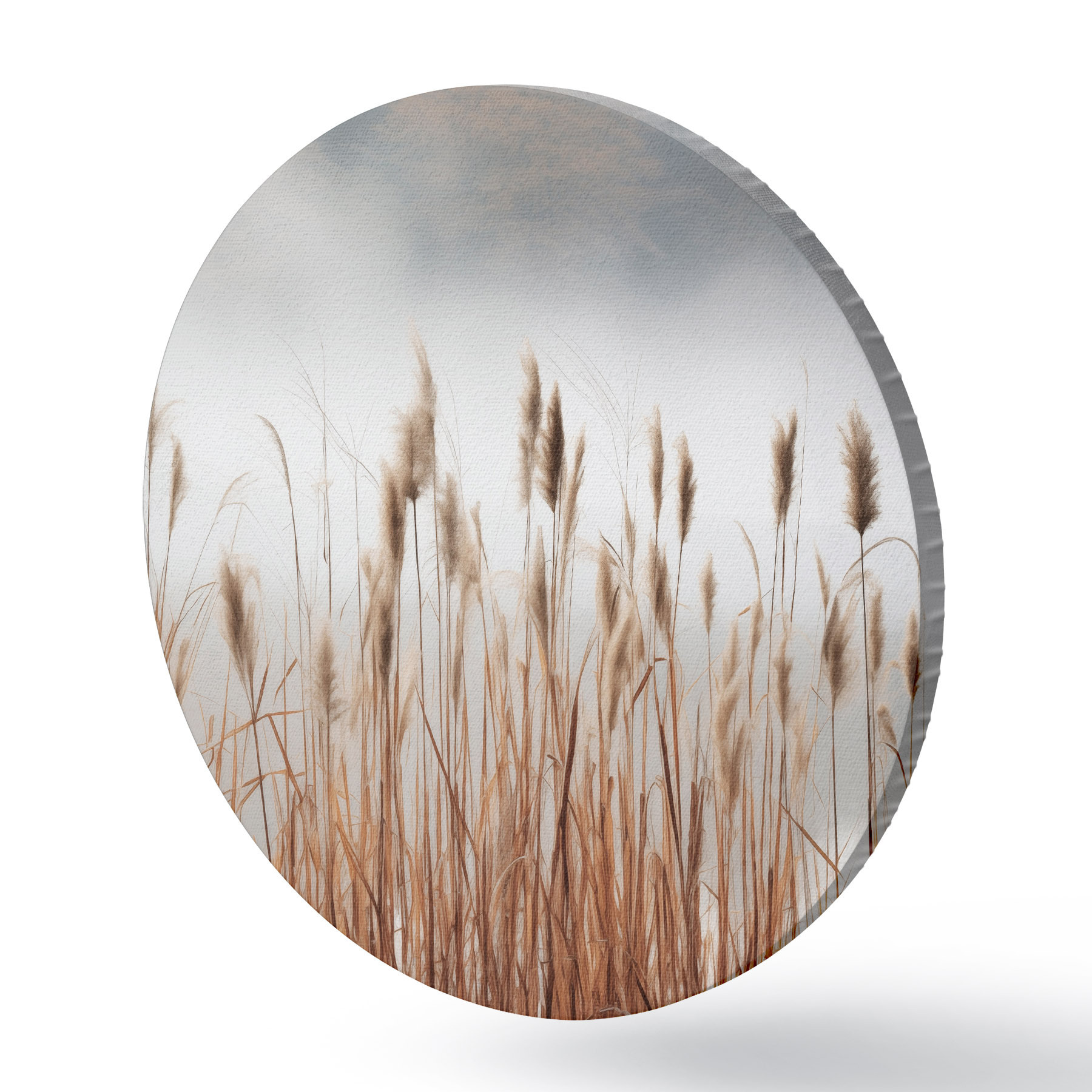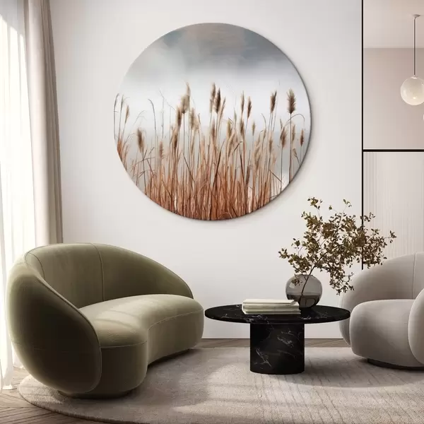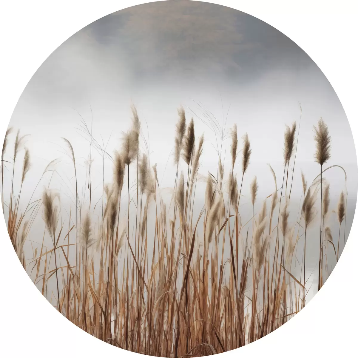 Apaļas gleznas Augsti niedres, kas aug ūdenstilpē, ūdens atspoguļo niedres, miglains fons, maiga gaisma, dabas skats r46696