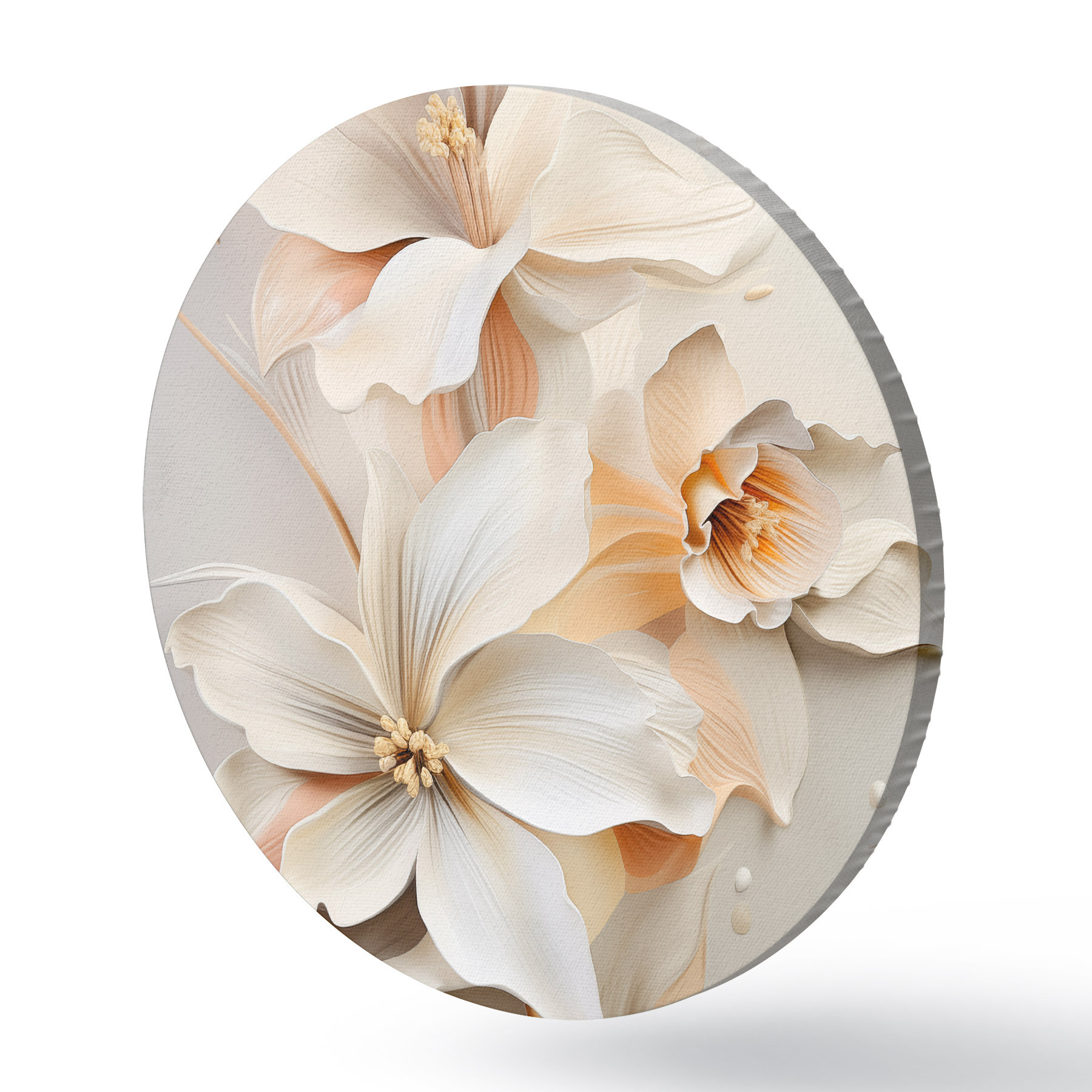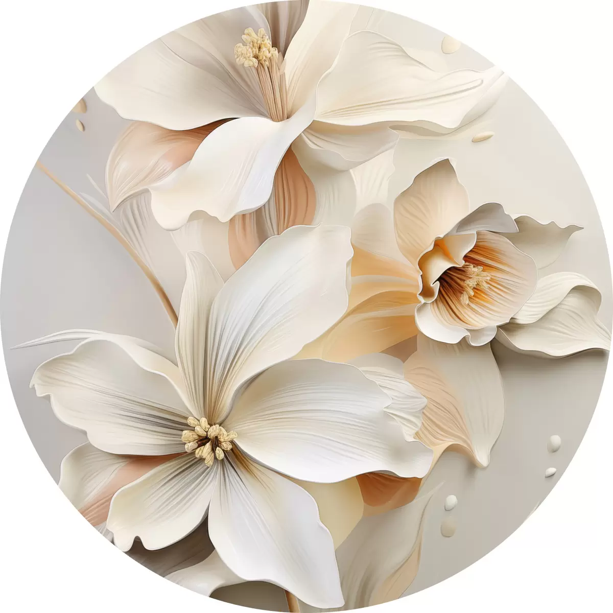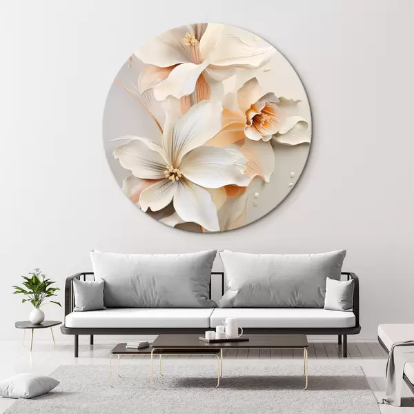 Apaļas gleznas Baltas puķes, ziedlapiņas ar maigām ēnām, gaiši smilškrāsas fons, eleganta kompozīcija, minimālisma stils r46699
