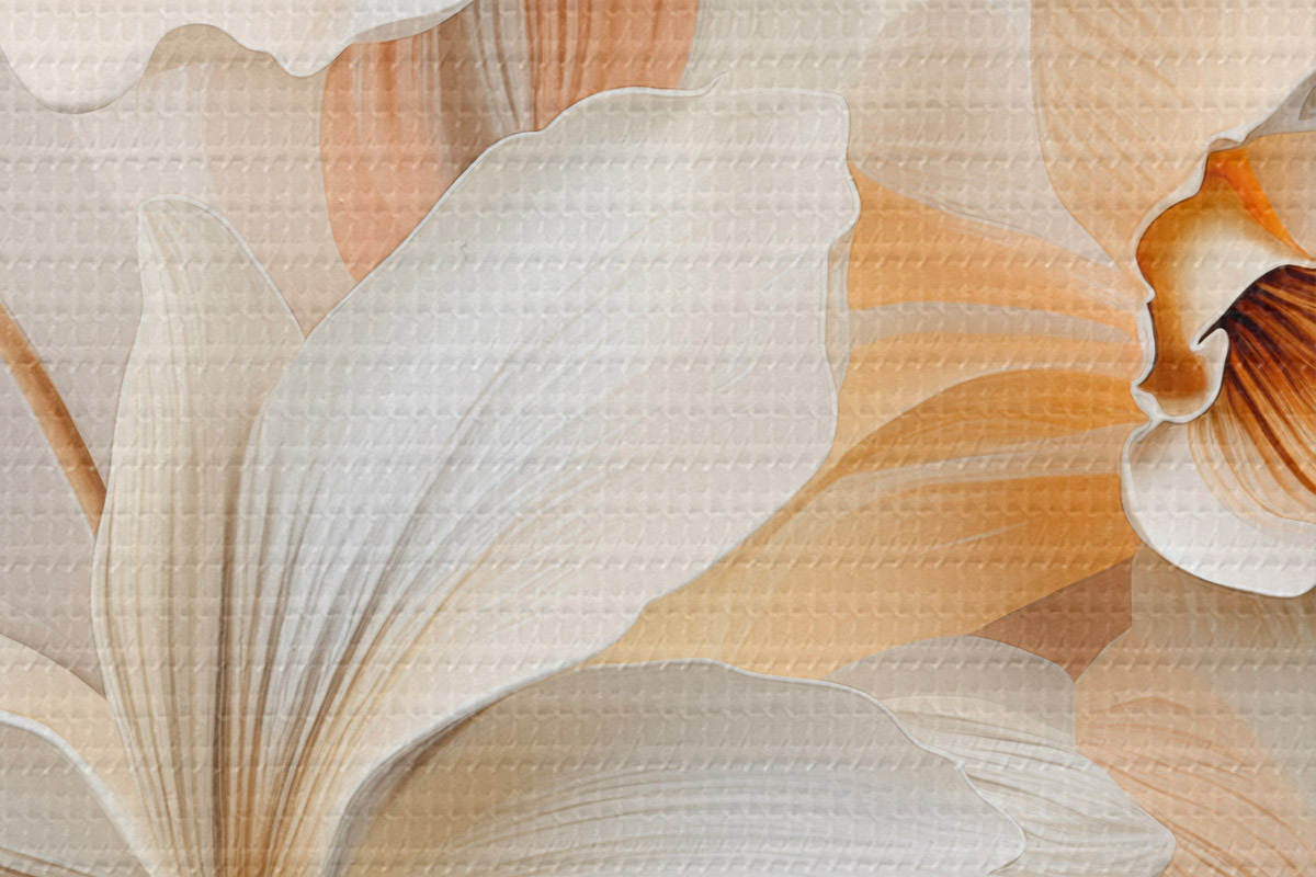 Attēls Baltas puķes, ziedlapiņas ar maigām ēnām, gaiši smilškrāsas fons, eleganta kompozīcija, minimālisma stils Nr r46699