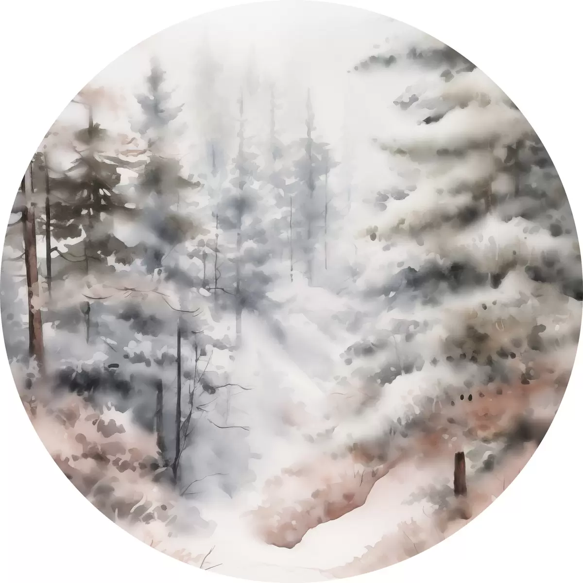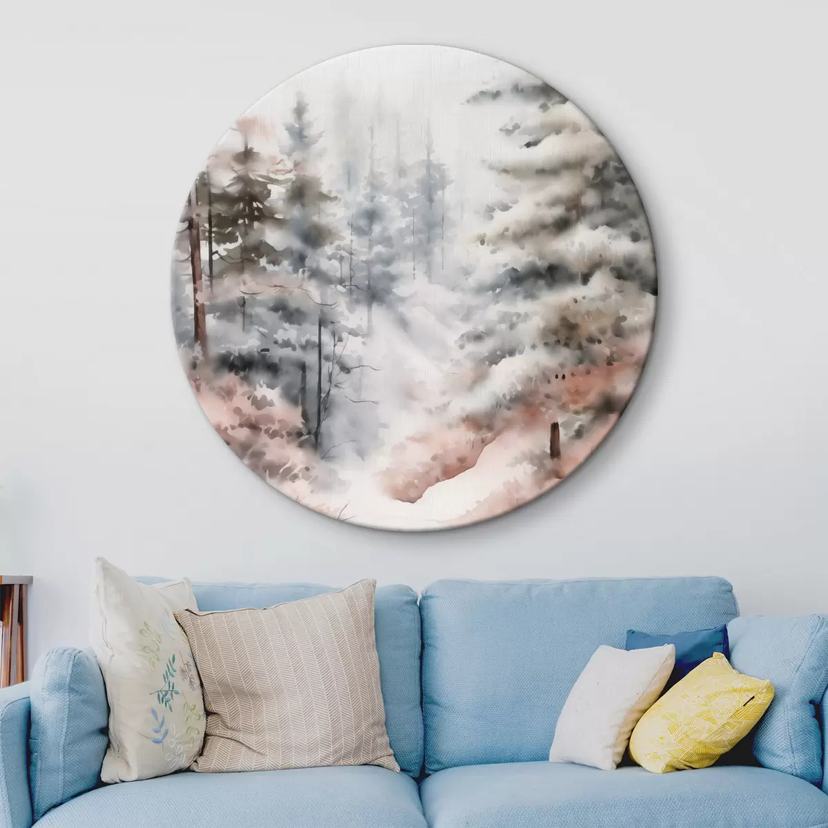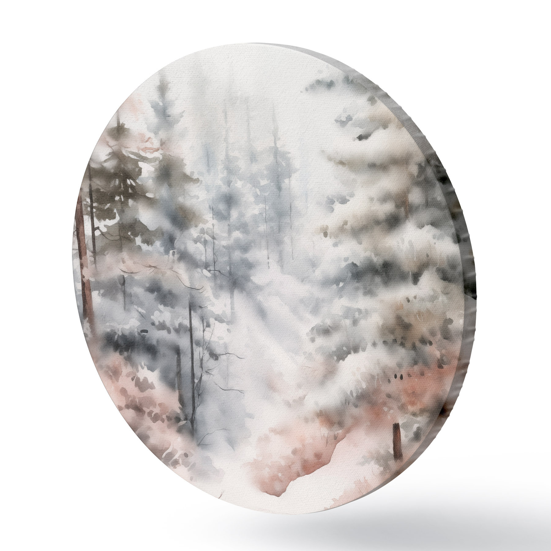 Apaļas gleznas Augstas, sniega klātas priedes, kas stāv miglas apņemtā mežā, maiga, klusa ziemas ainava r46702