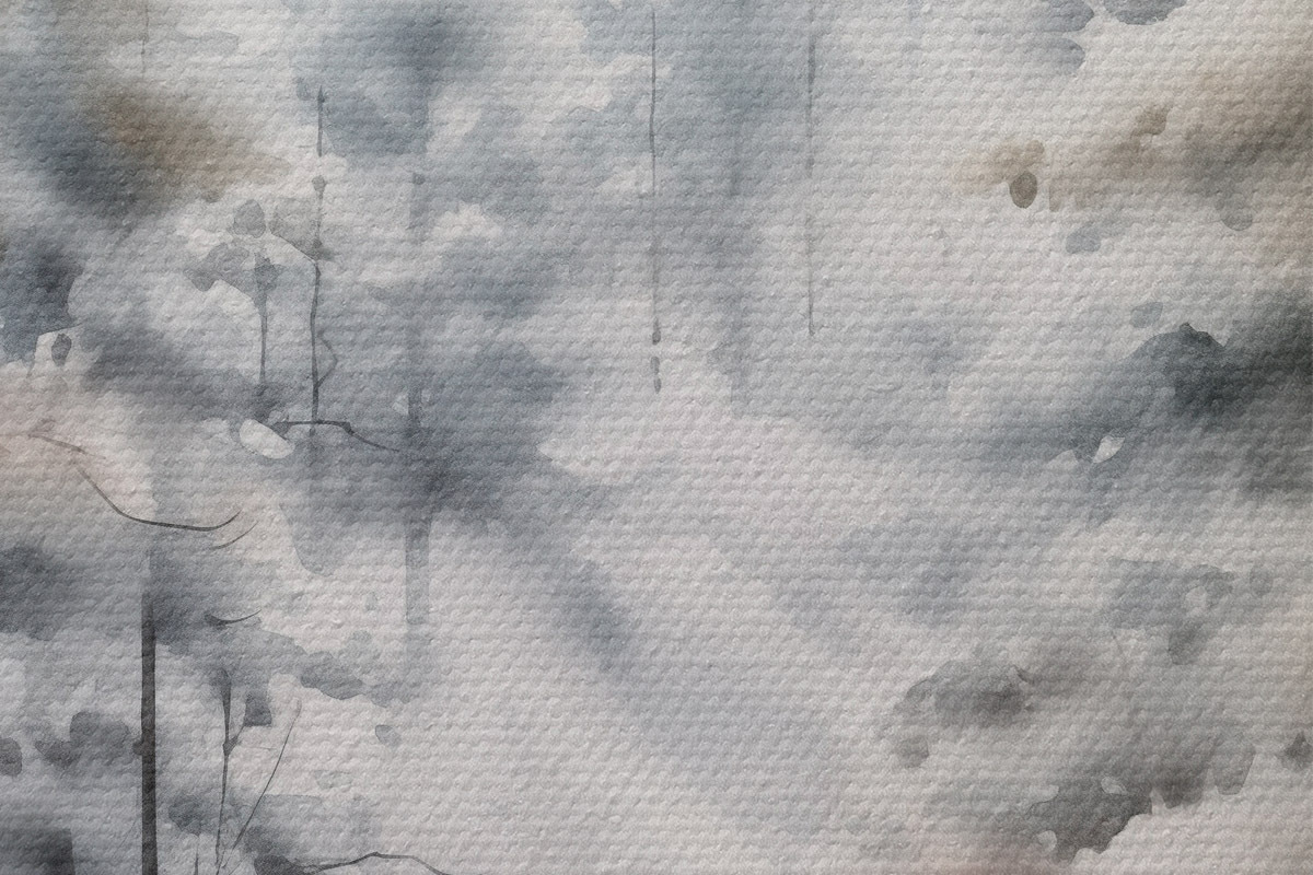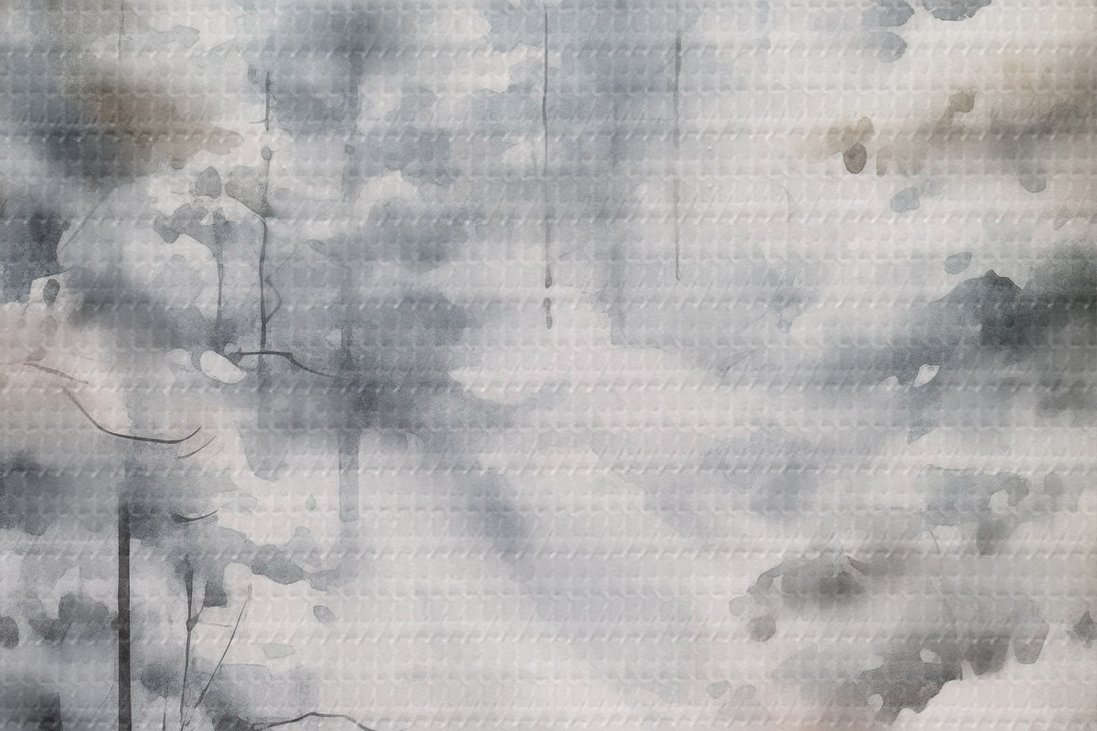 Attēls Augstas, sniega klātas priedes, kas stāv miglas apņemtā mežā, maiga, klusa ziemas ainava Nr r46702