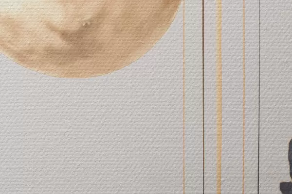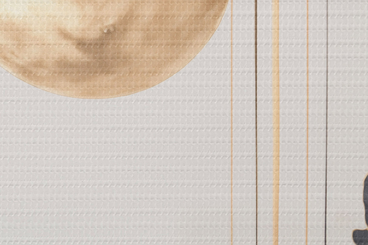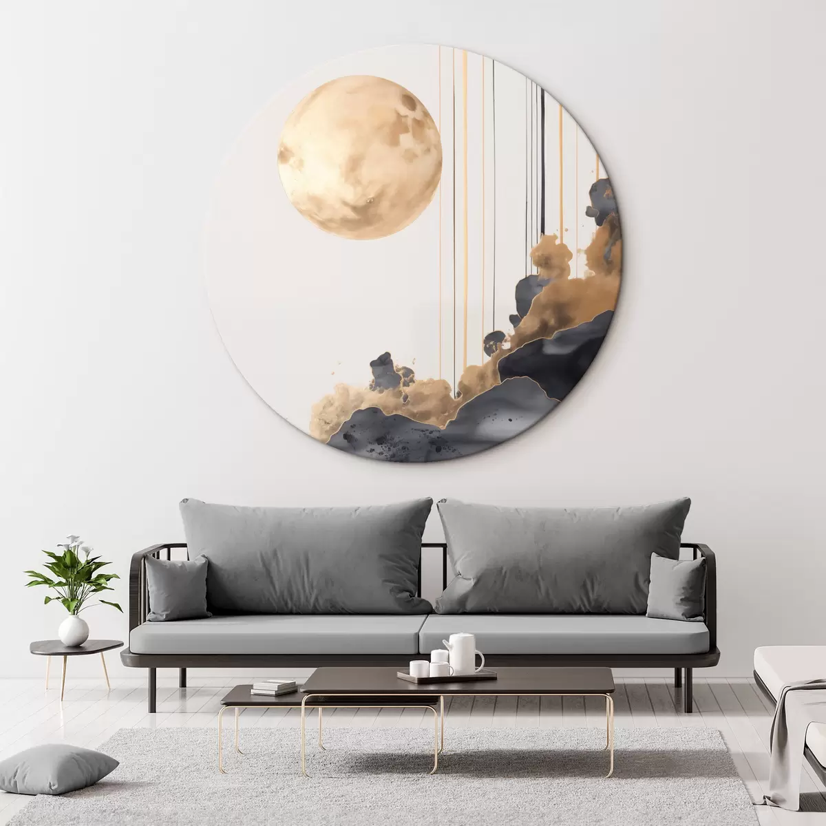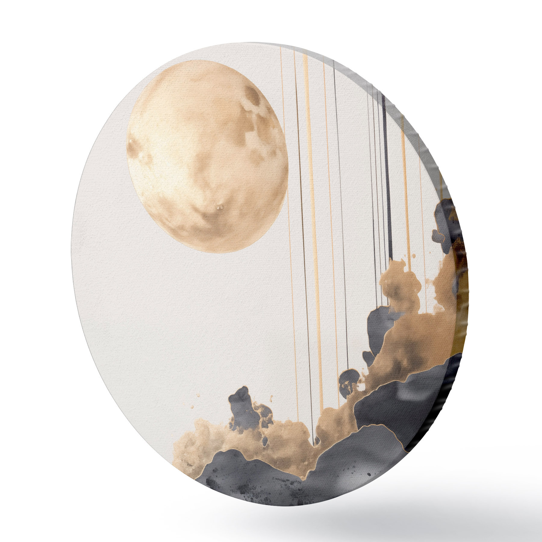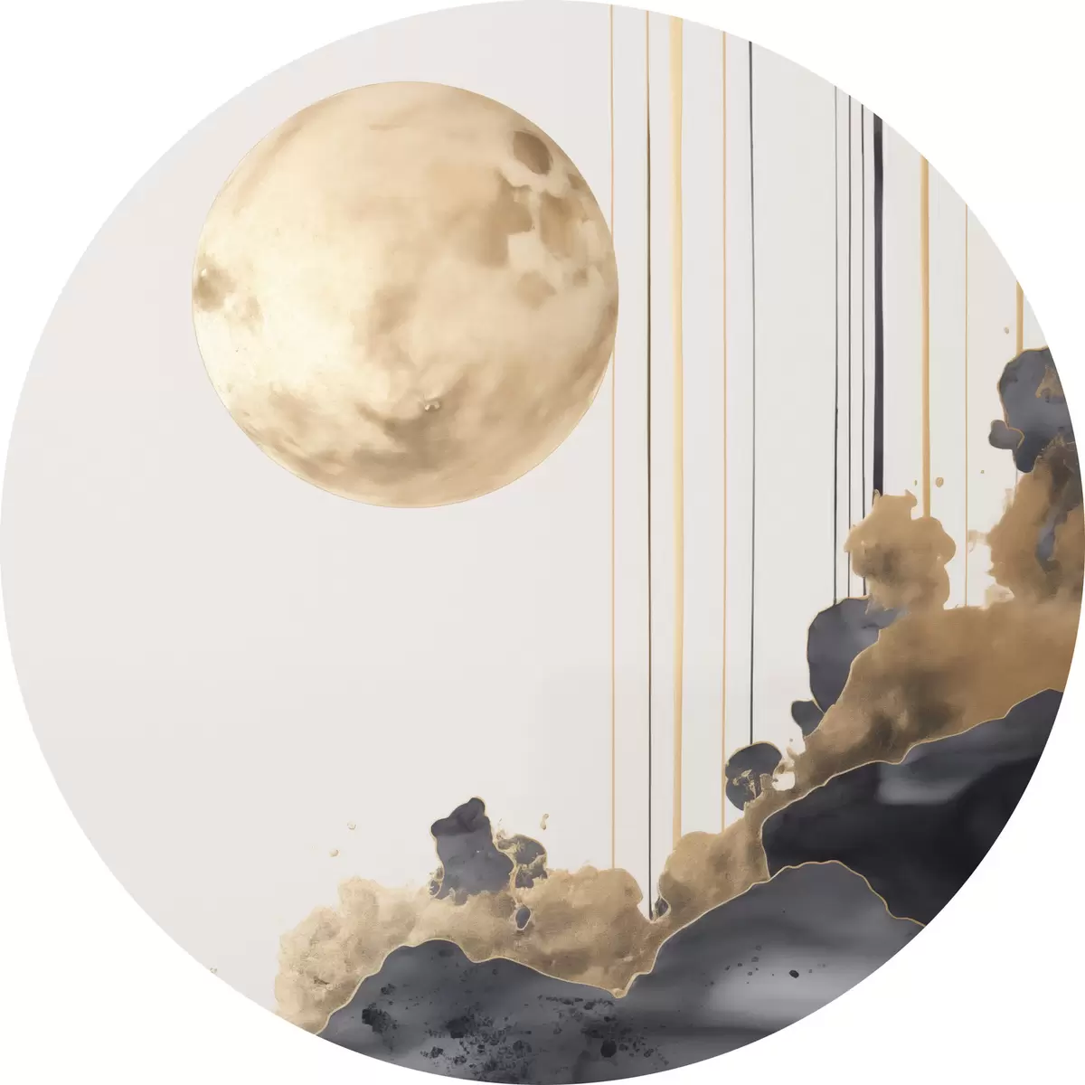 Apaļas gleznas Pilnmēness ar melniem un teksturētiem dzelteniem mākoņiem, vertikālām līnijām, abstraktā stilā, minimālistisks un moderns r46707