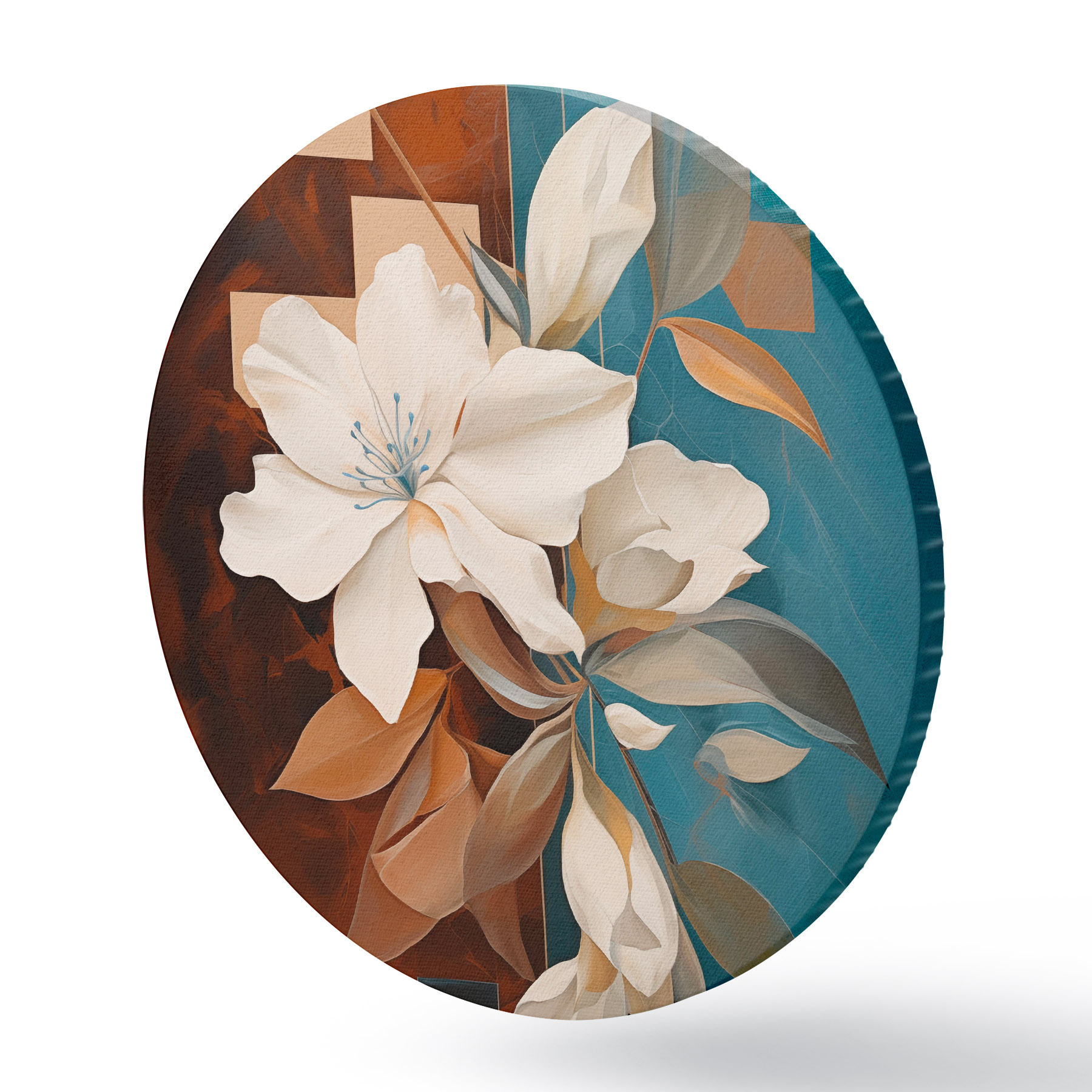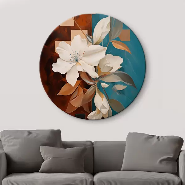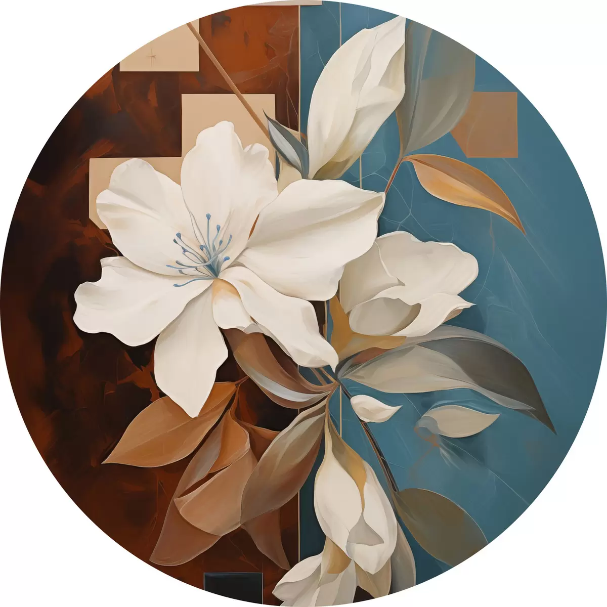 Apaļas gleznas Abstraktas baltas puķes un lapas uz brūna un zila fona ar abstraktām formām, minimālisma stilā r46709