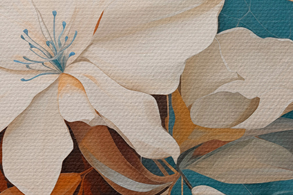 Attēls Abstraktas baltas puķes un lapas uz brūna un zila fona ar abstraktām formām, minimālisma stilā Nr r46709