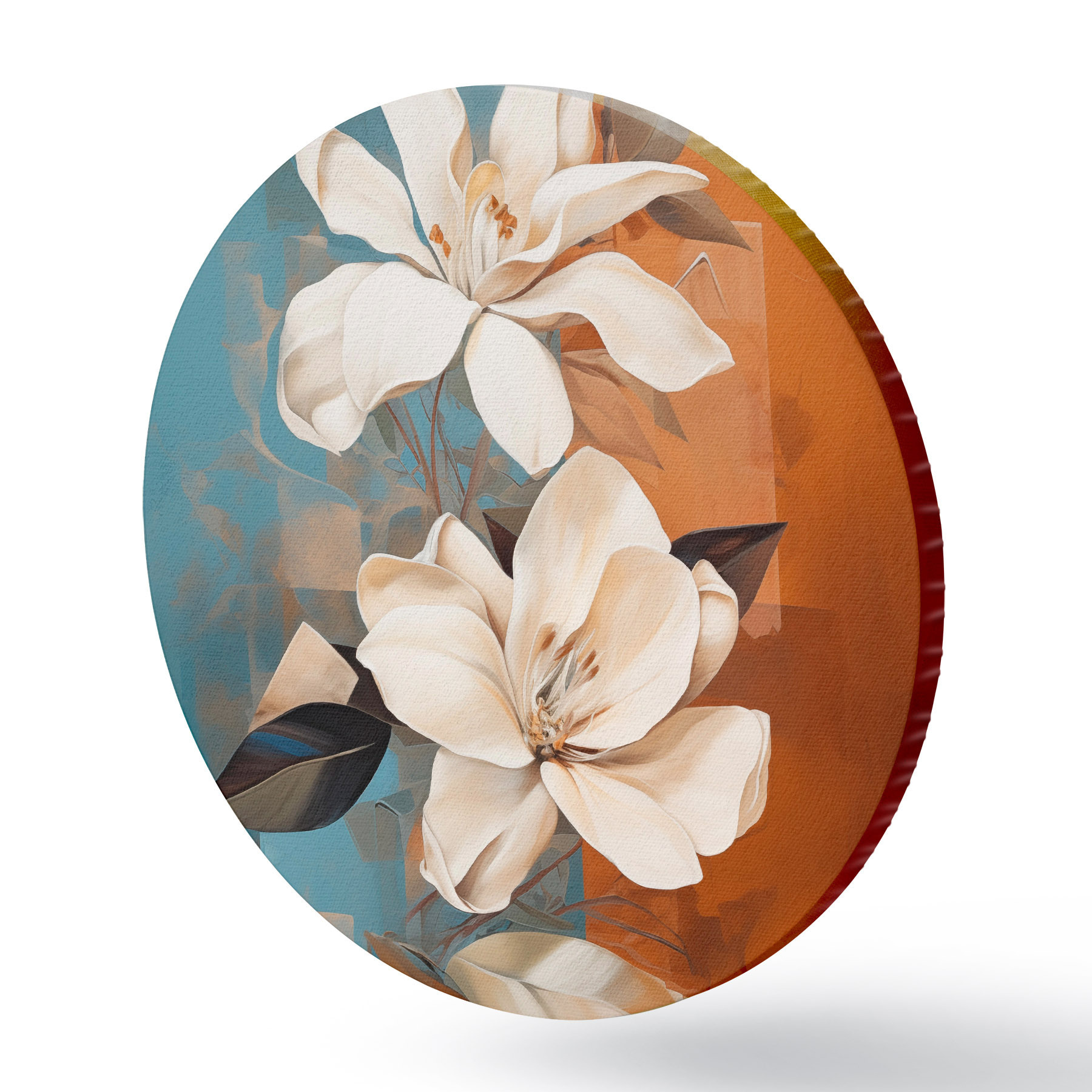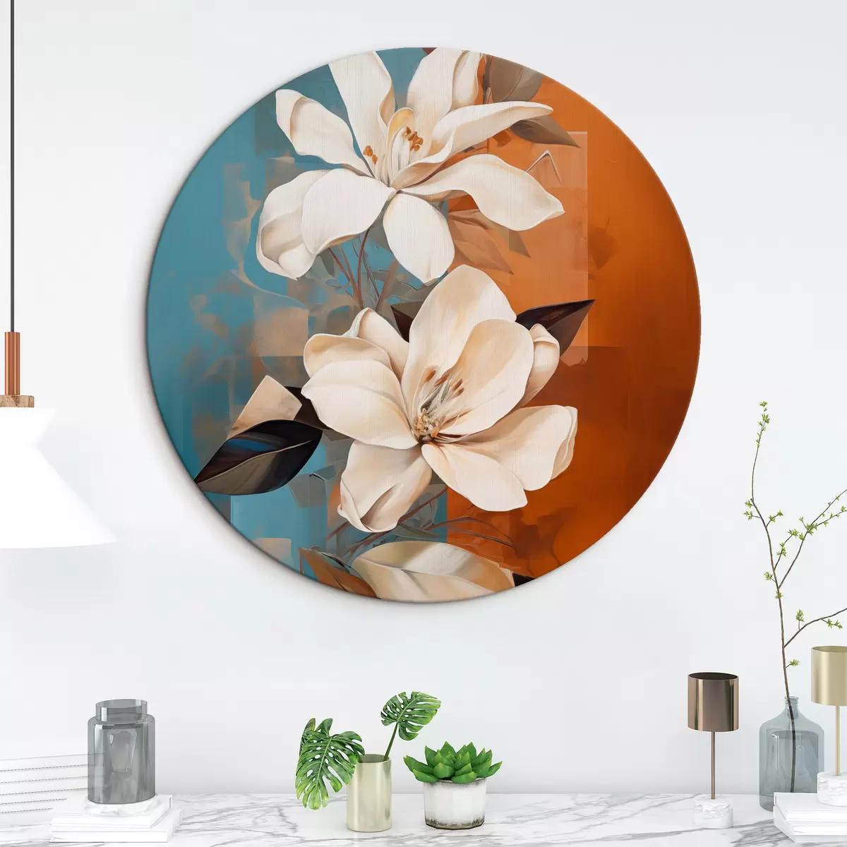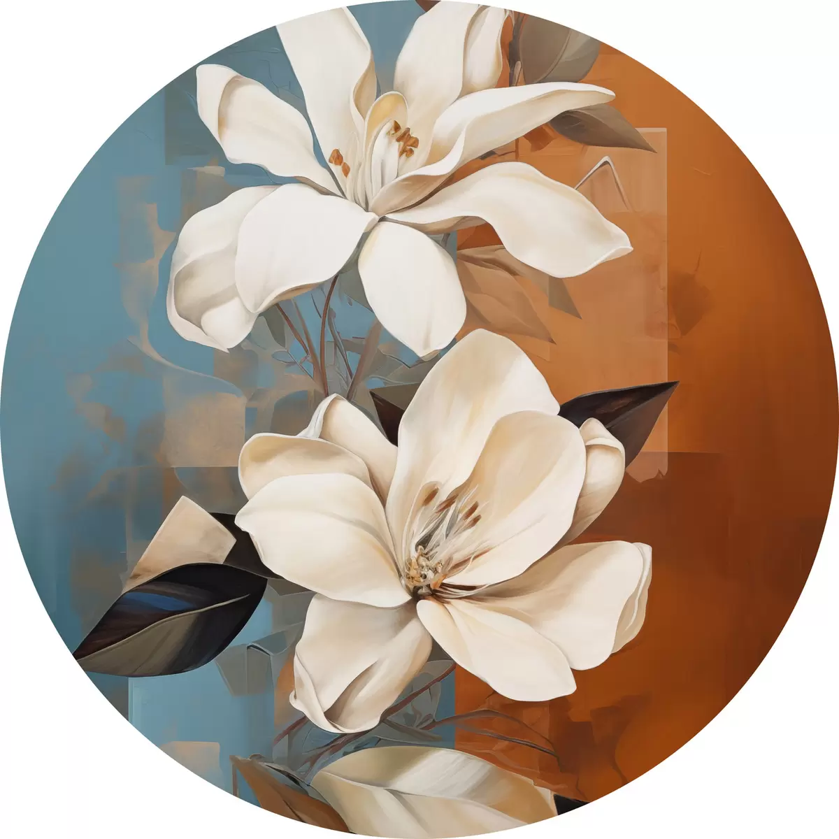 Apaļas gleznas Abstraktas baltas puķes un lapas uz brūna un zila fona ar abstraktām formām, minimālisma stilā r46710
