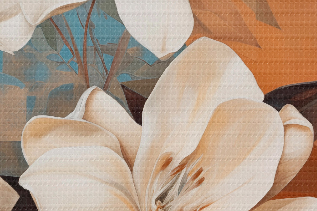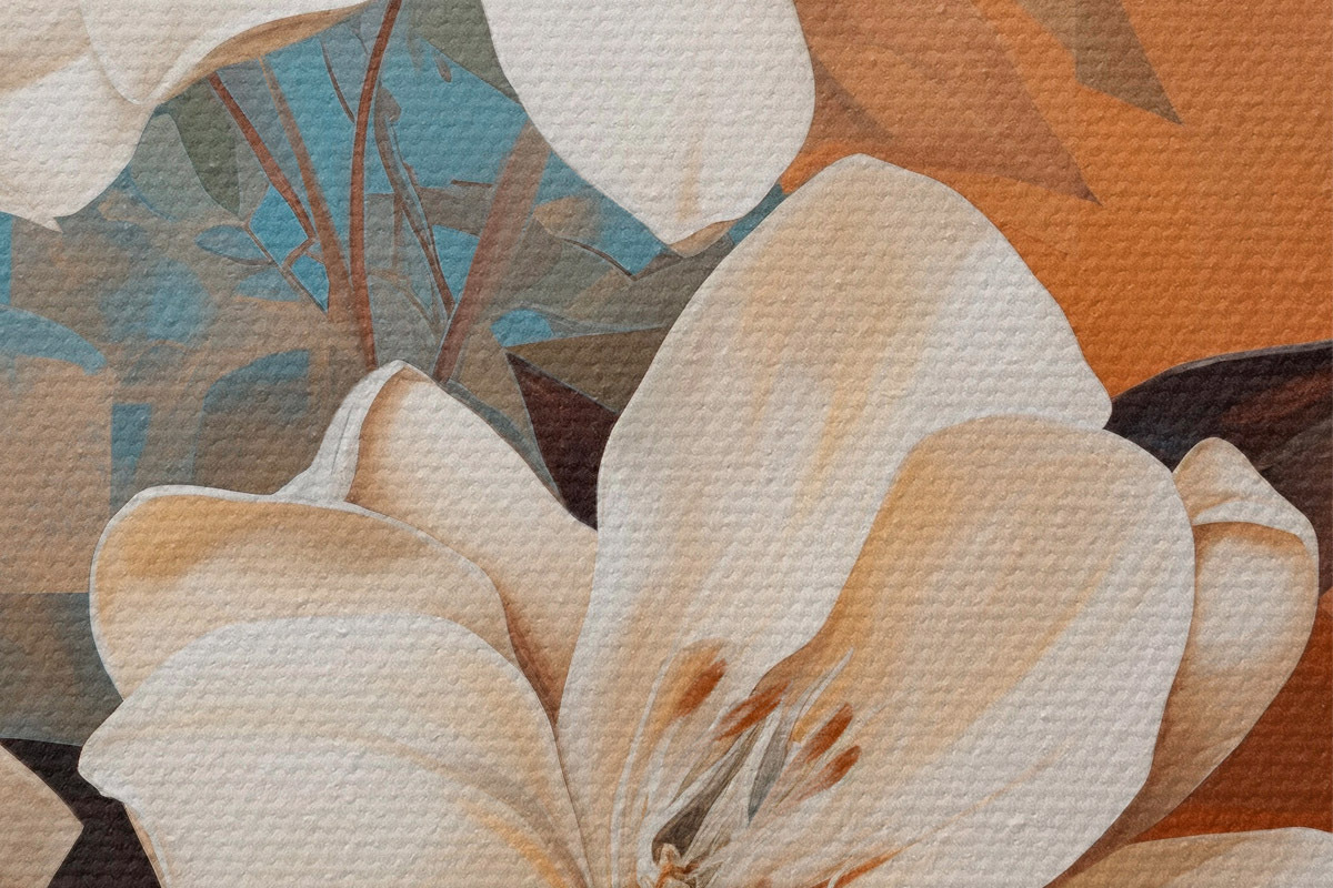 Attēls Abstraktas baltas puķes un lapas uz brūna un zila fona ar abstraktām formām, minimālisma stilā Nr r46710