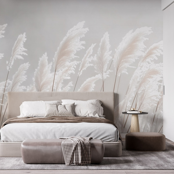 Teksturētas, mīkstas, baltas spalvas un izplūdušas pampas zāles ar zilu un baltu fonu