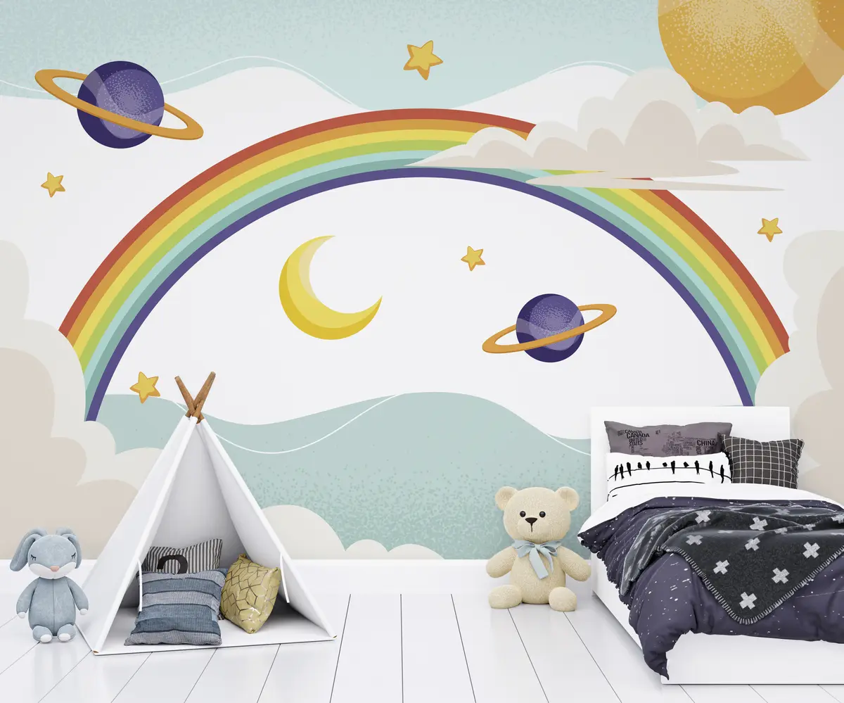 Fototapetes Varavīksne mākoņos, planētas, zvaigznes Nr. u94327
