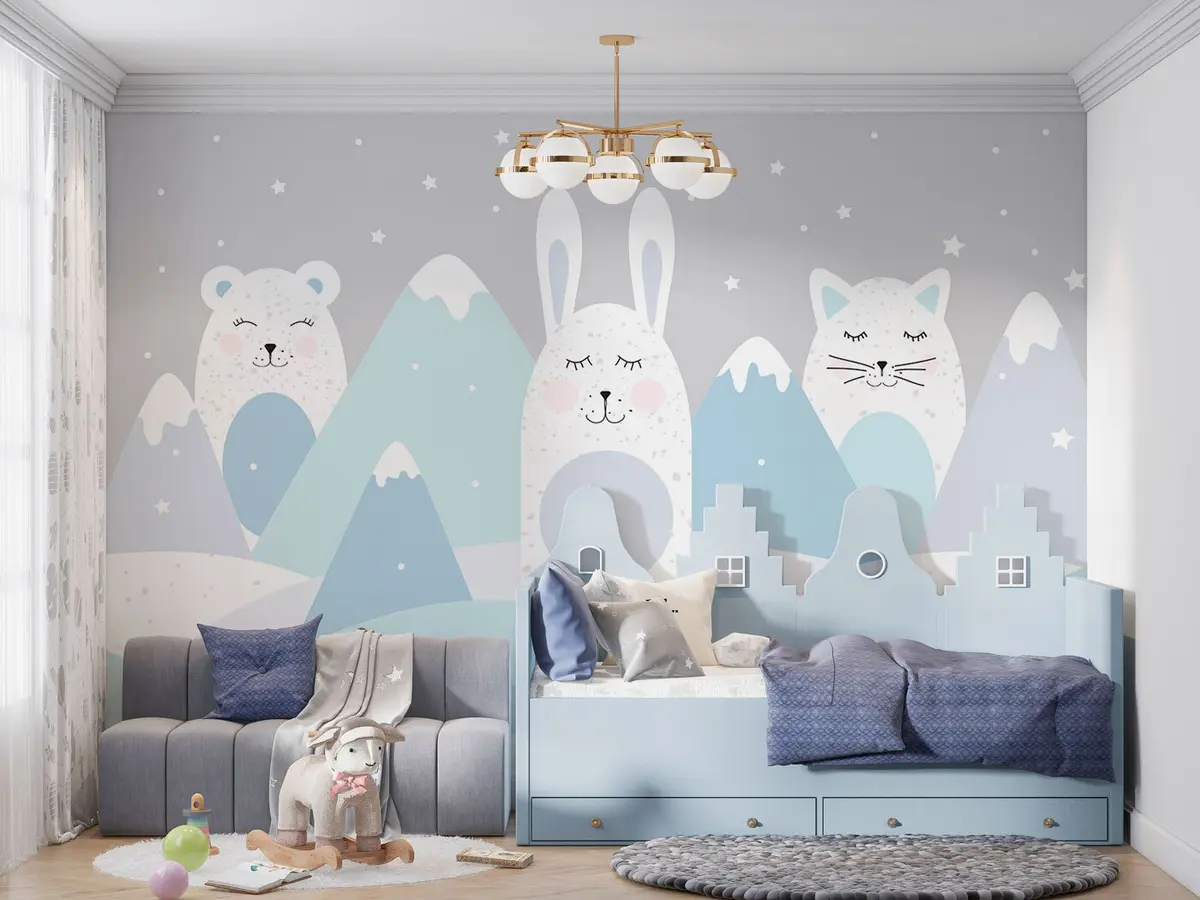 Fototapetes Zaķis, lācis, lapsa uz bēša sniegotu kalnu fona Nr. u98135v1