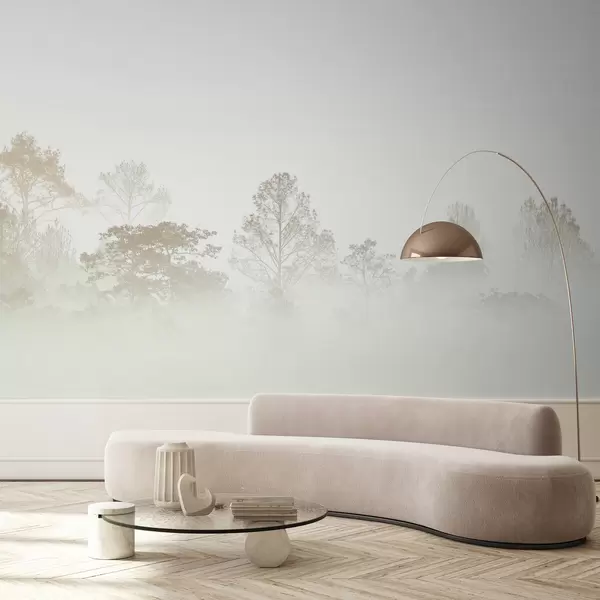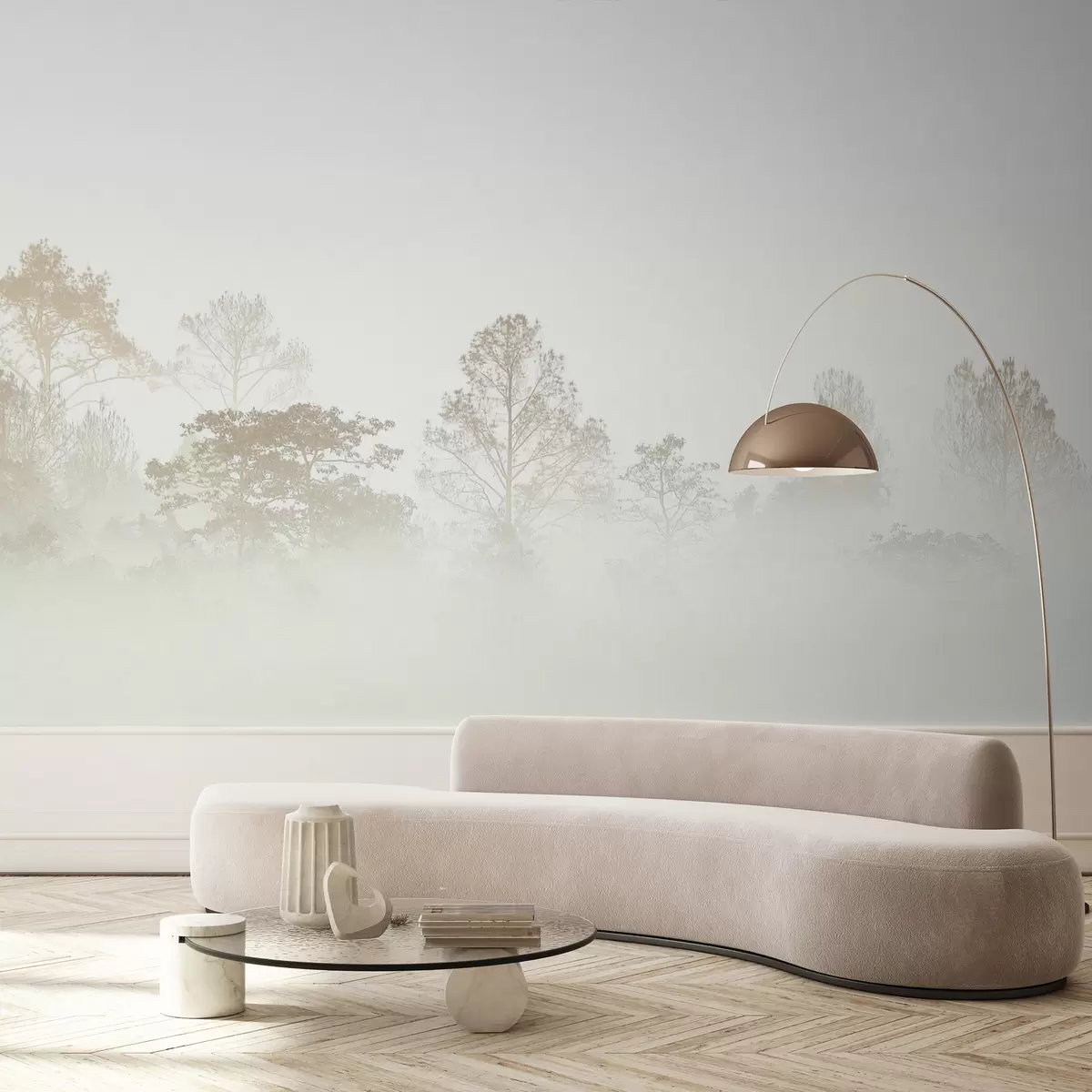 Fototapetes Koku birzs siluets biezā baltā rīta miglā Nr. u97405