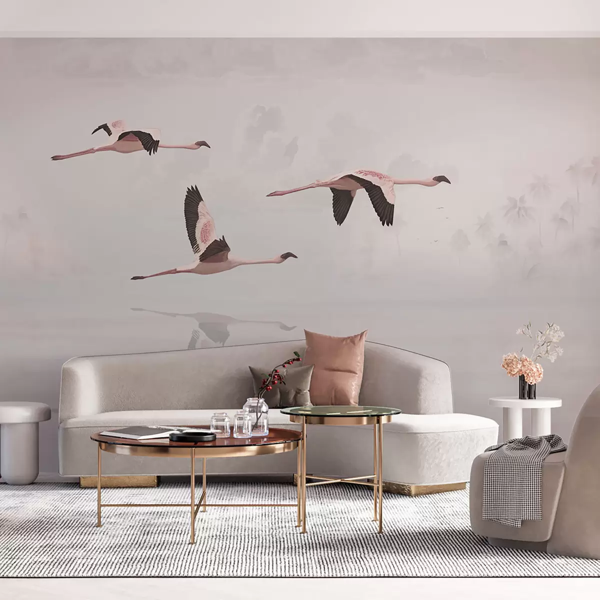 Fototapetes Rozā flamingi virs tropisko džungļu pludmales un jūras Nr. u97457